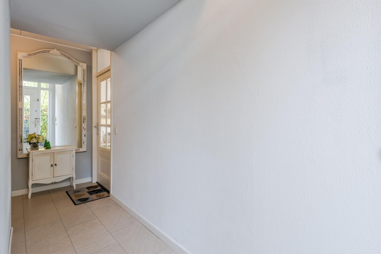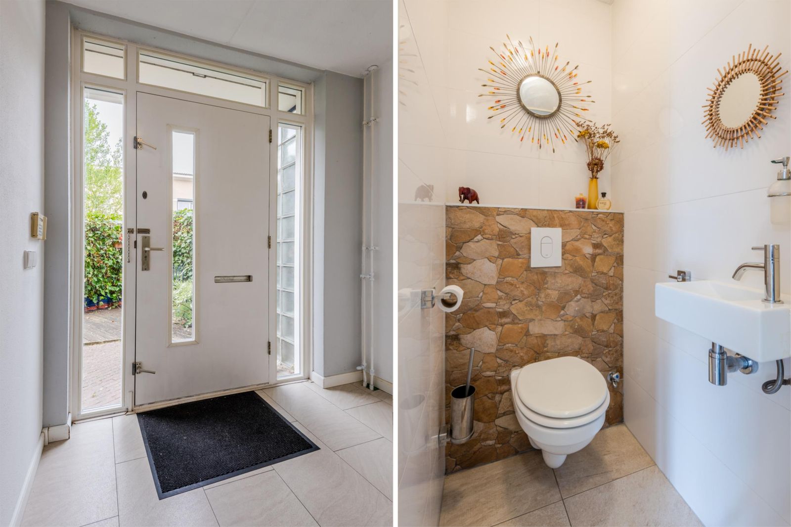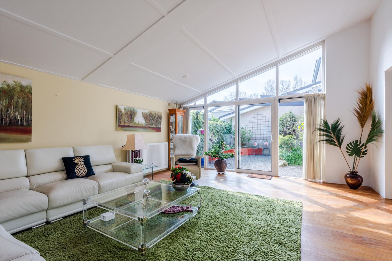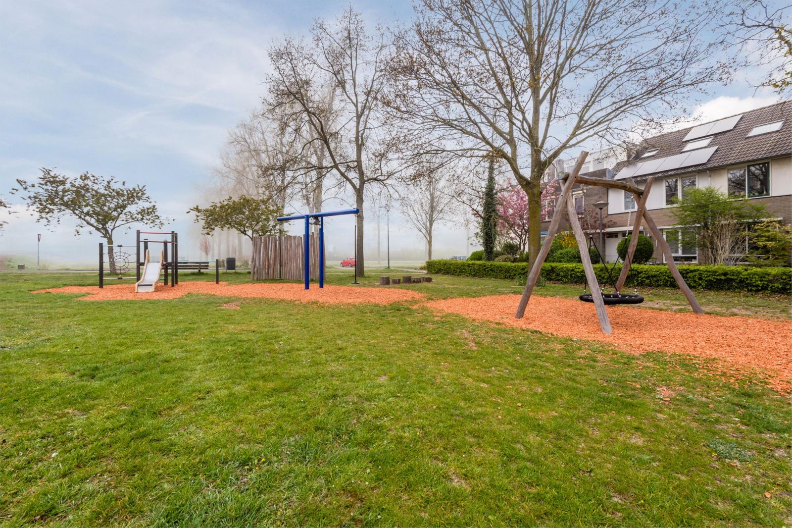 Voortuin met entree tot de woning. Hal is voorzien van een meterkast en geeft toegang tot de toiletruimte en de woonkamer. In de hal is ook de trapopgang naar de 1e verdieping. Het toilet is voorzien van een zwevend toilet, een fontein en tegelwerk tot aan het plafond. De grote woonkamer van meer dan 30 m2, kenmerkt zich door een schuine en hoog plafond en grote ramen die voor veel natuurlijk licht zorgen. Je hebt vanuit de woonkamer fraai zicht op de achtertuin (patio). Een schuifpui geeft vanuit de woonkamer toegang tot deze zonnige patio waar je heerlijk vrij kan zitten en kinderen beschermd kunnen spelen. Aan de voorzijde van de woning bevindt zich de keuken. Deze beschikt over inbouwapparatuur waaronder: 4-pits inductiekookplaat, vaatwasser, oven en afzuigkap. De schuur bevat een garage deel met kanteldeur en een werk/hobby-ruimte waar ook de aansluitingen voor een wasmachine aanwezig zijn. Beide ruimtes zijn vanuit de patio en de voortuin bereikbaar.