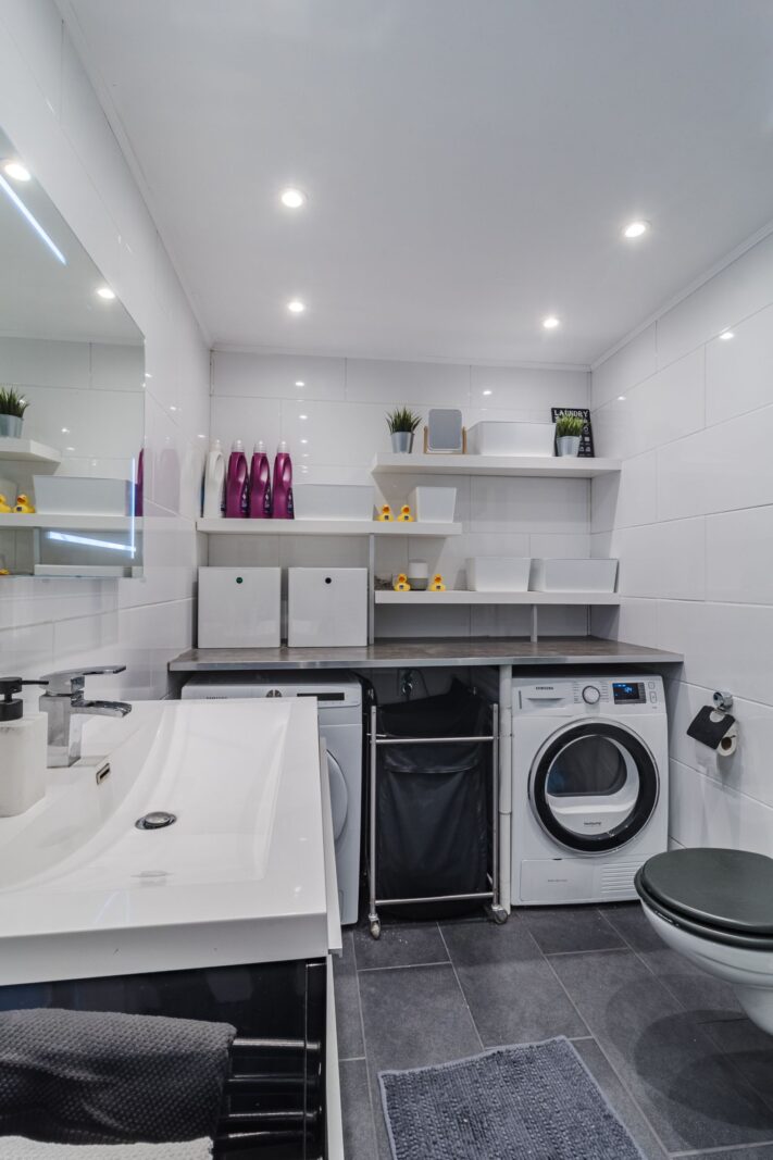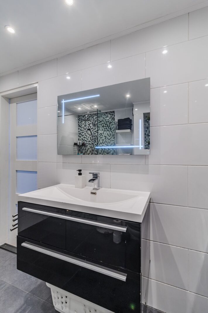 De vergrote, licht betegelde badkamer (ca. 3.10 x 2.15) is compleet uitgevoerd met een inloopdouche, wastafelmeubel, toilet, handdoekradiator en aansluiting voor de wasmachine.