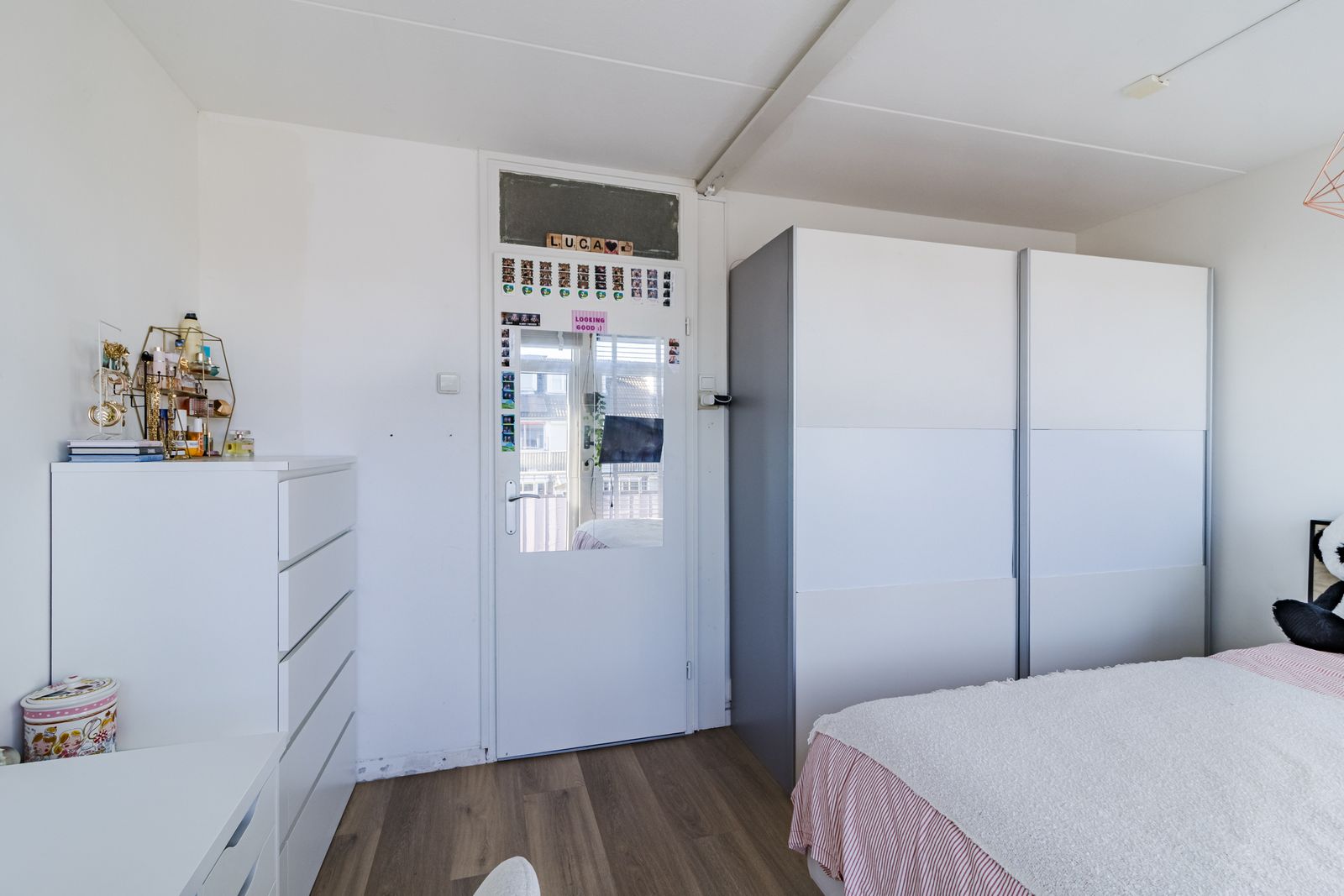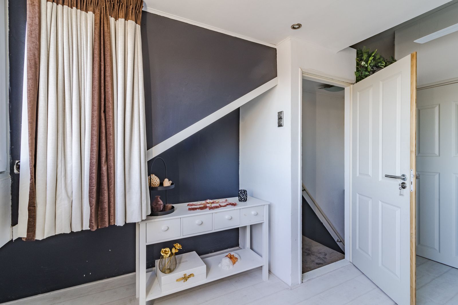 Overloop met trapopgang naar de tweede verdieping. Aan de voorzijde bevindt zich een royale, gevelbrede slaapkamer. Aan de achterzijde ligt eveneens een ruime slaapkamer over de volle breedte van de woning, met openslaande deuren naar het balkon (ca. 5.00 x 1.00).