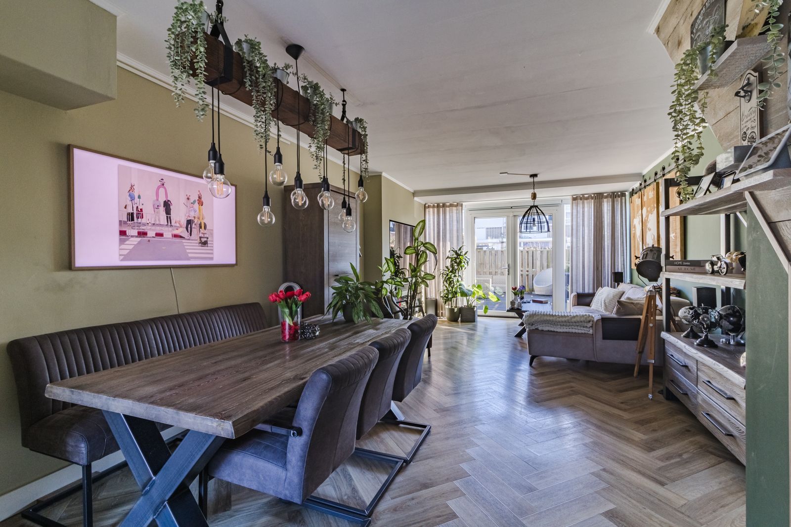 De ruime en lichte woonkamer (ca. 8.80 x 4.10) is voorzien van een pvc vloer en beschikt over openslaande deuren naar de achtertuin. Dankzij de grote raampartijen is dit een heerlijke leefruimte met veel lichtinval. De moderne open keuken is uitgevoerd in een praktische hoekopstelling en voorzien van diverse inbouwapparatuur, waaronder een 5-pits gaskookplaat, vaatwasser, afzuigkap en oven.