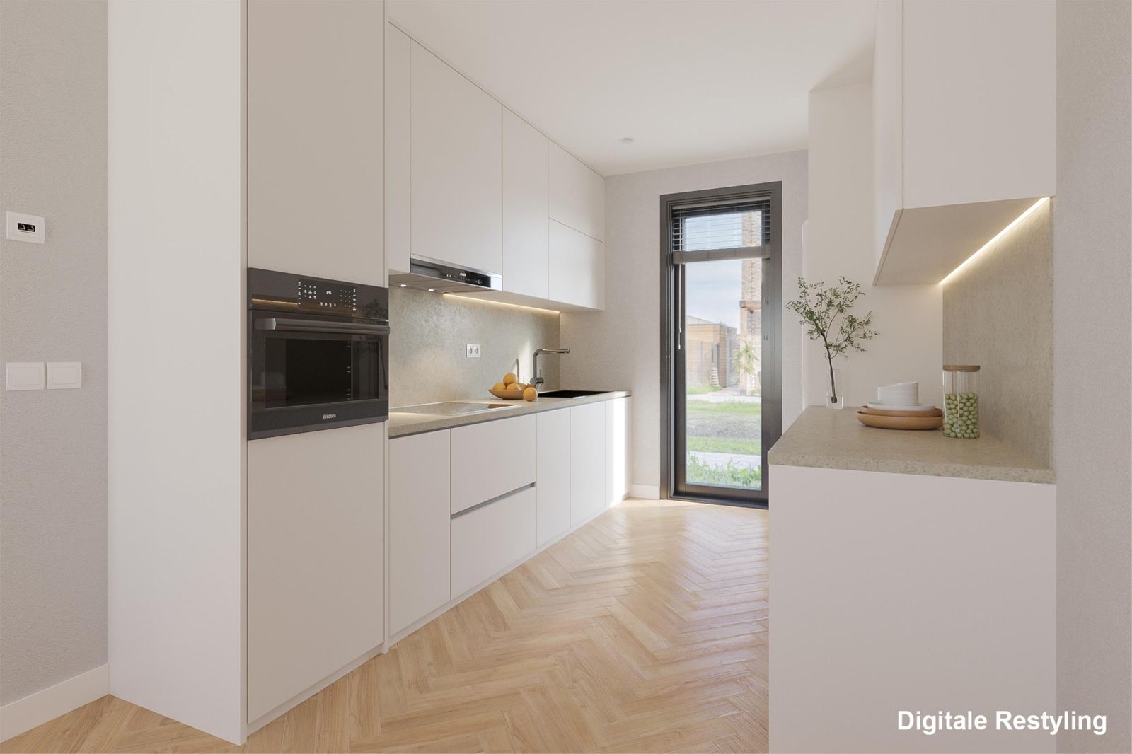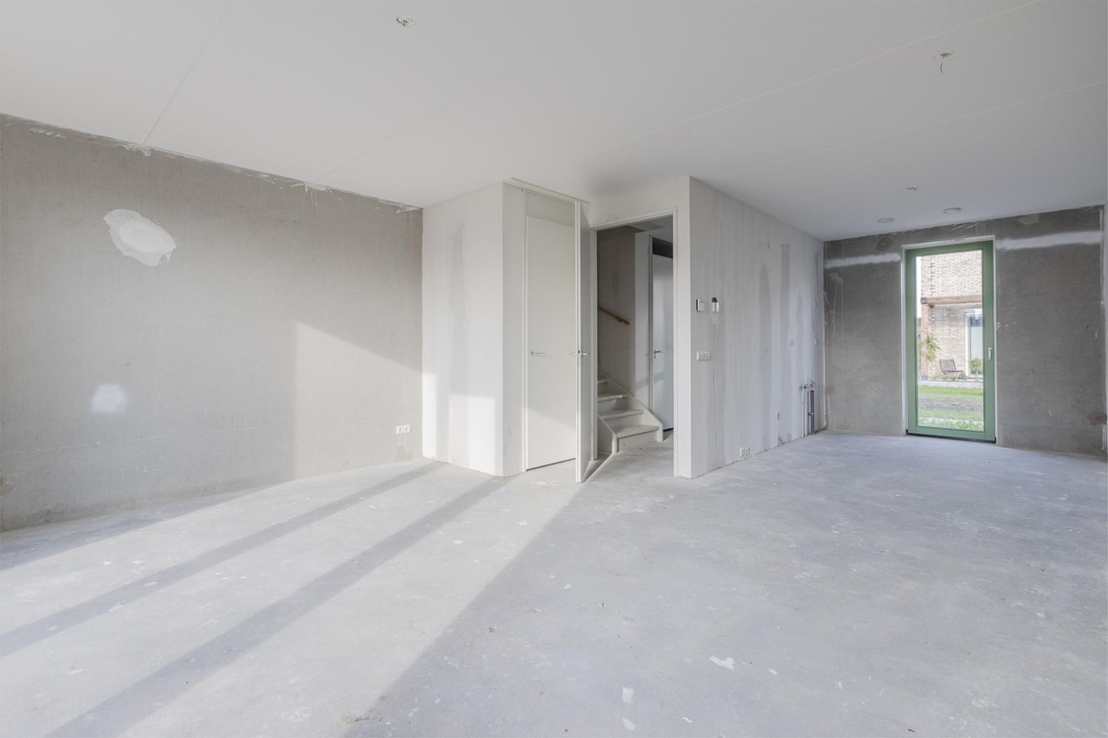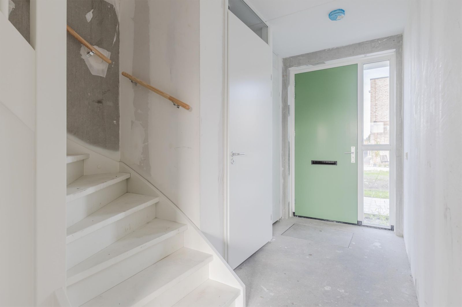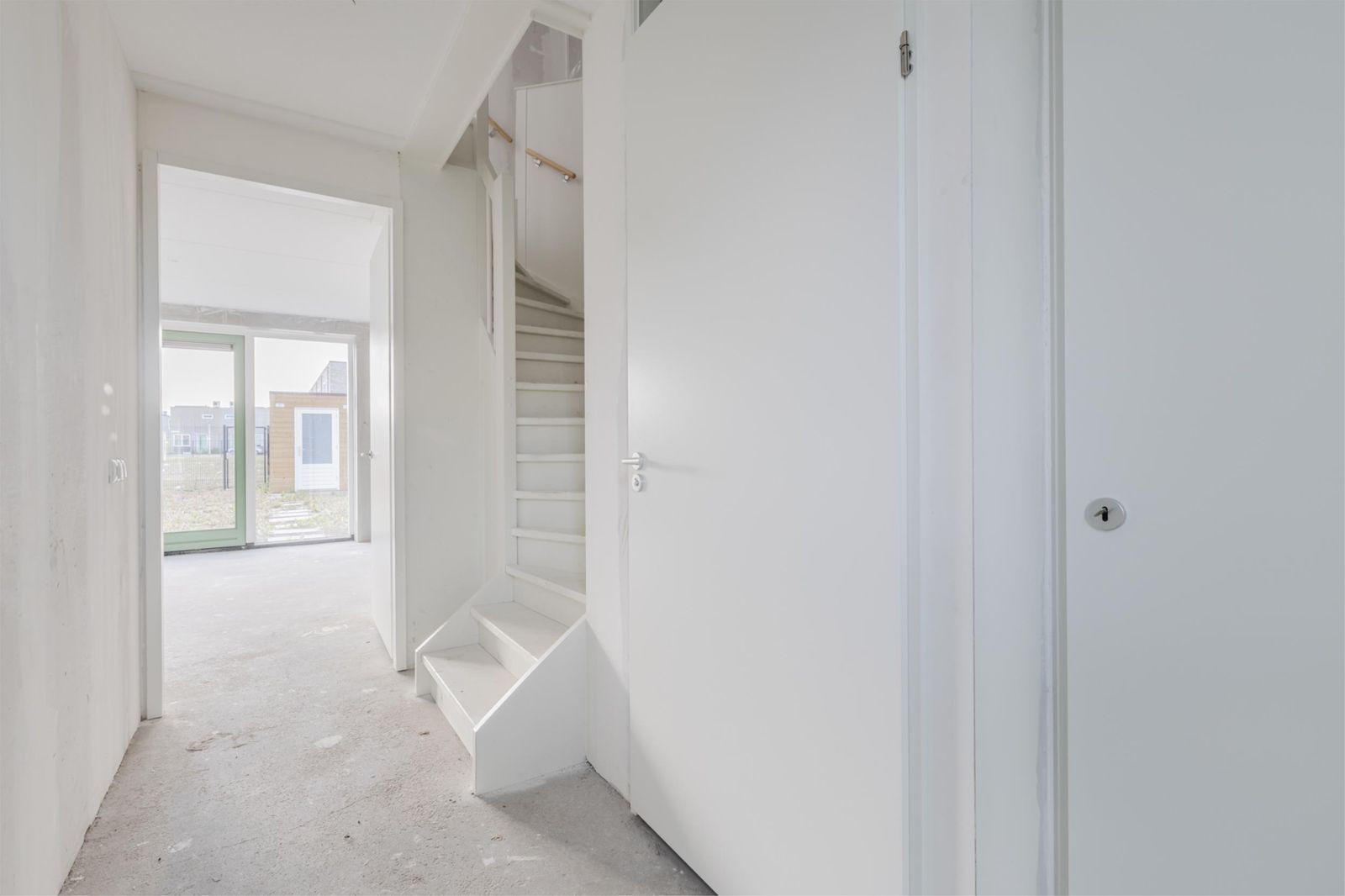 Entree, hal met meterkast, toilet , trapopgang naar de verdieping en toegang tot de woonkamer met open keuken. De open keuken is aan de voorzijde van de woning. De woonkamer is tuingericht en voorzien van openslaande deuren naar de tuin.