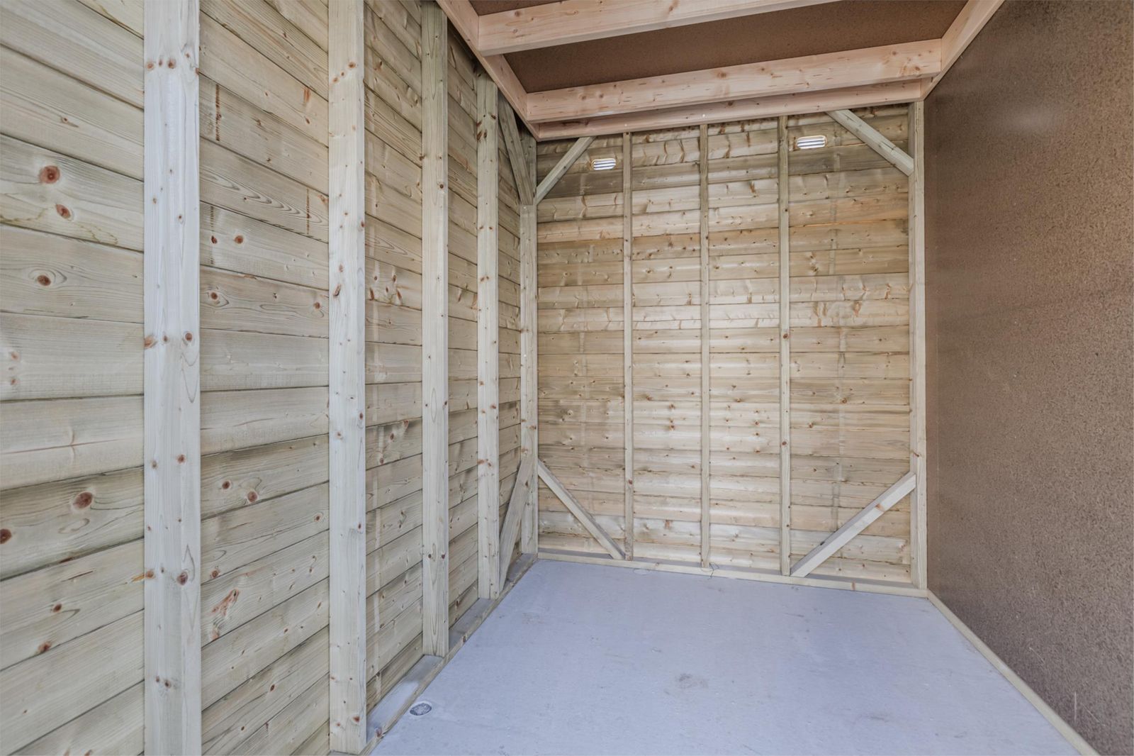Diepe zonnige achtertuin op het zuidoosten met een houten berging en schutting (deze wordt nog geplaatst).