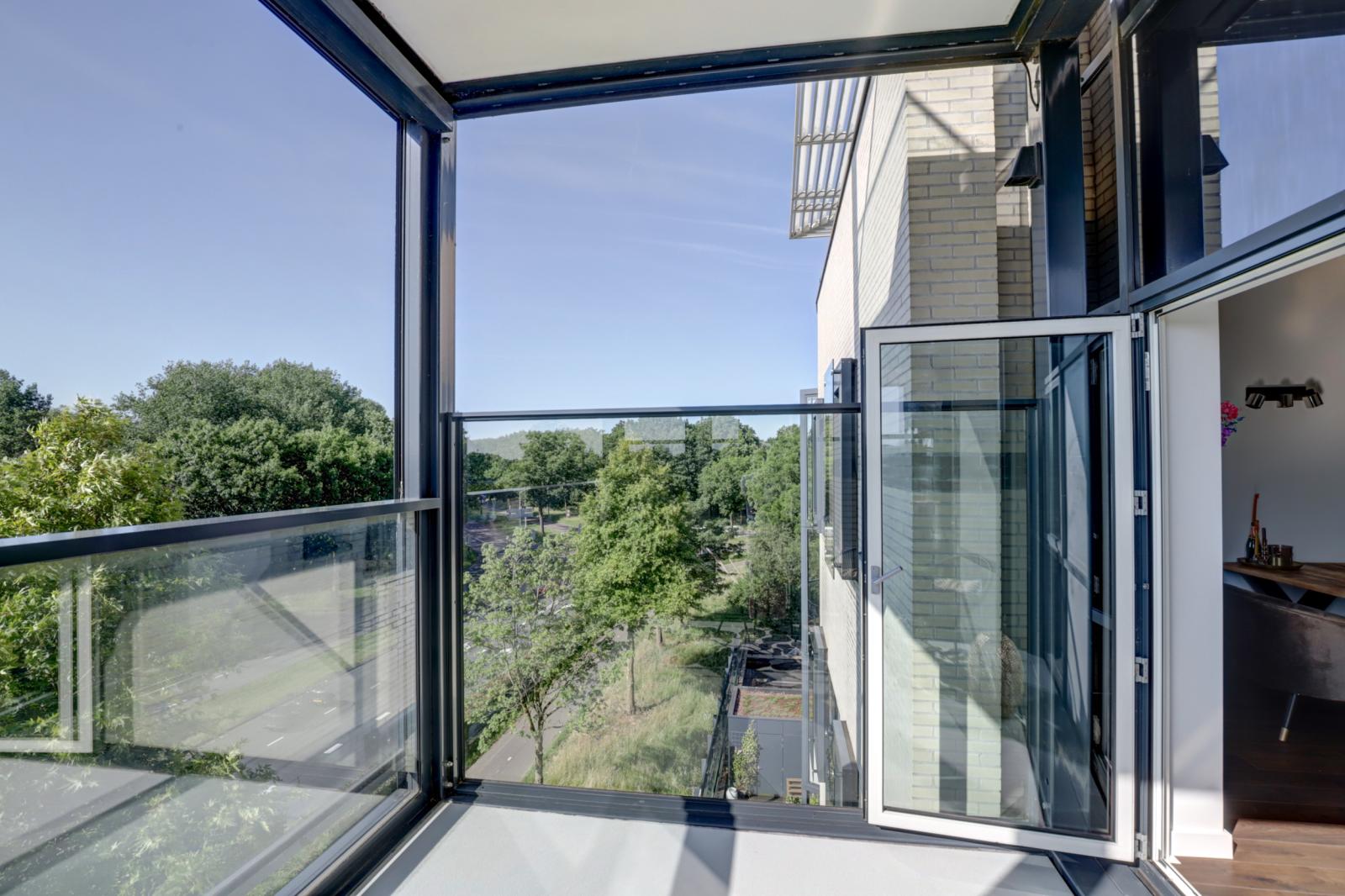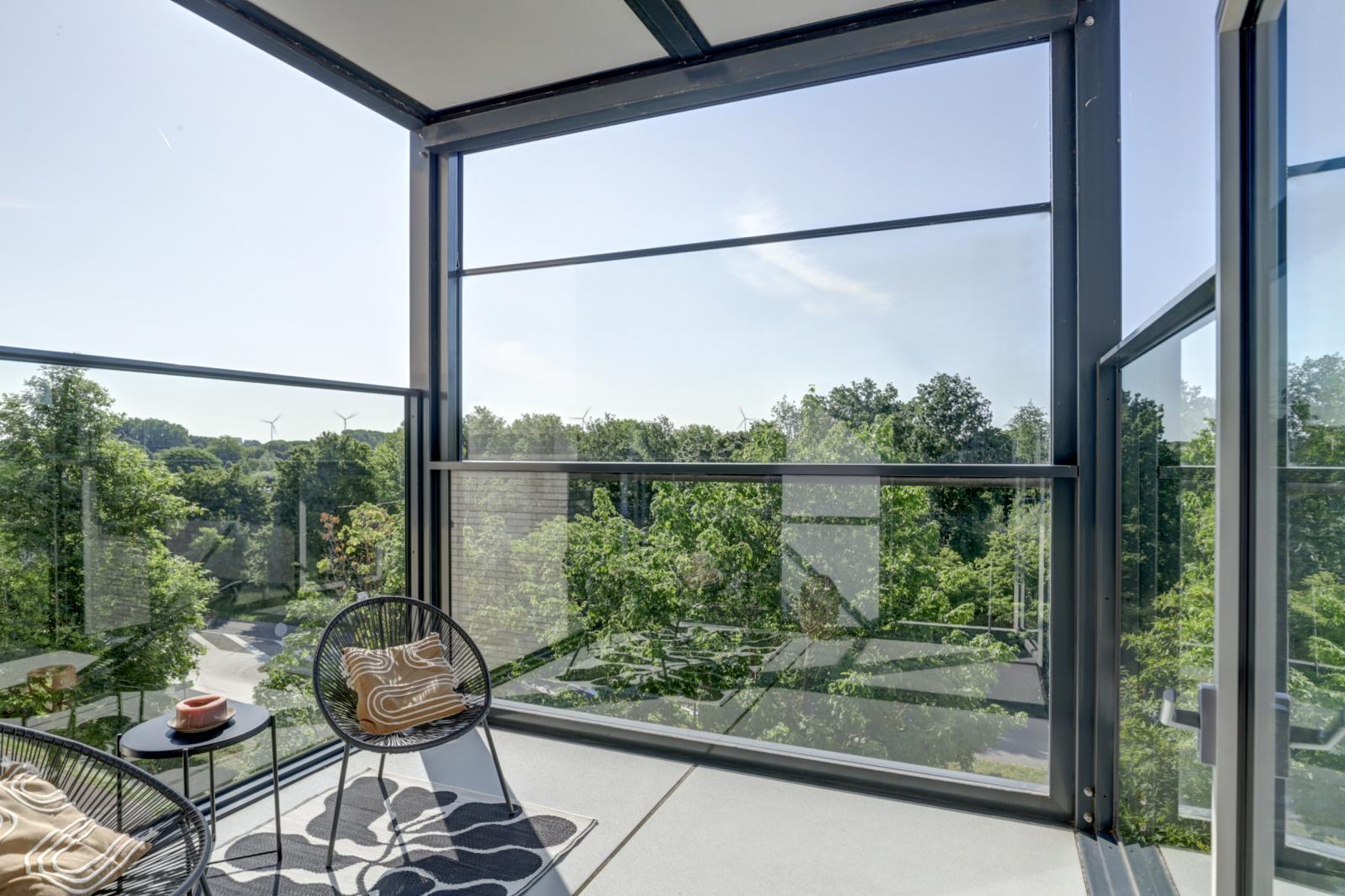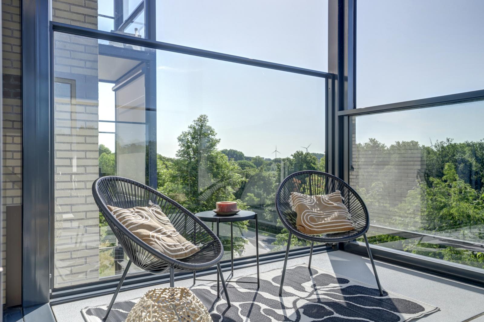 Via de woonkamer kom je op het balkon van 9 m², gelegen op het zuidoosten. Dankzij het in hoogte verstelbare raam kun je hier al vroeg in het jaar van de zon genieten.