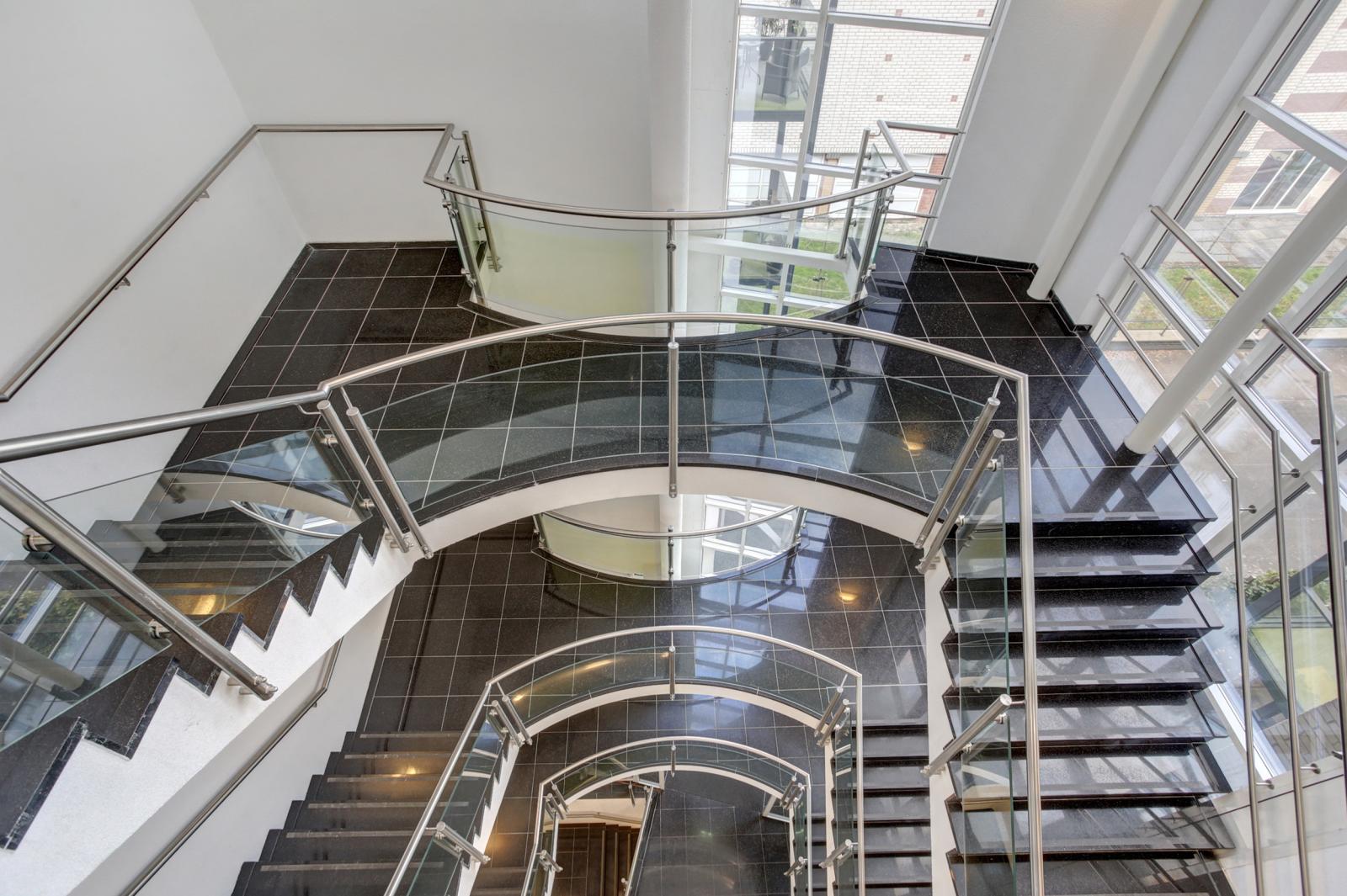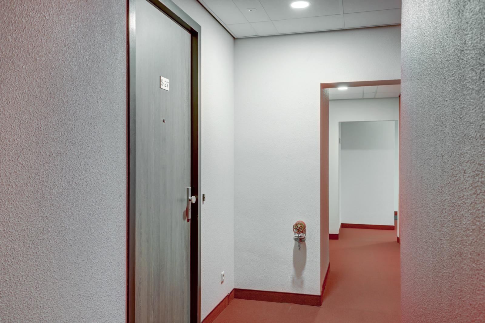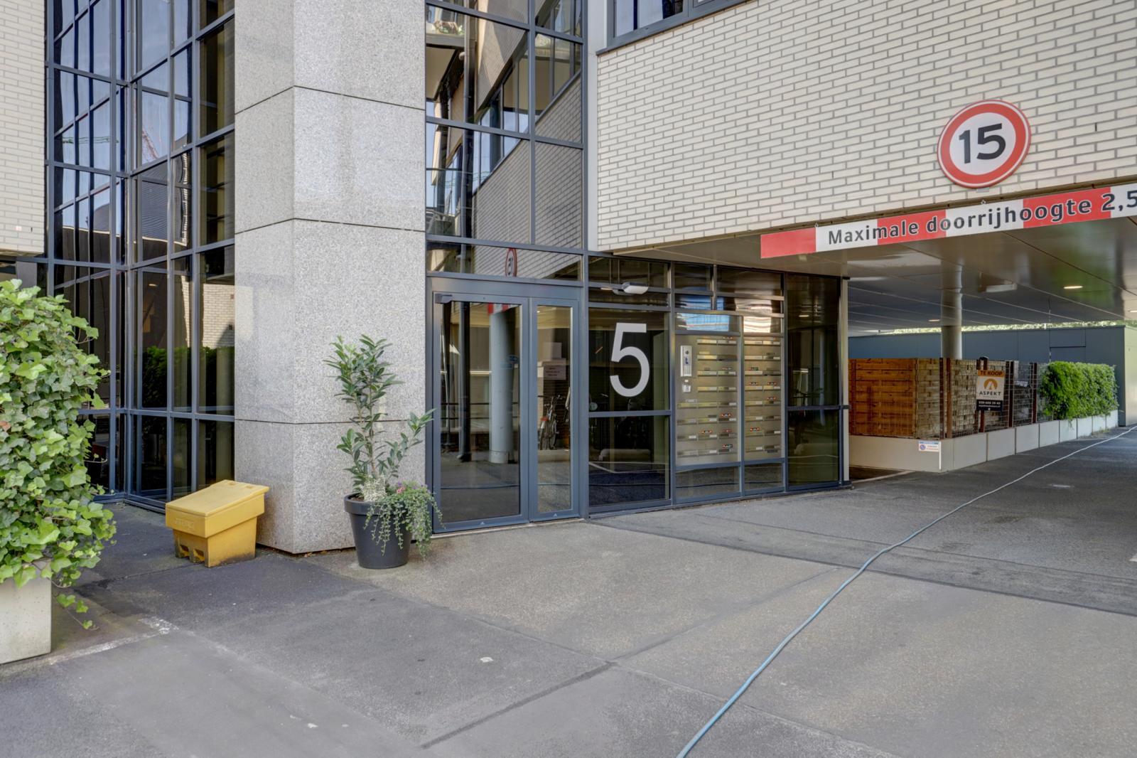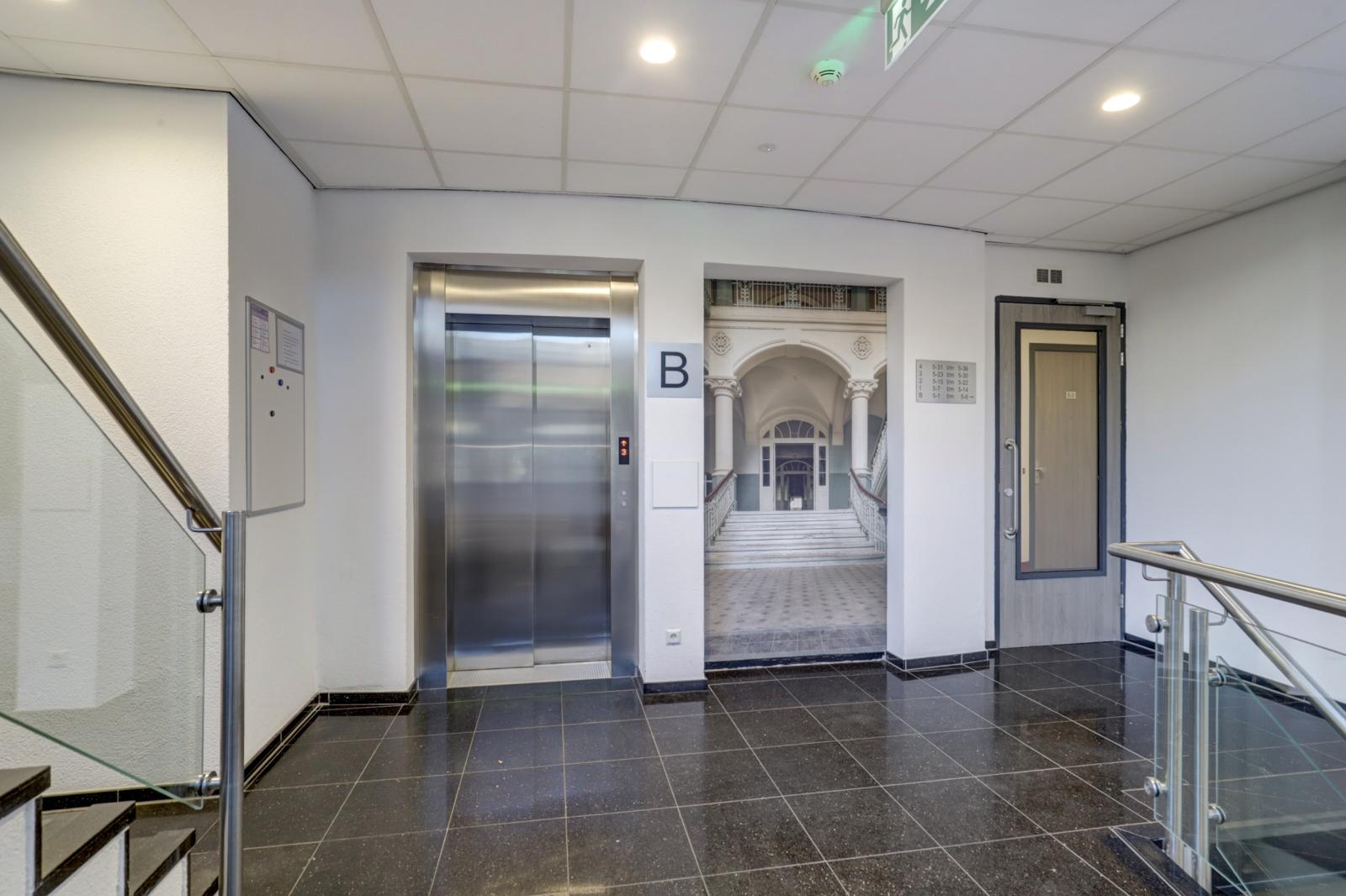 Afgesloten entree met bellenplateau, brievenbussen, ruime centrale hal met trappenhuis en een liftinstallatie.