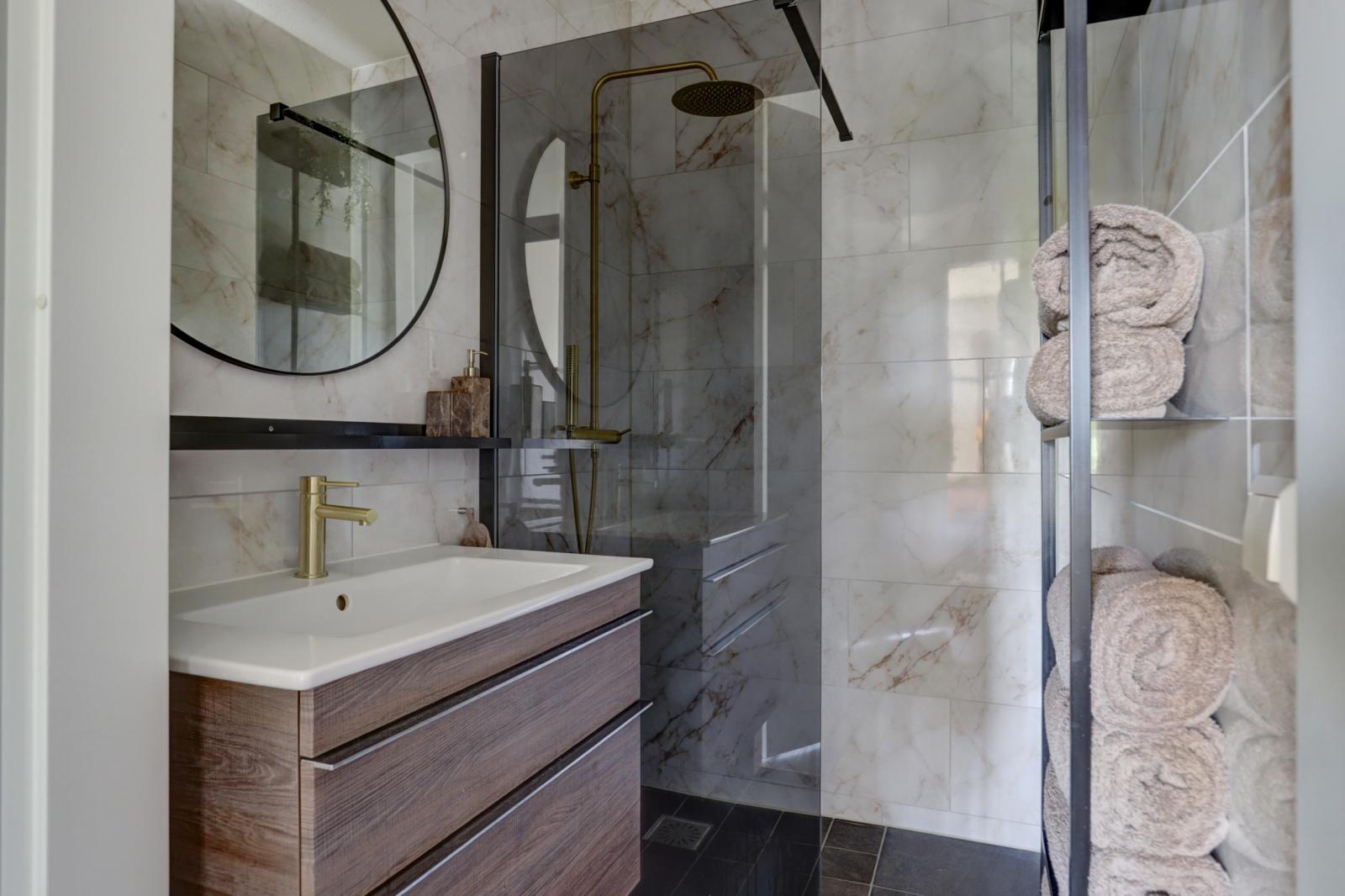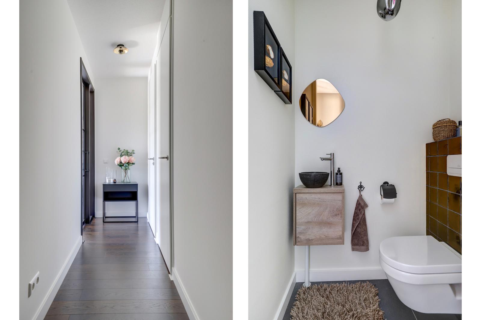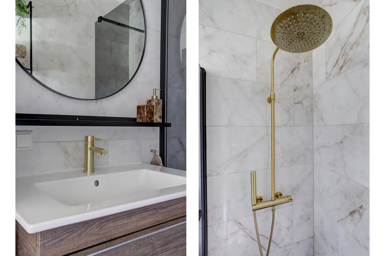 In 2021 zijn zowel het toilet als de badkamer gemoderniseerd. De achterwand van het toilet is voorzien van nieuwe tegels en de andere wanden zijn strak gestuukt. Voorzien met een zwevend closet en een fonteintje. Ook de badkamerwanden zijn in dat jaar opnieuw betegeld. De badkamer is sfeervol ingericht met een wastafelmeubel met lades, een spiegel en een ruime inloopdouche met een regendouche. De goudkleurige kranen geven het een luxe uitstraling.
