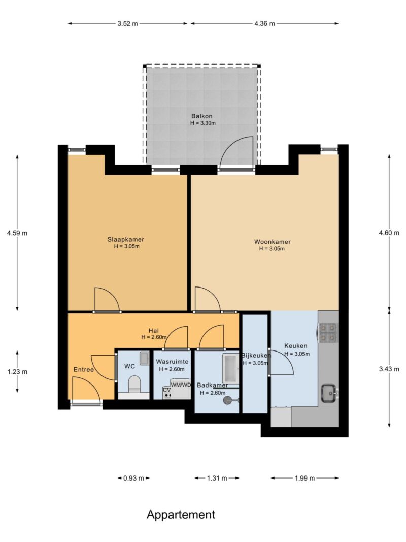 Het appartement is zeer efficiënt ingedeeld. Dankzij de hoge plafonds van ongeveer 3 meter voelt het binnen ruim en licht aan.