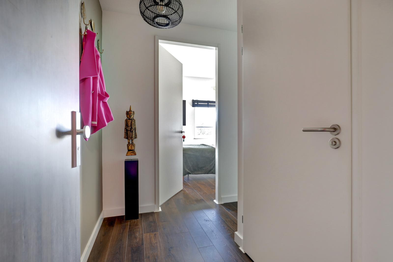 Bij binnenkomst kom je in de hal met een garderobe en een modern toilet. Vanuit de hal heb je toegang tot de slaapkamer, de wasruimte, de badkamer en de woonkamer.