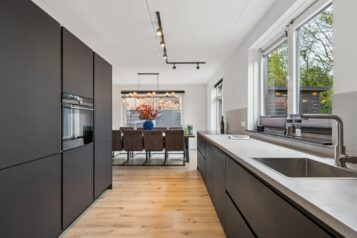 Aan de achterzijde bevindt zich de eetkamer, die in open verbinding staat met de keuken. Hier geniet je van gezellige diners en lange avonden tafelen. De prachtige keuken vormt het hart van de woning en is uitgevoerd in een strak design met alle benodigde inbouwapparatuur, een ideale plek voor kookliefhebbers en gezellige momenten met familie en vrienden. Je beschikt over voldoende werk- en bergruimte en hebt vanuit hier direct toegang tot de tuin rondom.