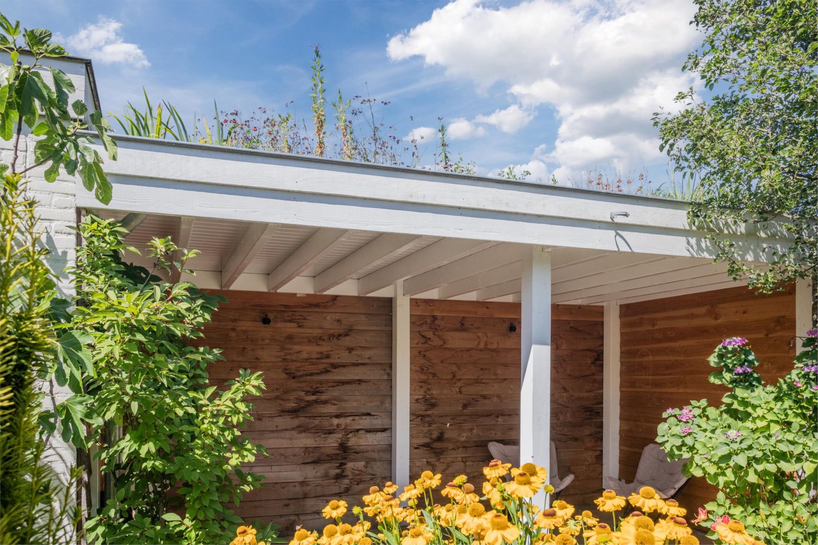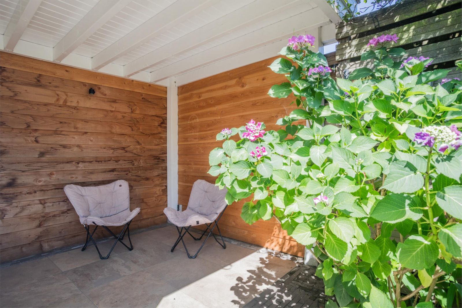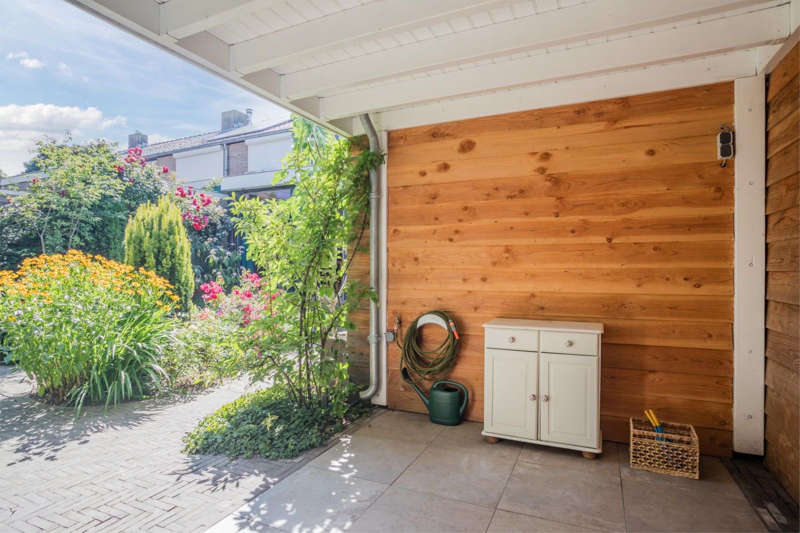 De idyllische achtertuin (74 m²) ligt op het oosten, kent praktisch geen inkijk van buren, is vakkundig aangelegd en biedt altijd wel een plekje in de zon én in de schaduw. De sfeervolle en ruime veranda met daktuin en natuurstenen vloer maakt het extra fijn om hier het hele jaar door buiten te genieten. Over een paar weken pluk je vijgen en aardbeien uit eigen tuin, en in het voorjaar bloeien er bloesembomen. Tenslotte is er nog de voortuin die al even mooi en kleurrijk is aangelegd. Je eigen bloemen uit de tuin plukken: wie wil dat nou niet? In alle tuinen en ook onder de veranda is sfeervolle tuinverlichting geplaatst wat een extra gevoel van ruimte geeft als je ‘s avonds naar buiten kijkt.