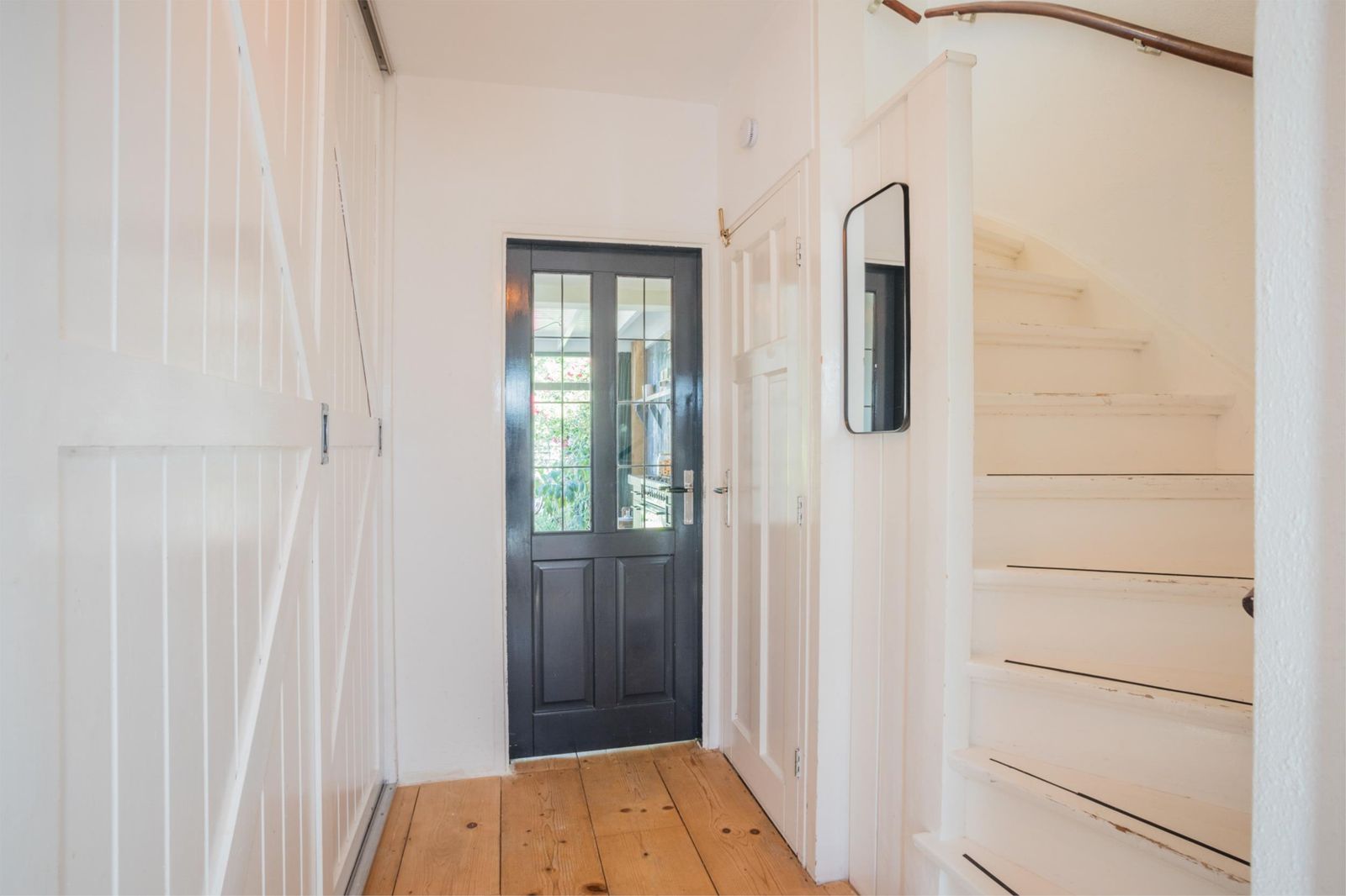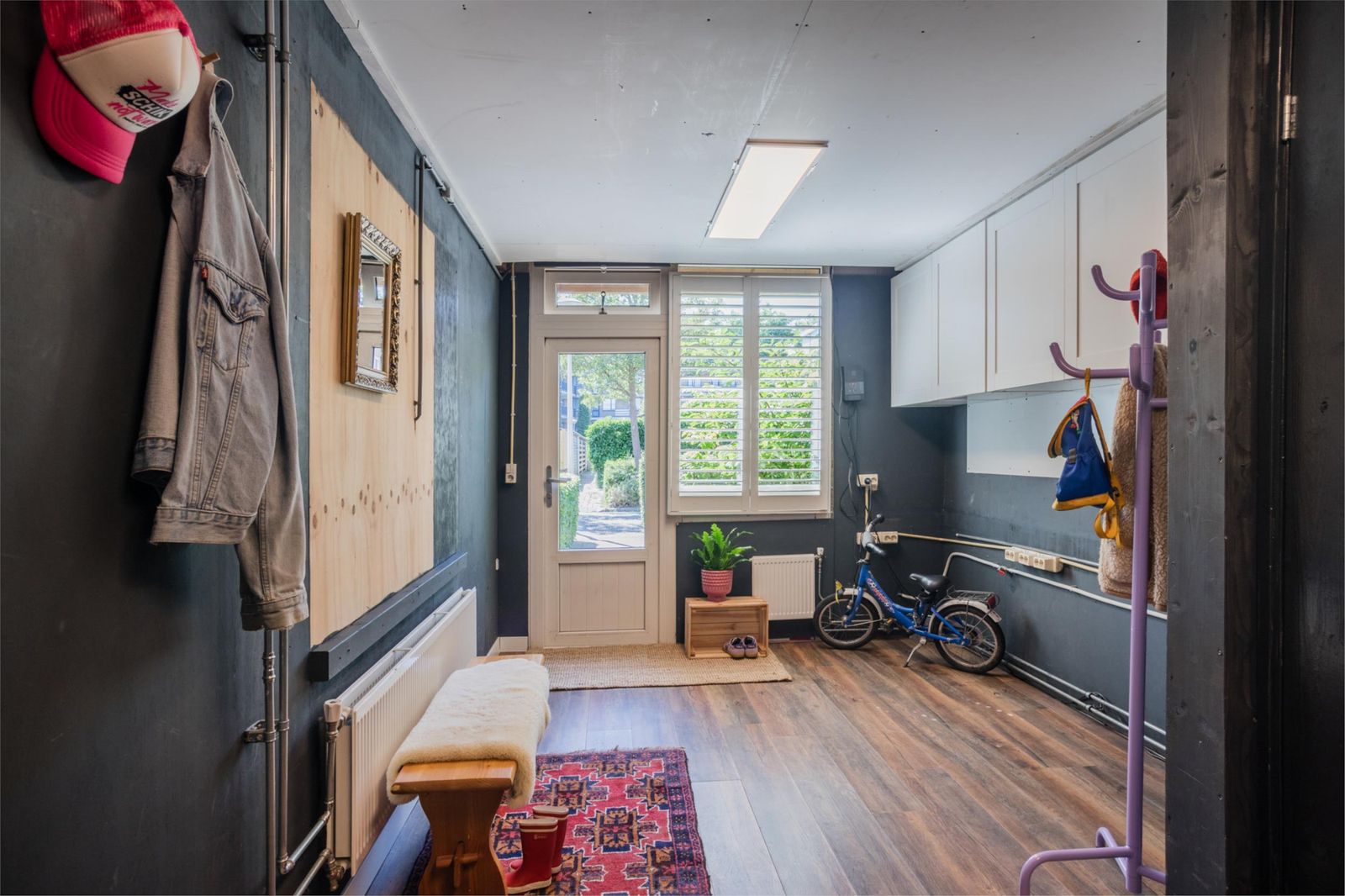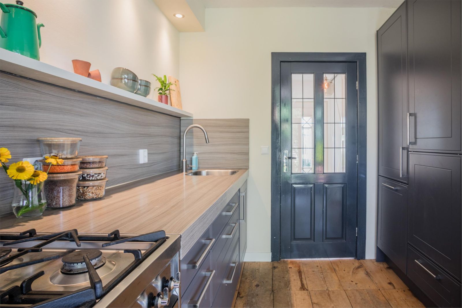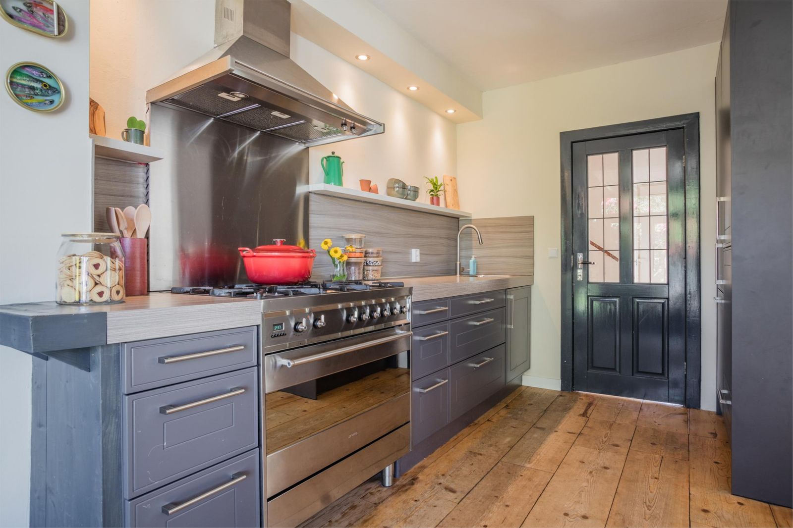 De oorspronkelijke entree bij de voordeur biedt nog een grote garderobekast over de volle lengte van de gang, een (hangend) toilet en handige trapkast. Vanuit hier kom je in de keuken, die ook grenst aan de zit- en eetkamer. Hier vind je alles wat je maar kunt wensen: een vaatwasser, koelkast en als blikvanger een robuust 6-pits fornuis van Smeg met grote oven en RVS afzuigkap.
