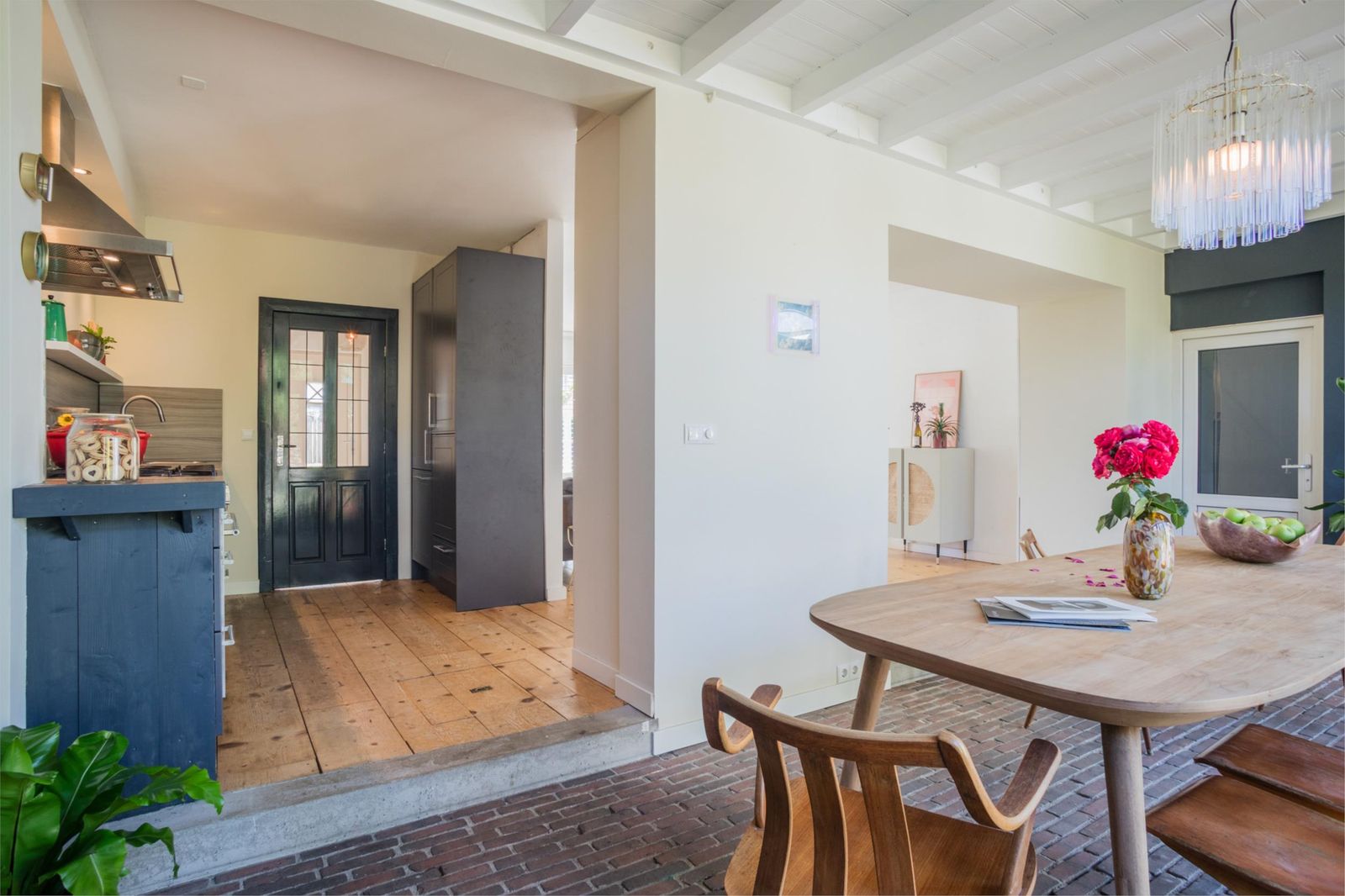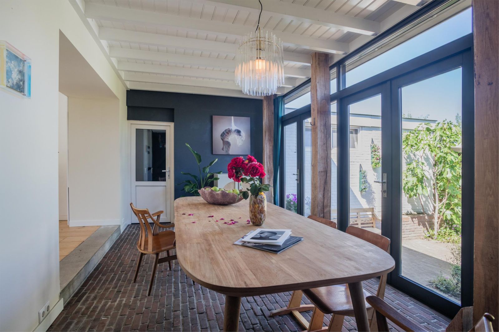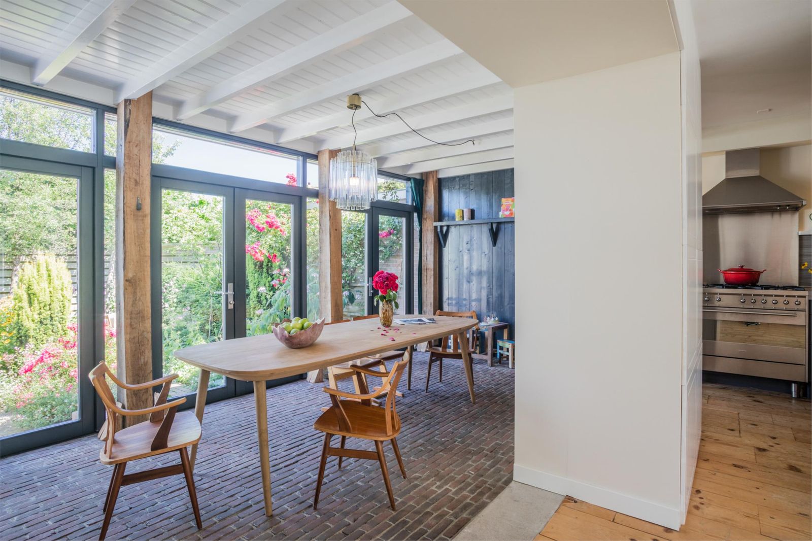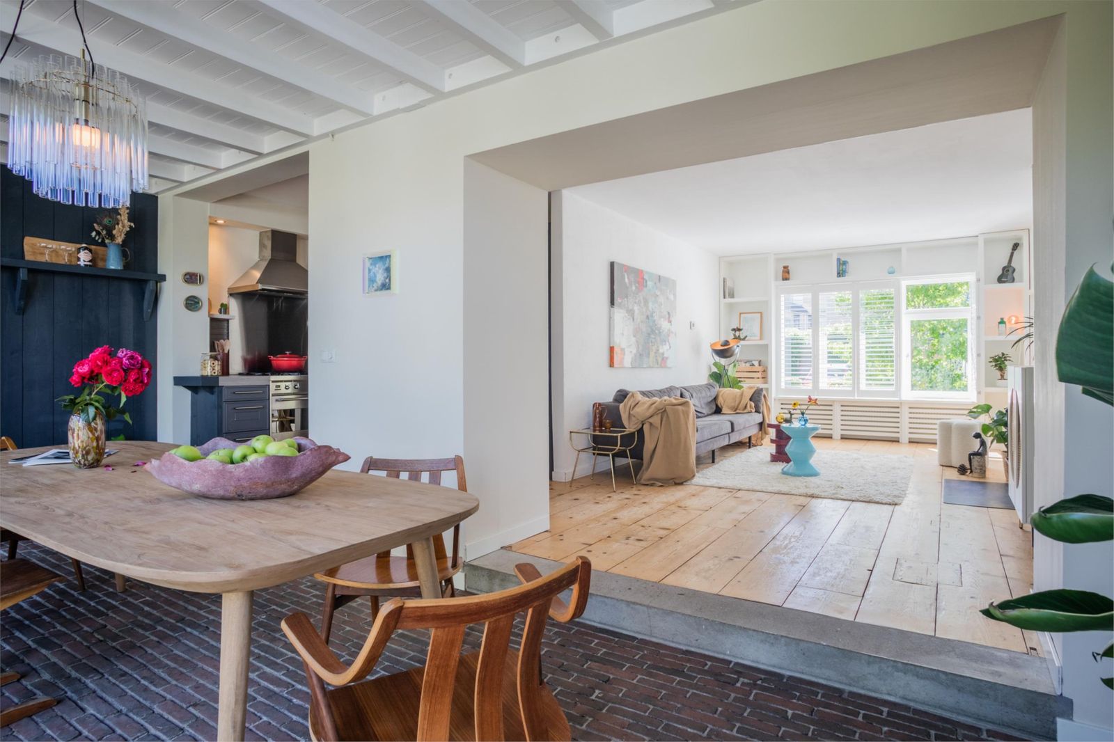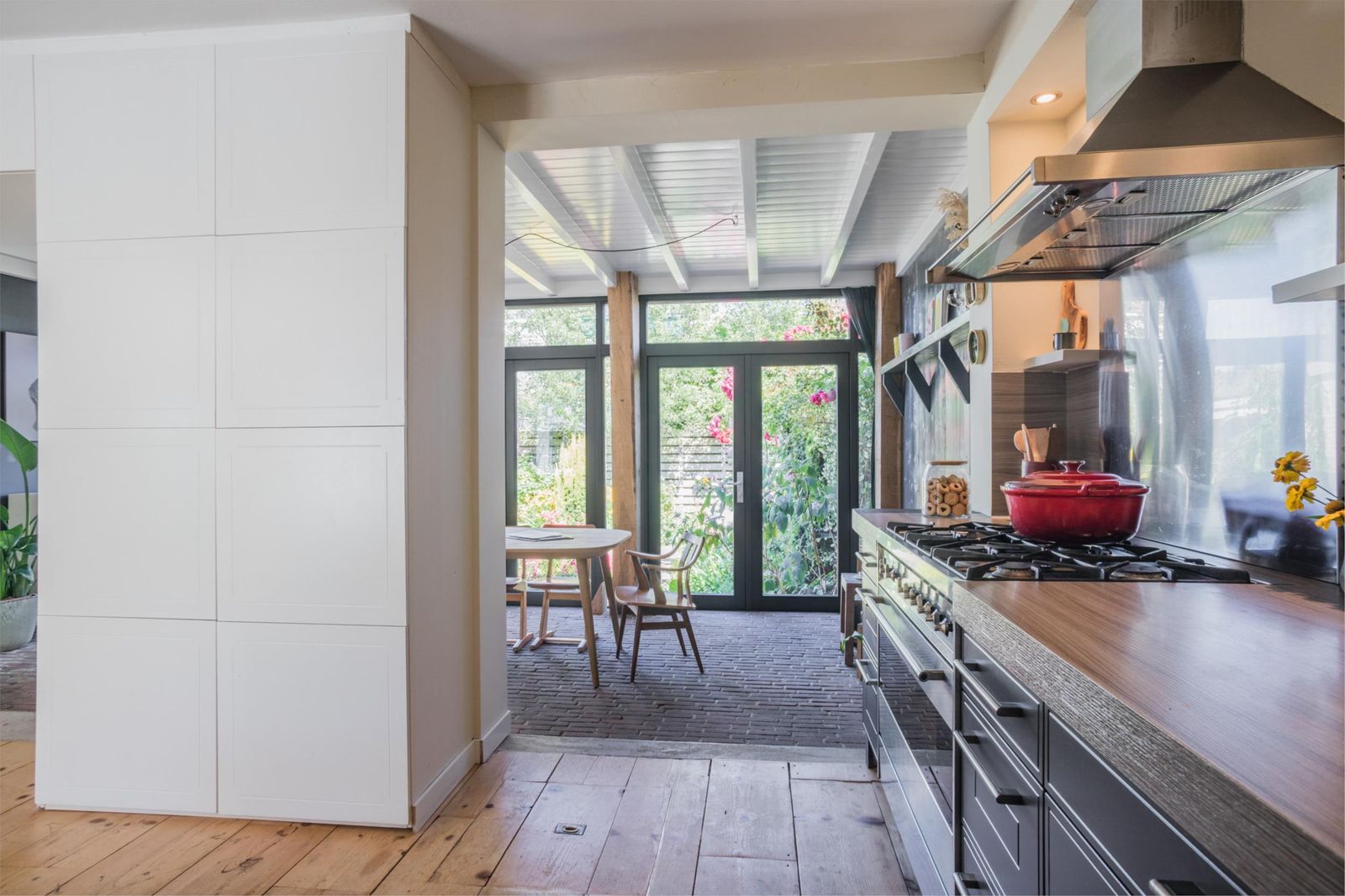 Uniek aan dit huis is dat je niet alleen een ruime woonkamer hebt, maar ook een aparte eetkamer. Want dat is wel de absolute woonverrassing van dit huis: hier ligt een klassieke vloer van oude waaltjes met vloerverwarming en openslaande deuren (3 x 2) naar de kleurrijke tuin. Binnen wordt buiten. Puur woongenot om eindeloos te tafelen met 10 man aan een eettafel waar je omheen kunt dansen.