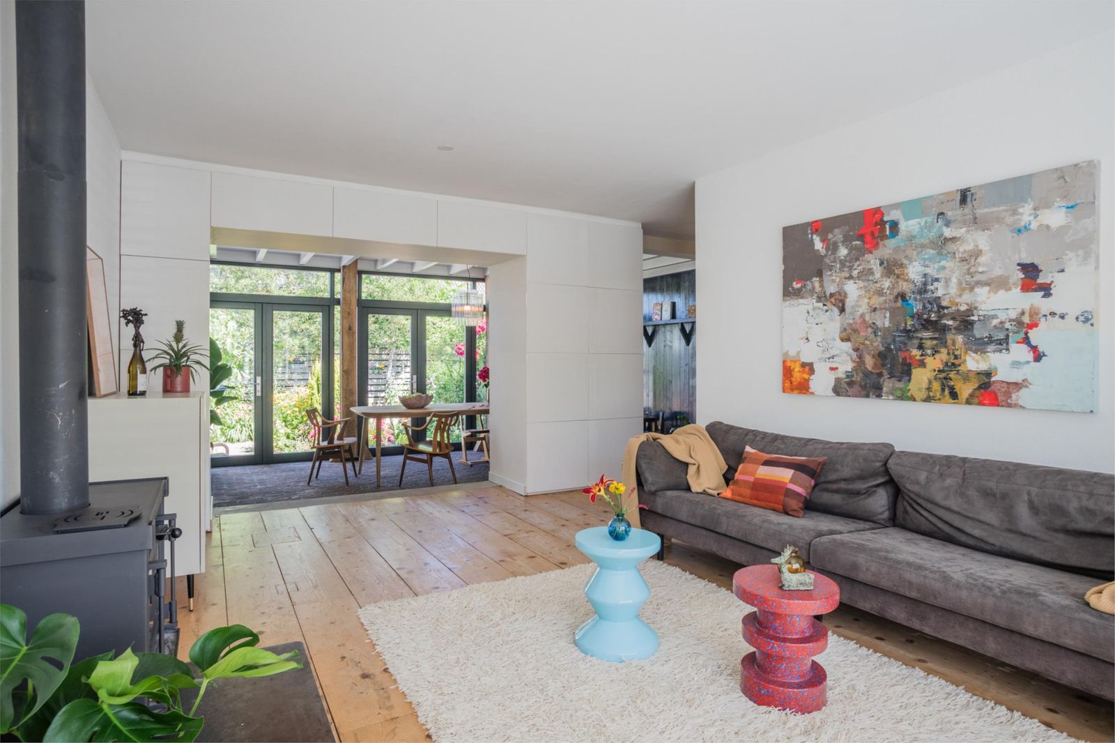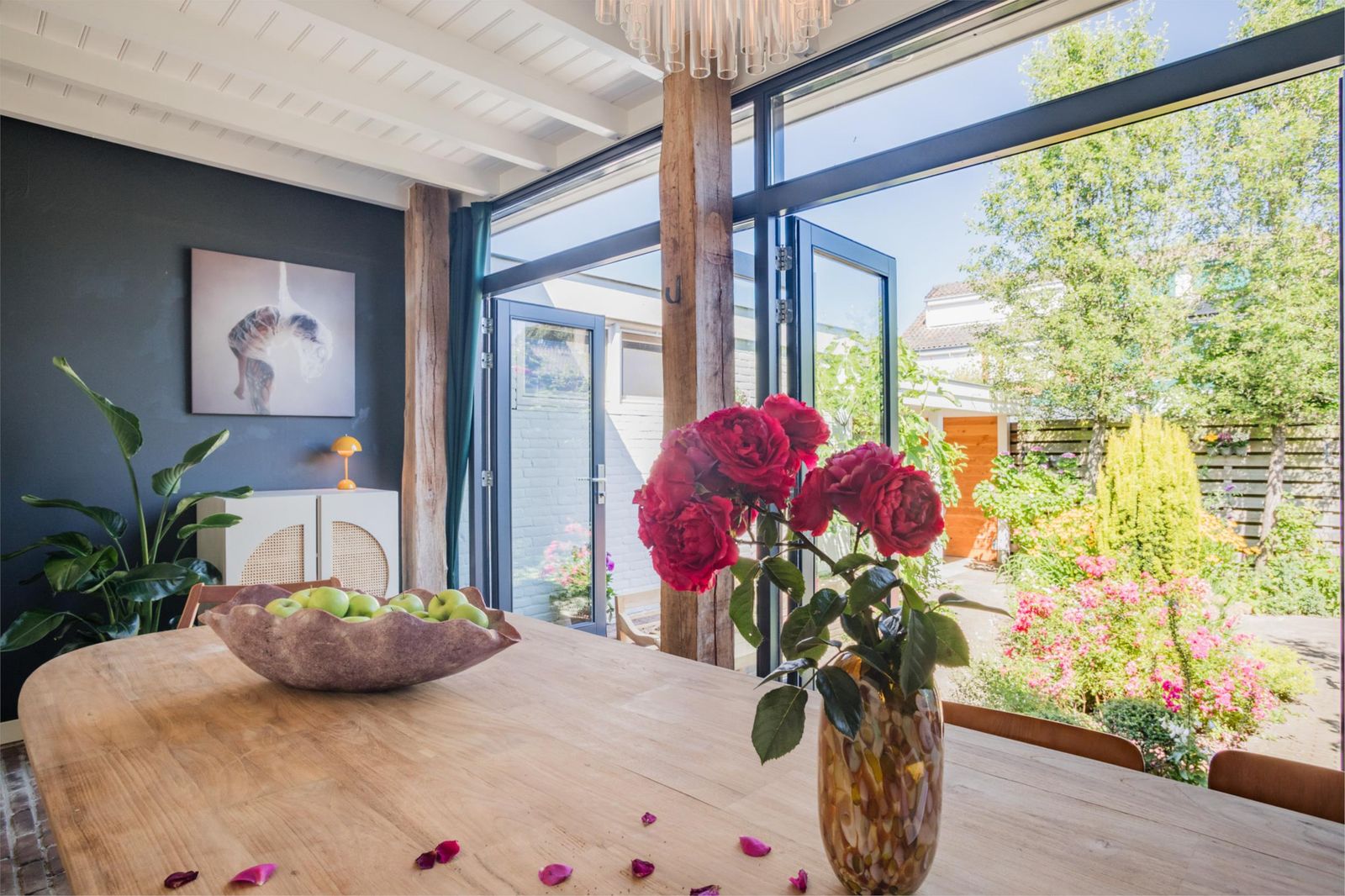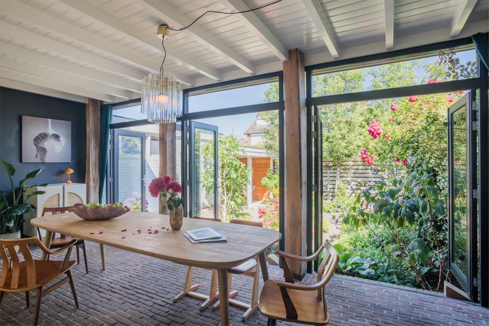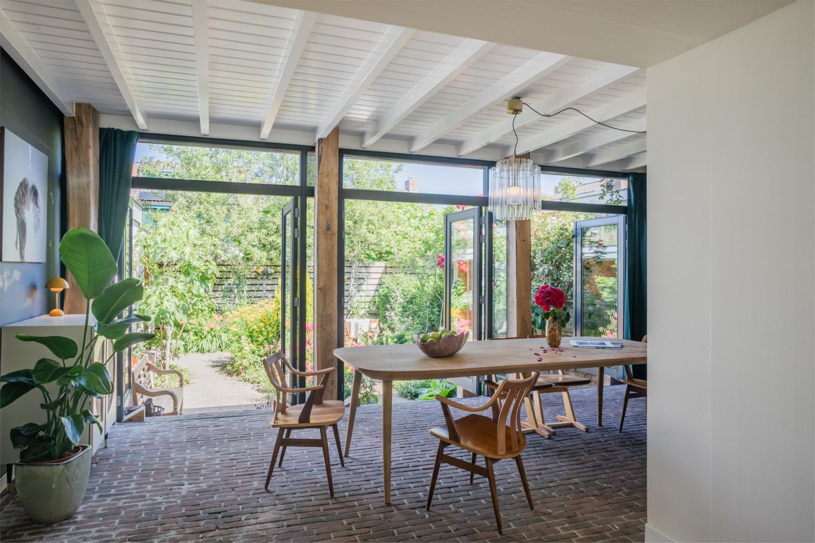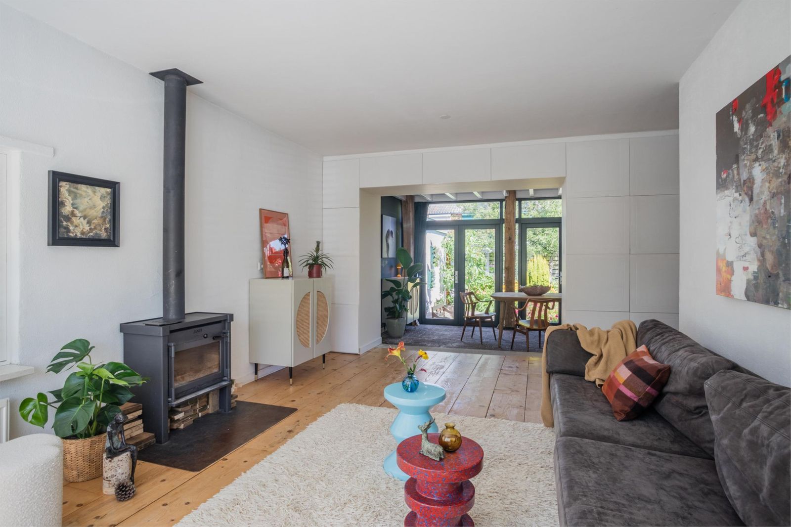 Uniek aan dit huis is dat je niet alleen een ruime woonkamer hebt, maar ook een aparte eetkamer. Want dat is wel de absolute woonverrassing van dit huis: hier ligt een klassieke vloer van oude waaltjes met vloerverwarming en openslaande deuren (3 x 2) naar de kleurrijke tuin. Binnen wordt buiten. Puur woongenot om eindeloos te tafelen met 10 man aan een eettafel waar je omheen kunt dansen.