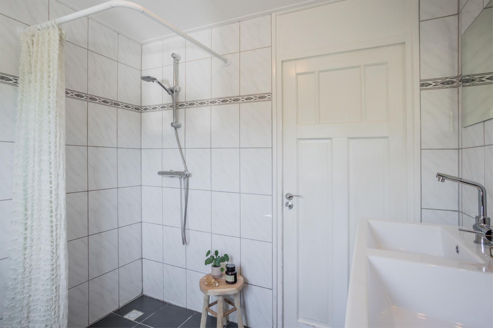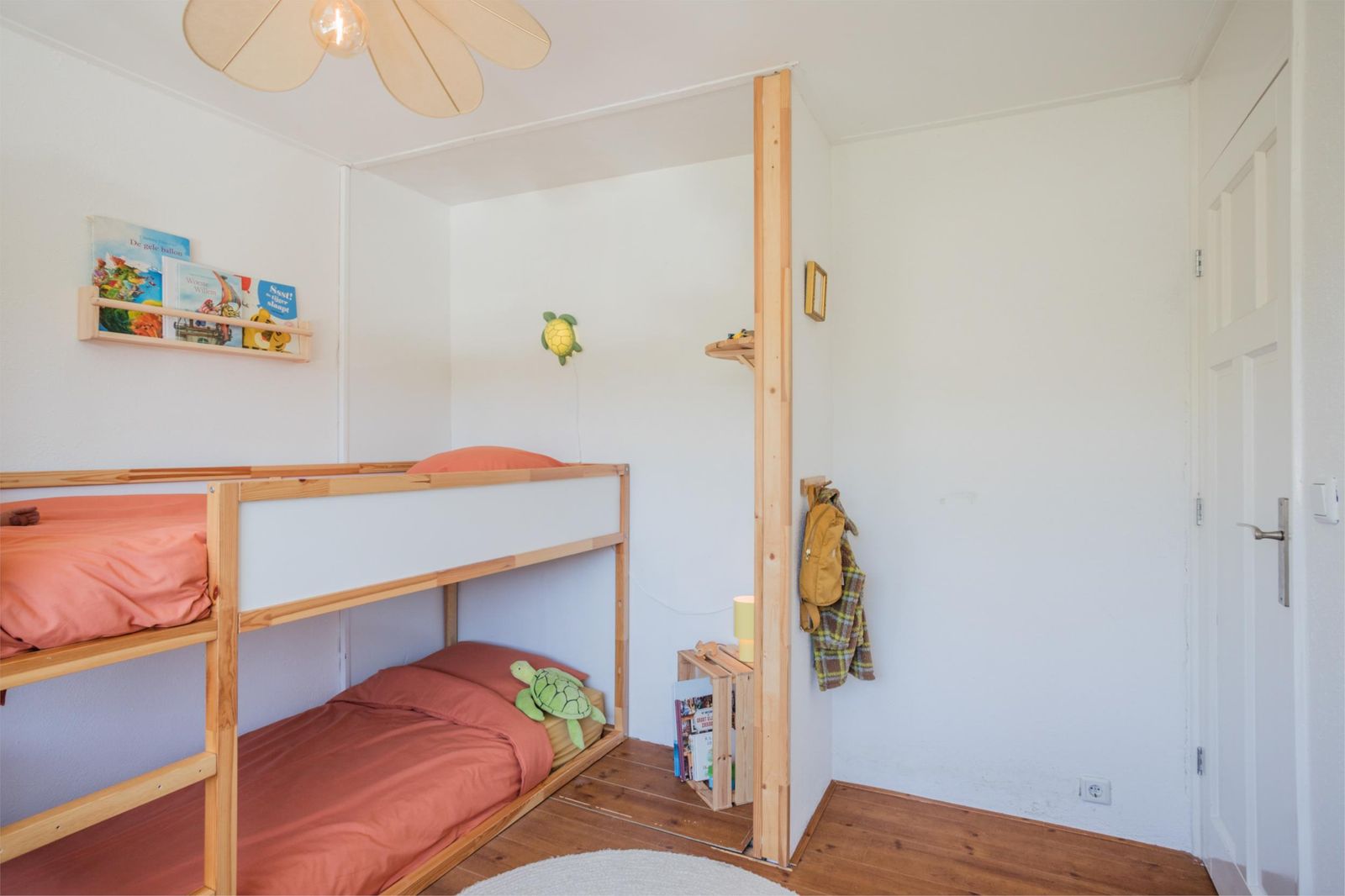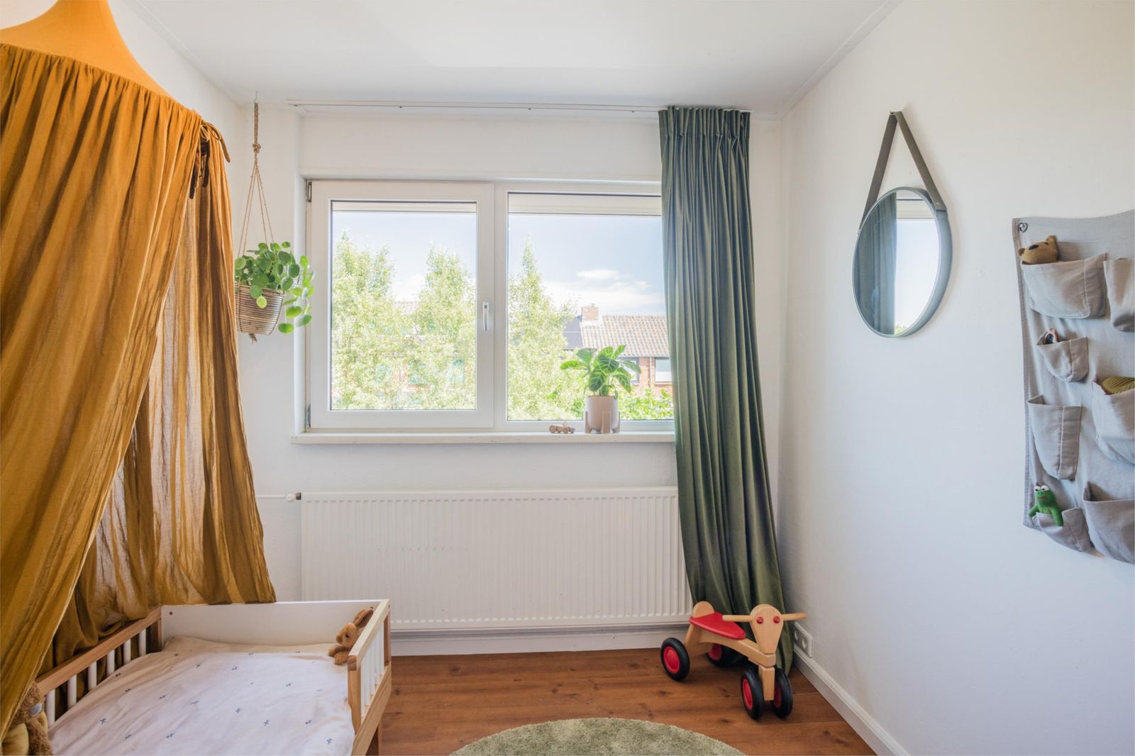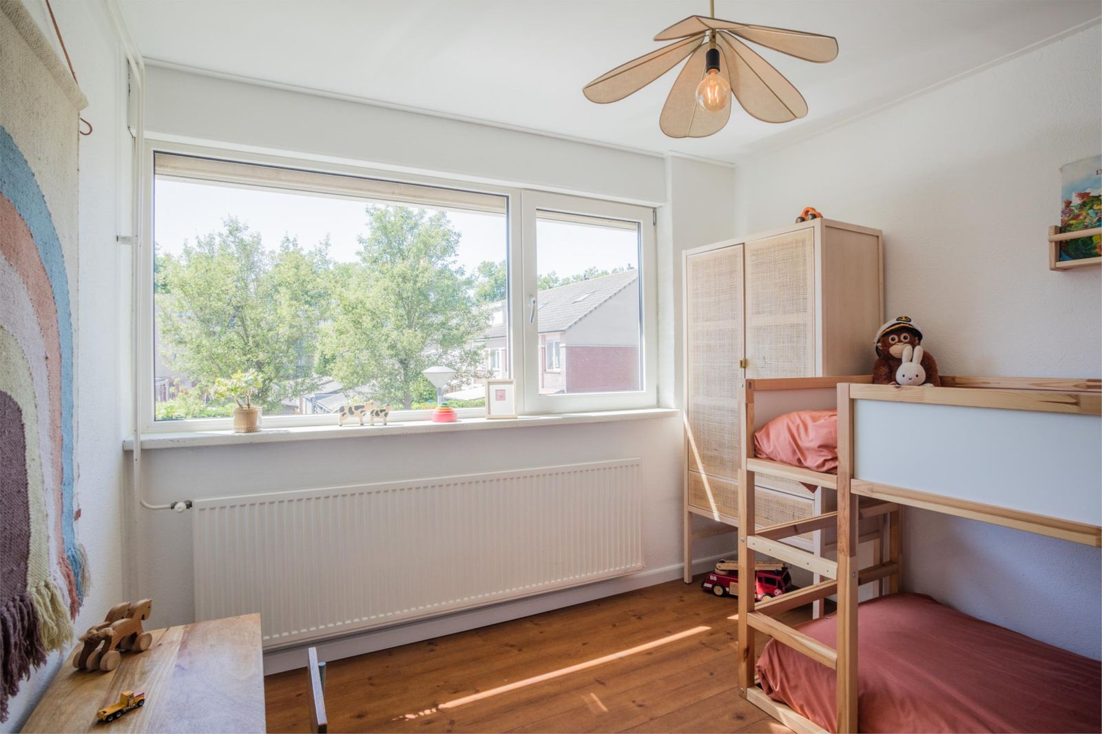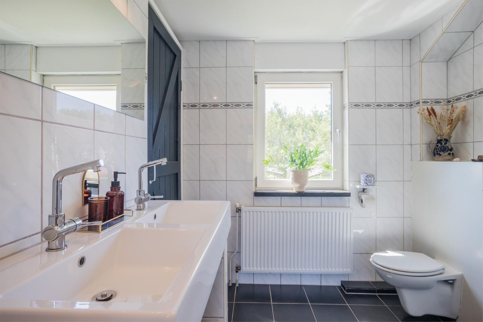 Uniek aan dit huis is dat je niet alleen een ruime woonkamer hebt, maar ook een aparte eetkamer. Want dat is wel de absolute woonverrassing van dit huis: hier ligt een klassieke vloer van oude waaltjes met vloerverwarming en openslaande deuren (3 x 2) naar de kleurrijke tuin. Binnen wordt buiten. Puur woongenot om eindeloos te tafelen met 10 man aan een eettafel waar je omheen kunt dansen.