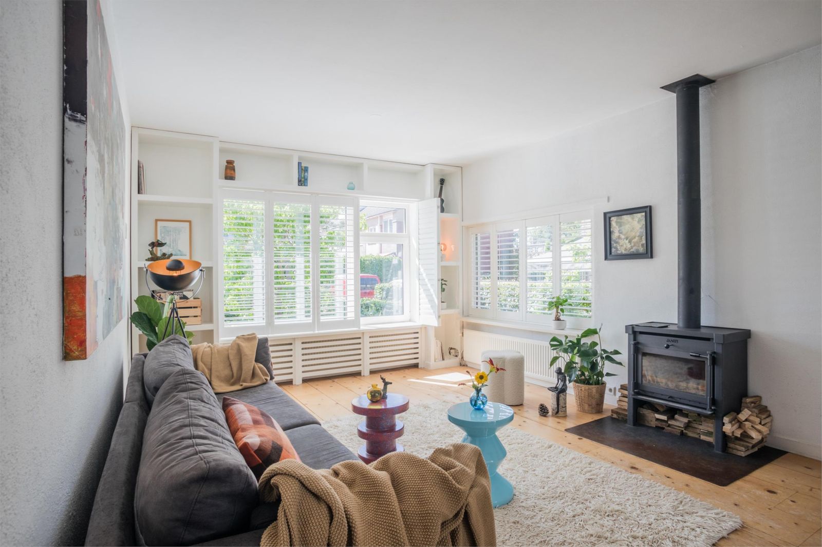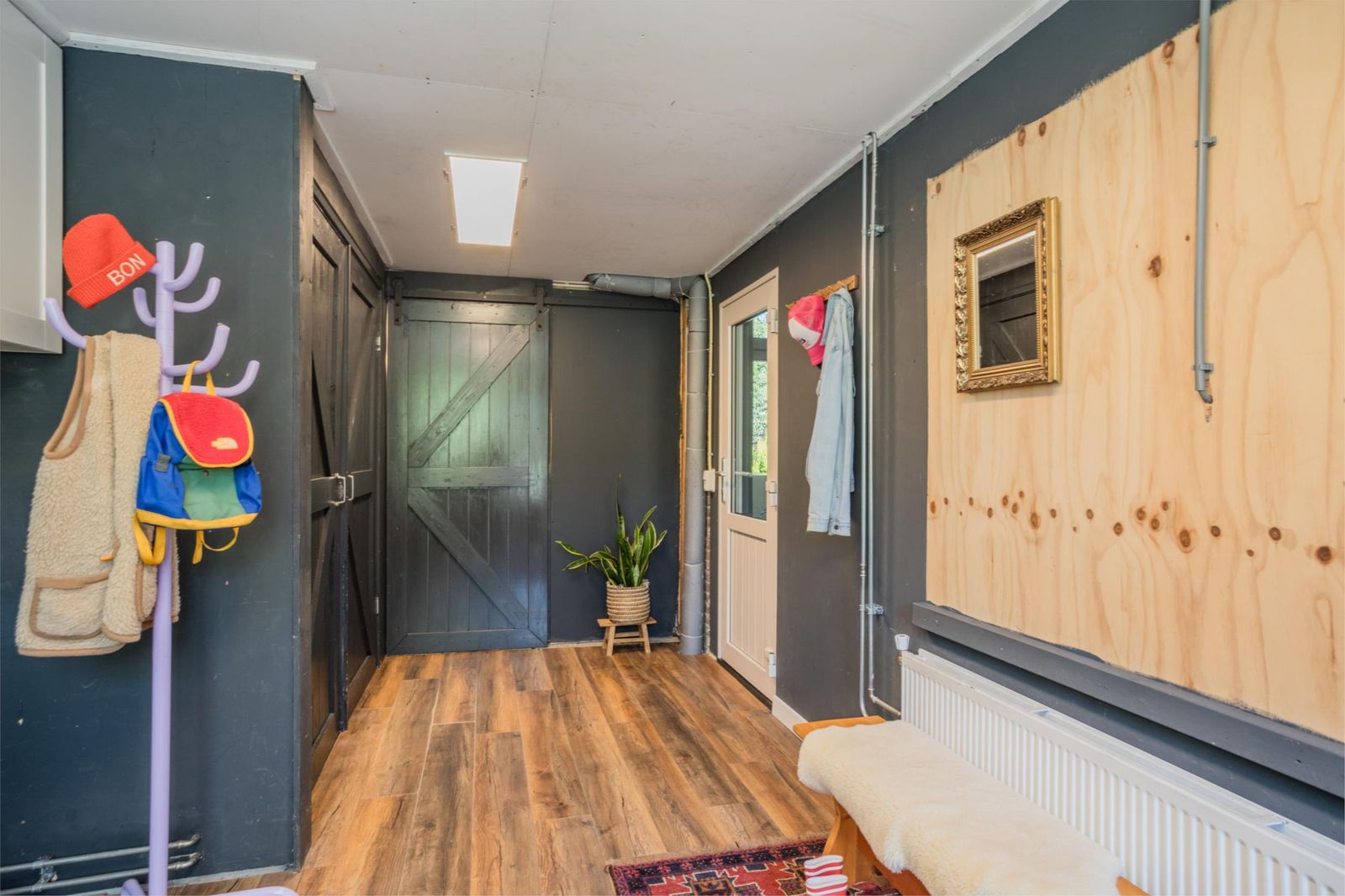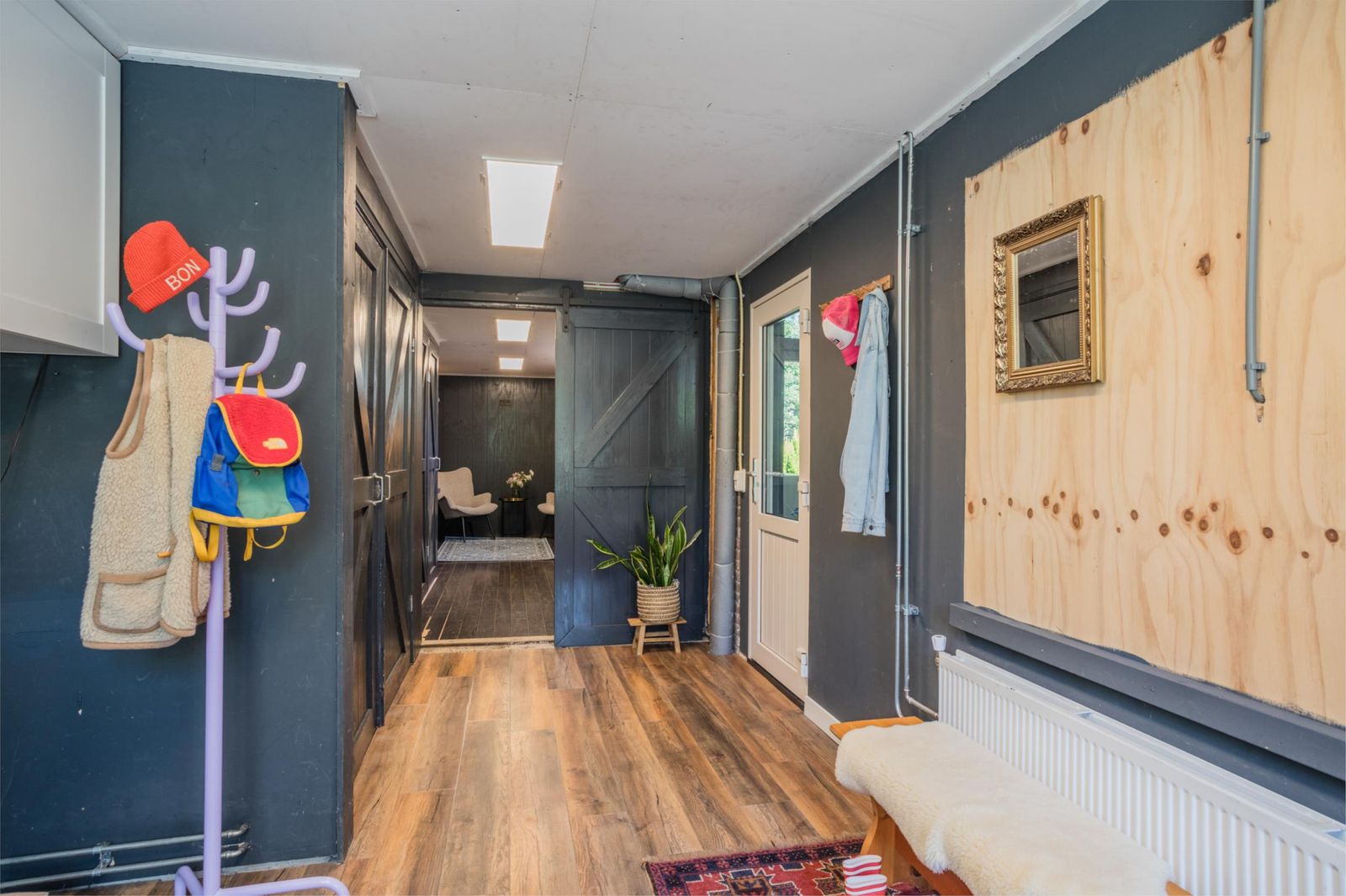 De zitkamer aan de voorkant is bijzonder licht en sfeervol, met een groot formaat houtkachel van Janus en een stevige houten vloer die doorloopt in de keuken. Via de zitkamer bereik je ook de ruime bijkeuken/garage met eigen ingang én een multifunctionele ruimte die nu in gebruik is als werkkamer, maar voorheen ook als logeerkamer. Deze ruimtes zijn volledig geïsoleerd, verwarmd en voorzien van veel bergruimte.