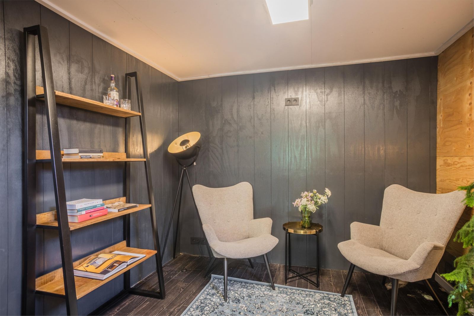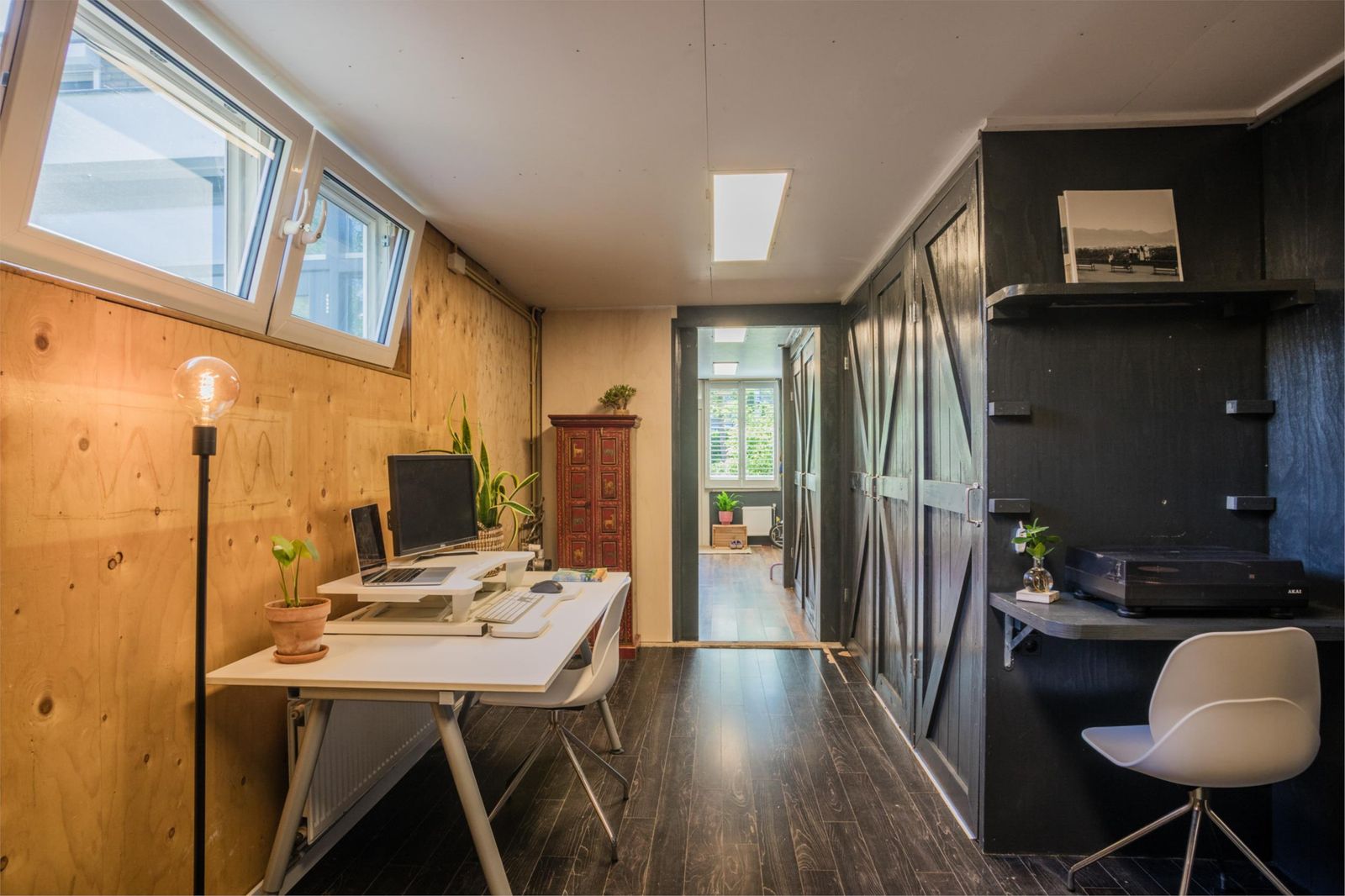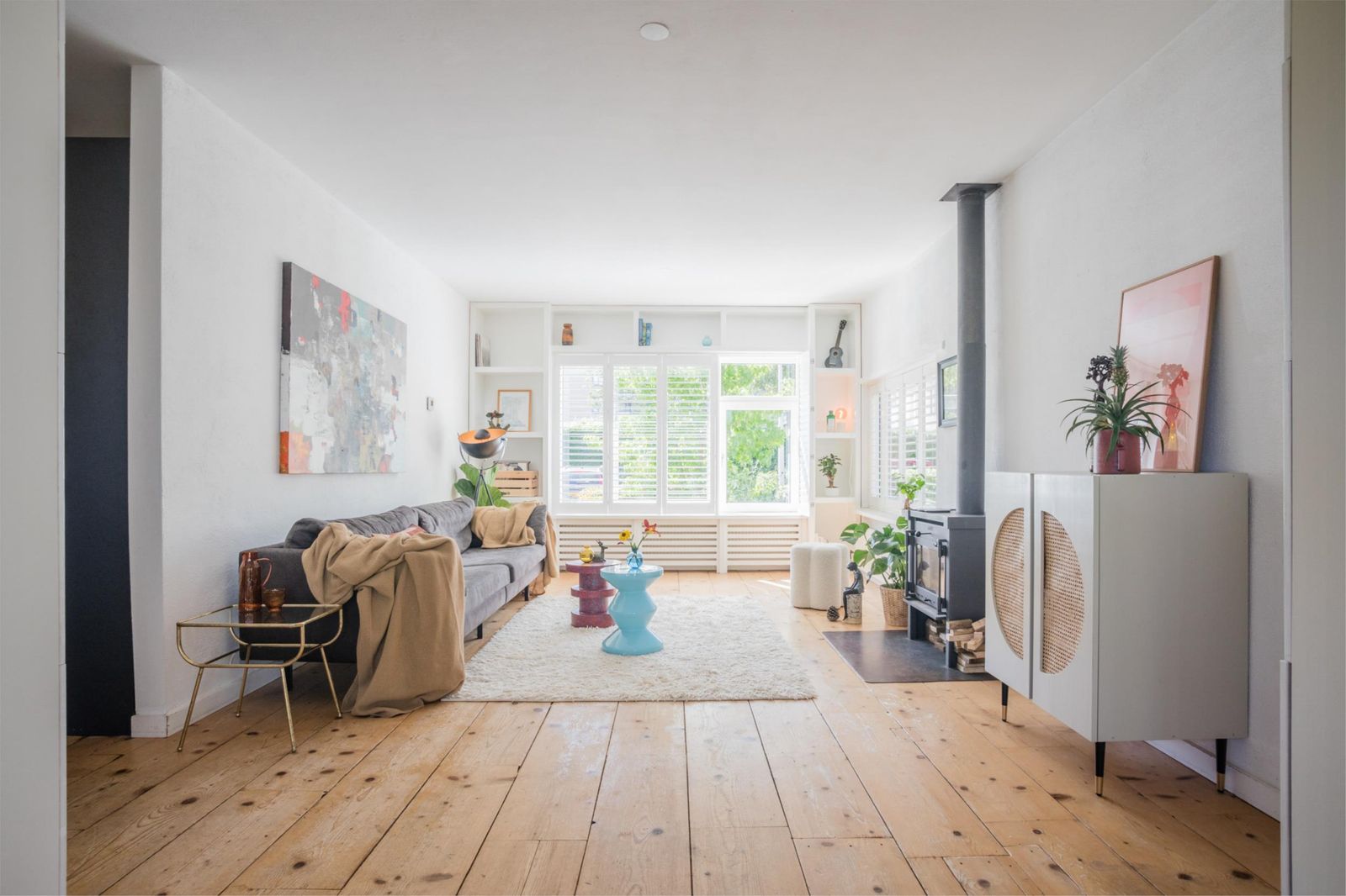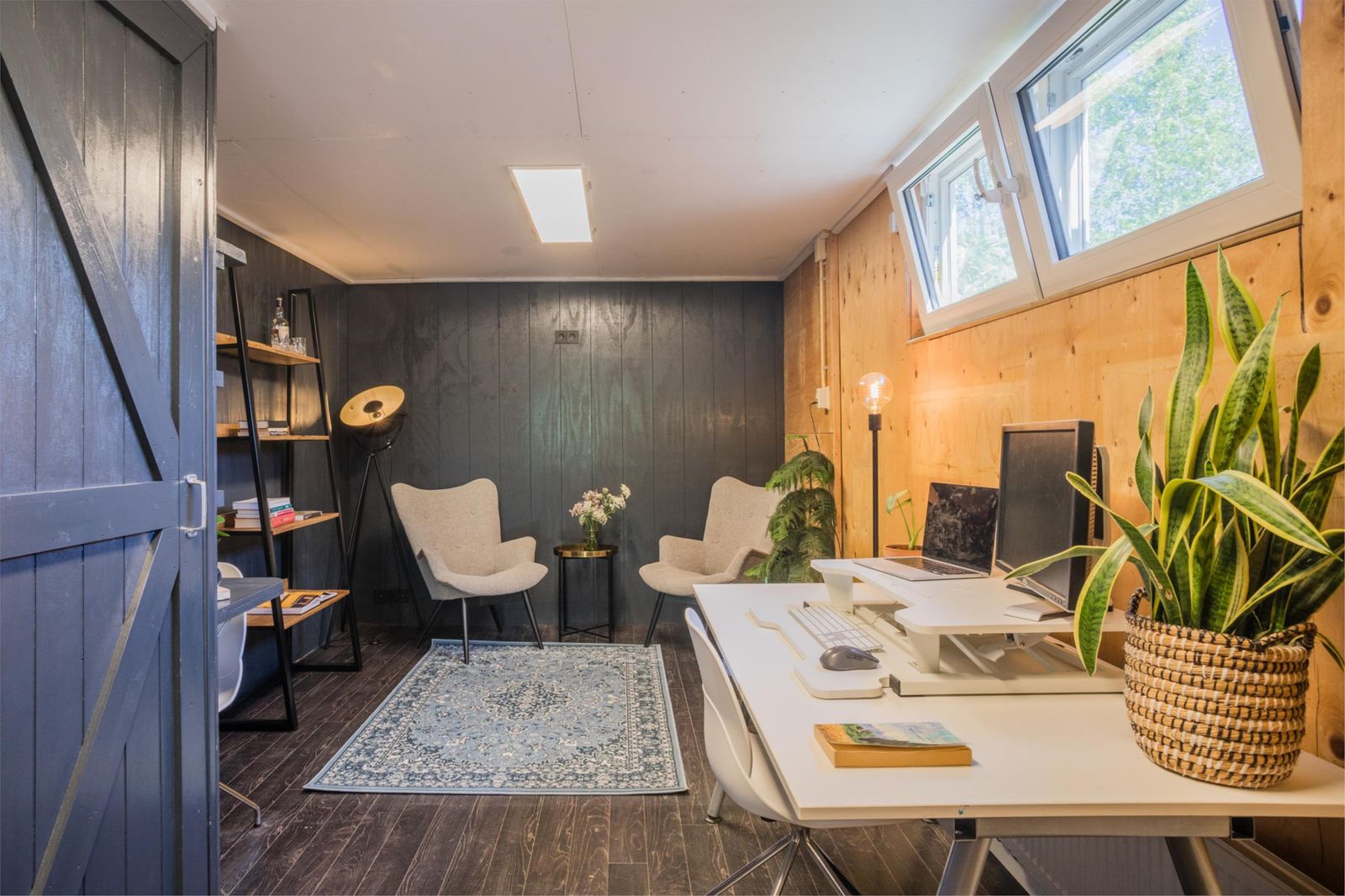 De zitkamer aan de voorkant is bijzonder licht en sfeervol, met een groot formaat houtkachel van Janus en een stevige houten vloer die doorloopt in de keuken. Via de zitkamer bereik je ook de ruime bijkeuken/garage met eigen ingang én een multifunctionele ruimte die nu in gebruik is als werkkamer, maar voorheen ook als logeerkamer. Deze ruimtes zijn volledig geïsoleerd, verwarmd en voorzien van veel bergruimte.