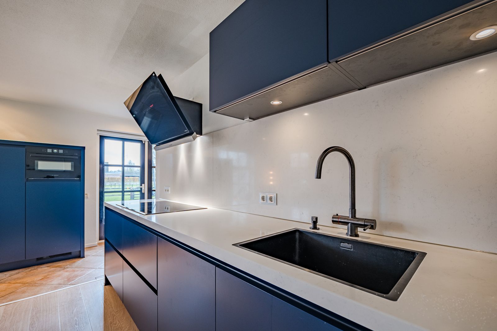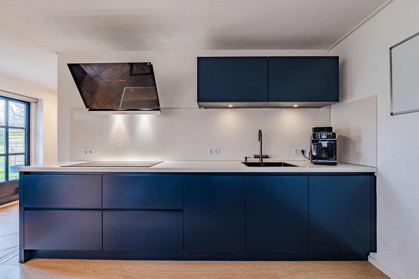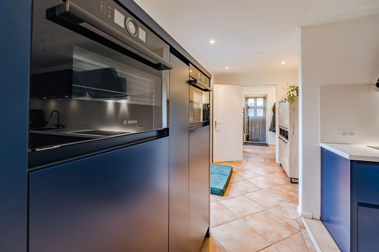 In de ruime woonkeuken is een nieuwe donderblauwe keuken geplaatst met Bosch inbouwapparatuur zoals een vaatwasser, combi-oven magnetron, combi-oven steamer, inductiekookplaat, afzuigsysteem aan de wand, heet waterkraan en een koelkast.