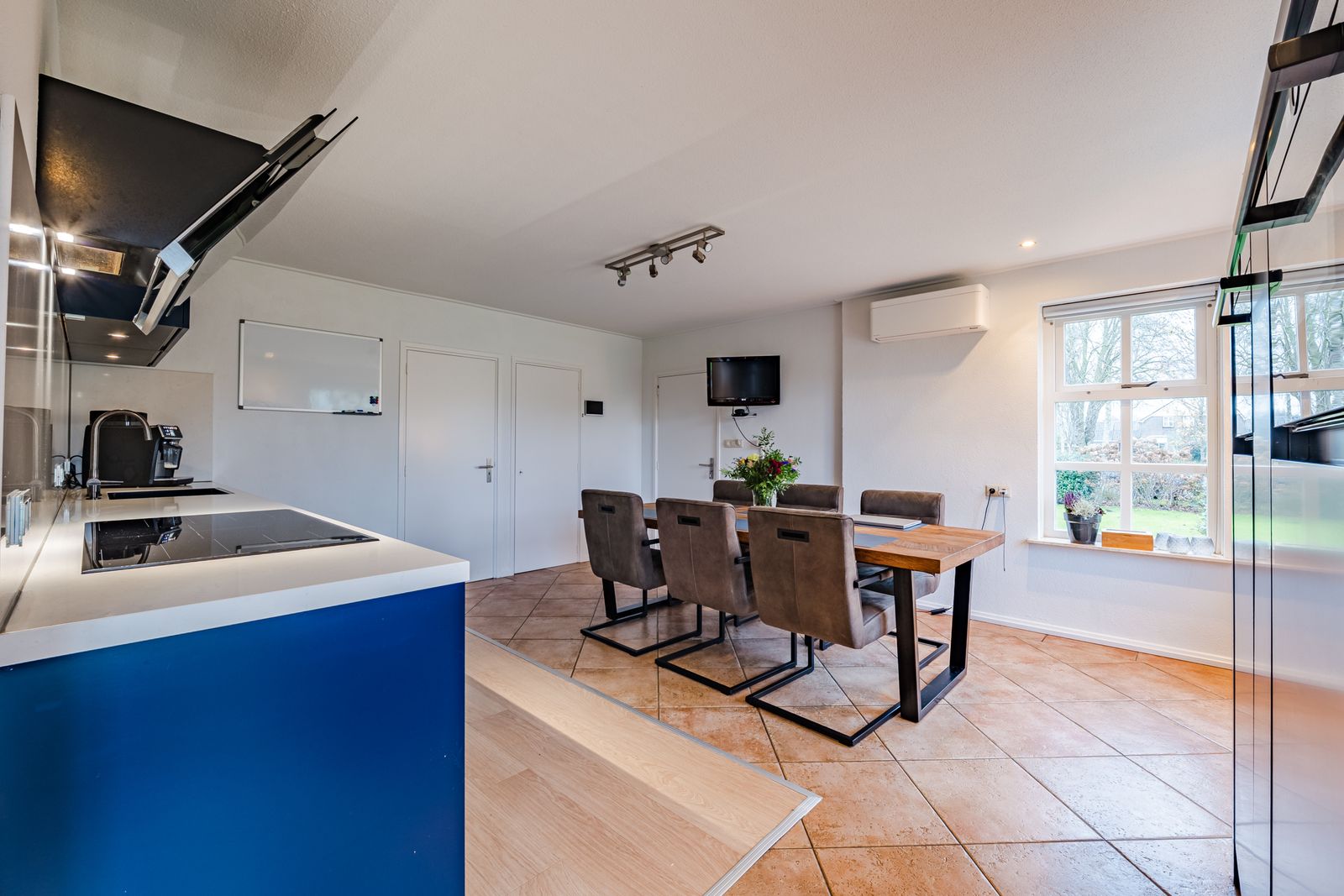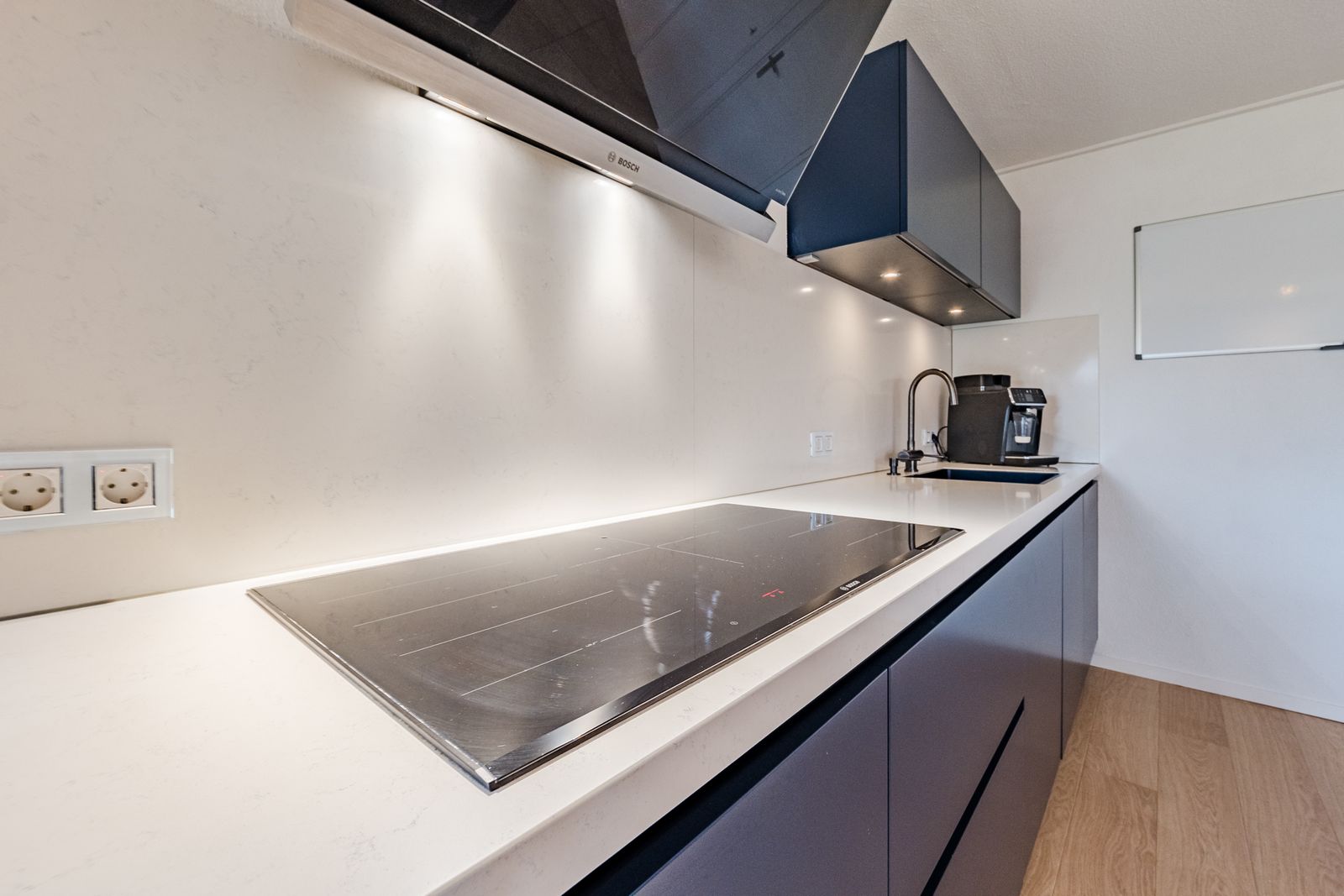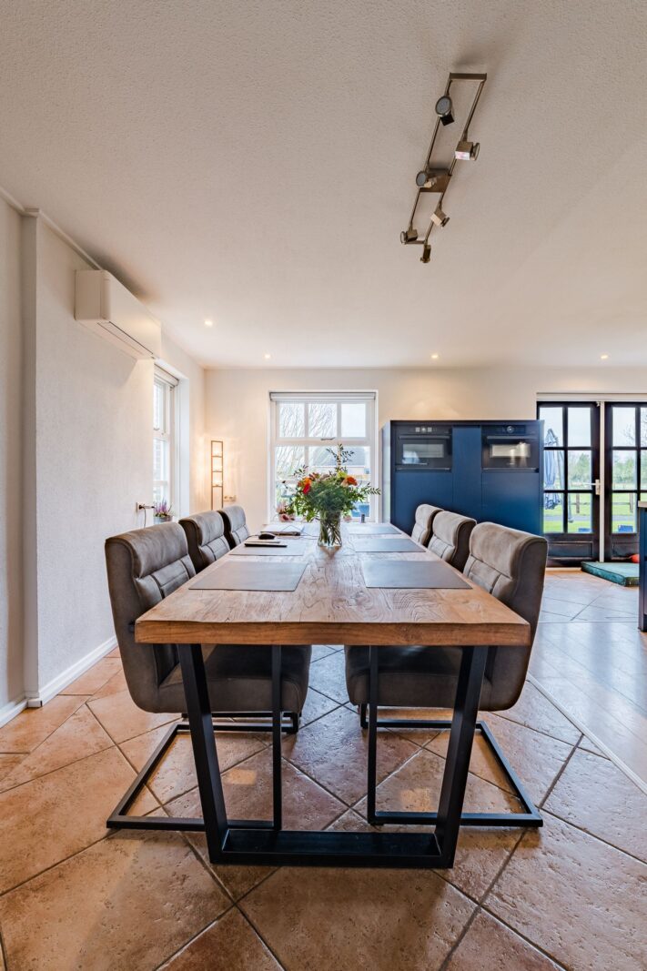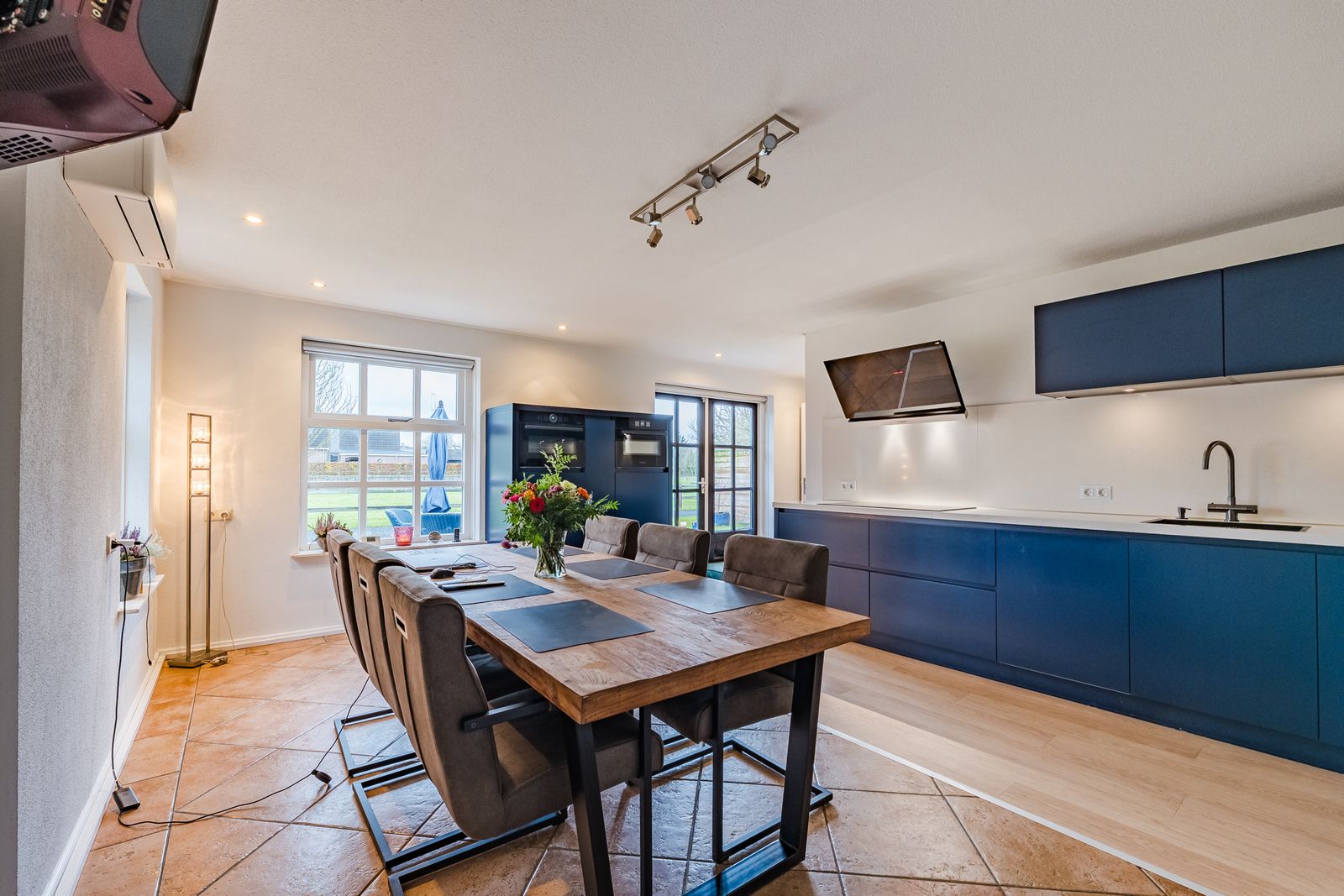 In de ruime woonkeuken is een nieuwe donderblauwe keuken geplaatst met Bosch inbouwapparatuur zoals een vaatwasser, combi-oven magnetron, combi-oven steamer, inductiekookplaat, afzuigsysteem aan de wand, heet waterkraan en een koelkast.