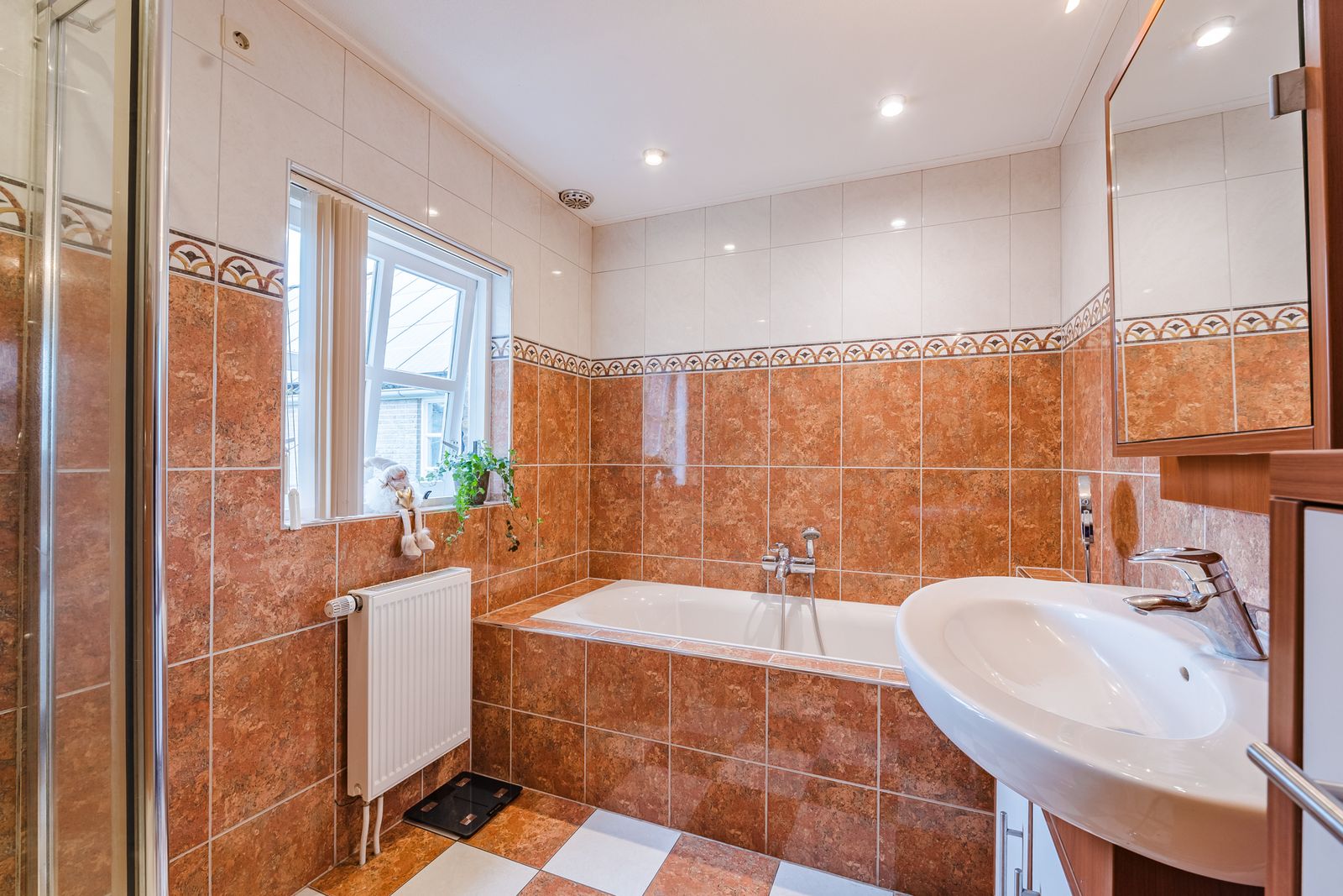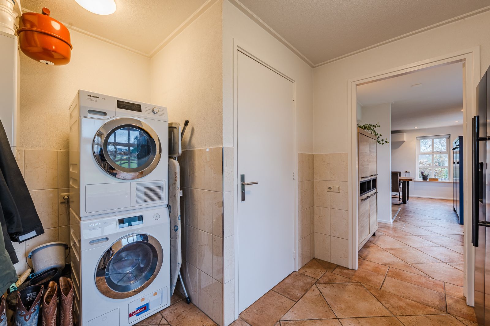 Er kan een grote vries-koelcombinatie geplaatst worden in de bijkeuken, evenals de wasmachine en de droger