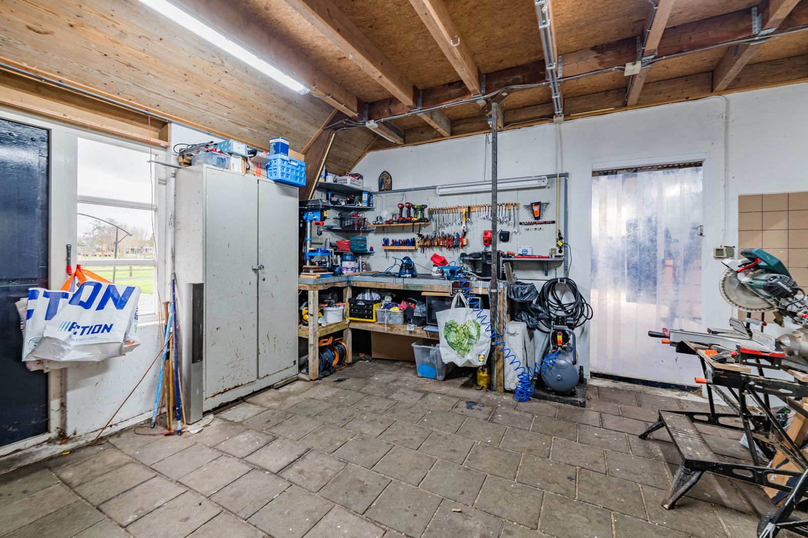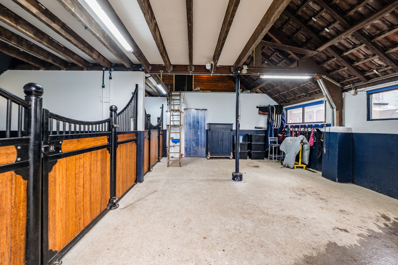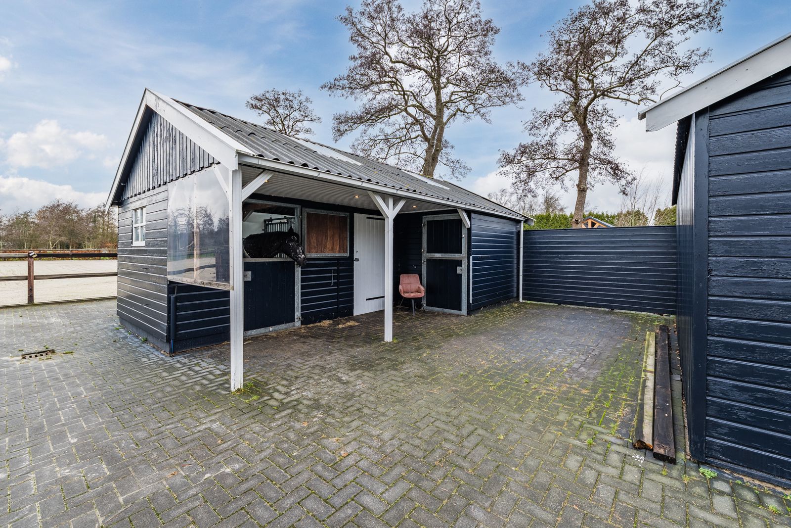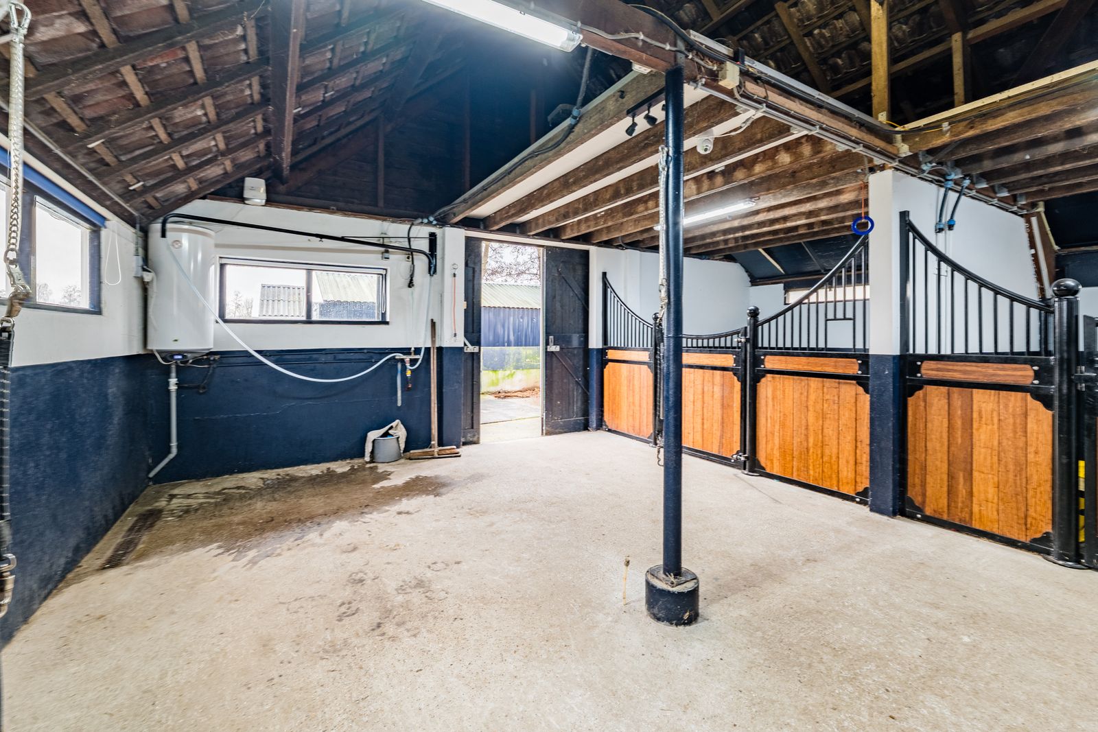 Het stenen bijgebouw (voorheen voor schapen, koeien en werkruimte) is aan de binnenkant volledig gemoderniseerd met 2 luxe halfopen paardenboxen met Mayo-matrassen en verwarmd drinkwater, een was/poets-plaats met warm en koud water, evenals een open tackroom. De mestplaat bevindt zich direct aansluitend aan dit bijgebouw. Er kan desgewenst een derde paardenbox geplaatst worden in dit gedeelte van het bijgebouw. Er is eveneens een nieuwe berging gerealiseerd voor o.a. fietsen, brommers en verdere opslagruimte. De werkruimte is in tact gebleven maar kan ook ingericht worden als garage; de toegang daarvoor is aanwezig (openslaande deuren). Op het stenen bijgebouw liggen 30 zonnepanelen. Er is een zolder in het bijgebouw voor opslagruimte, gedeeltelijk ook afsluitbaar en geïsoleerd.