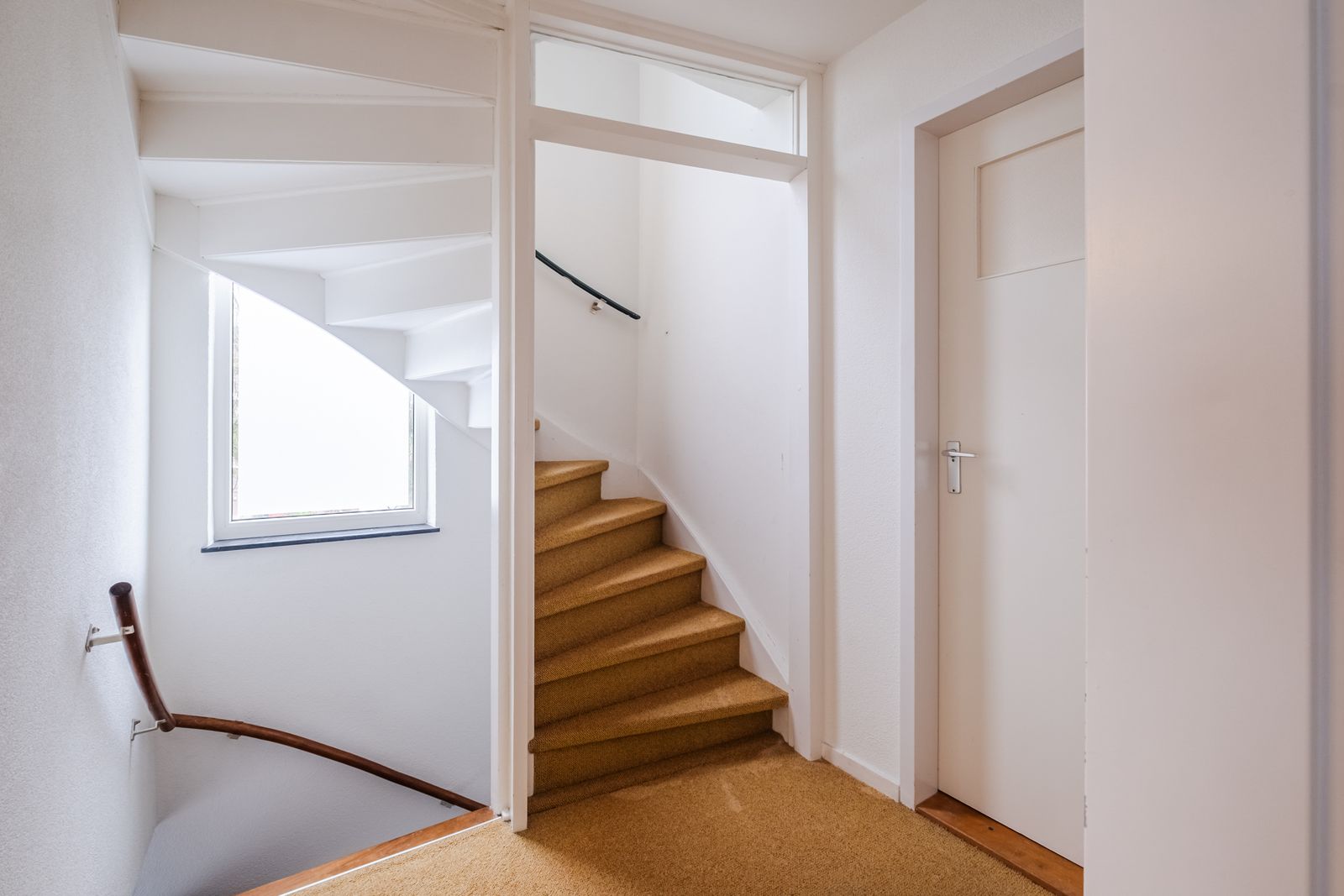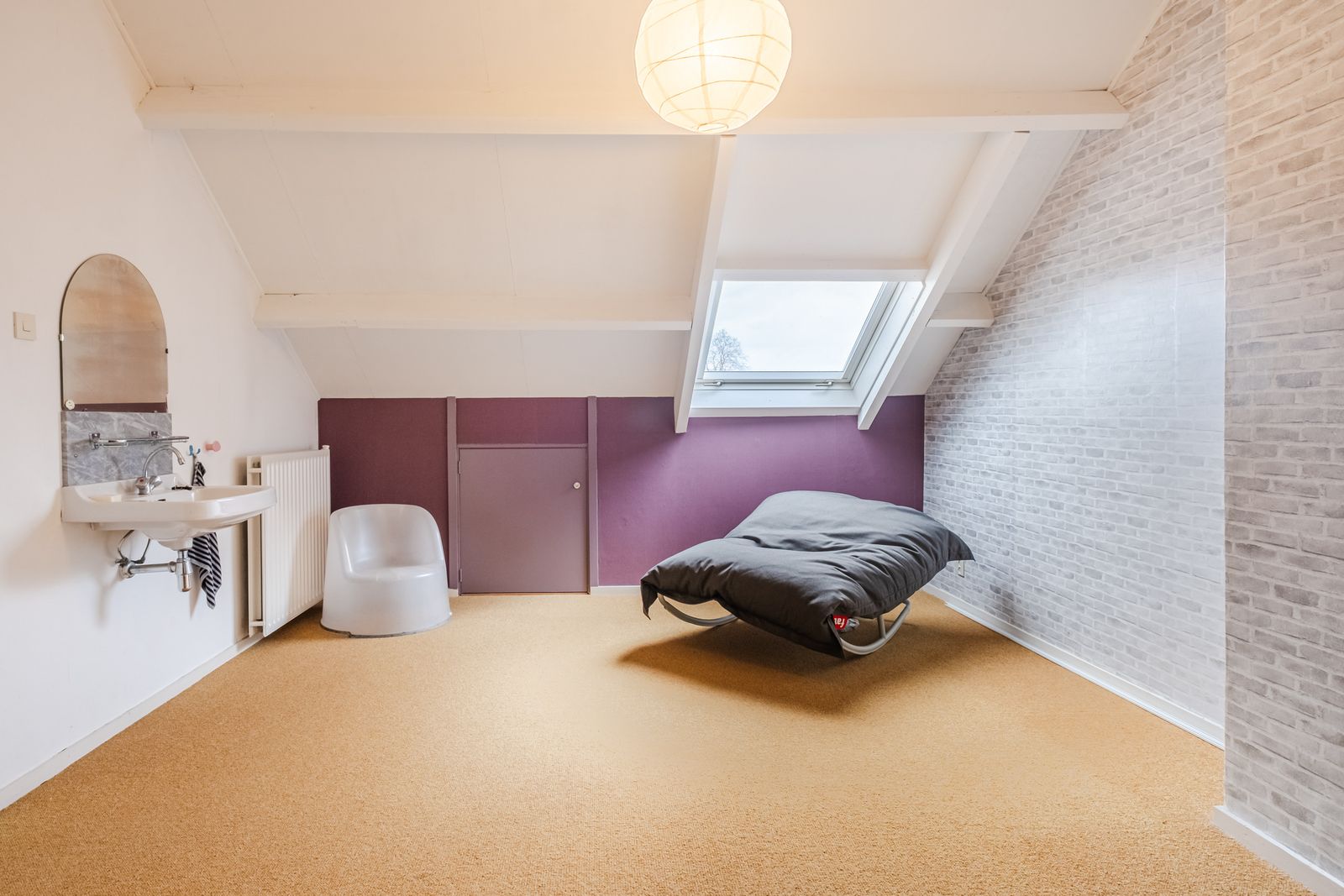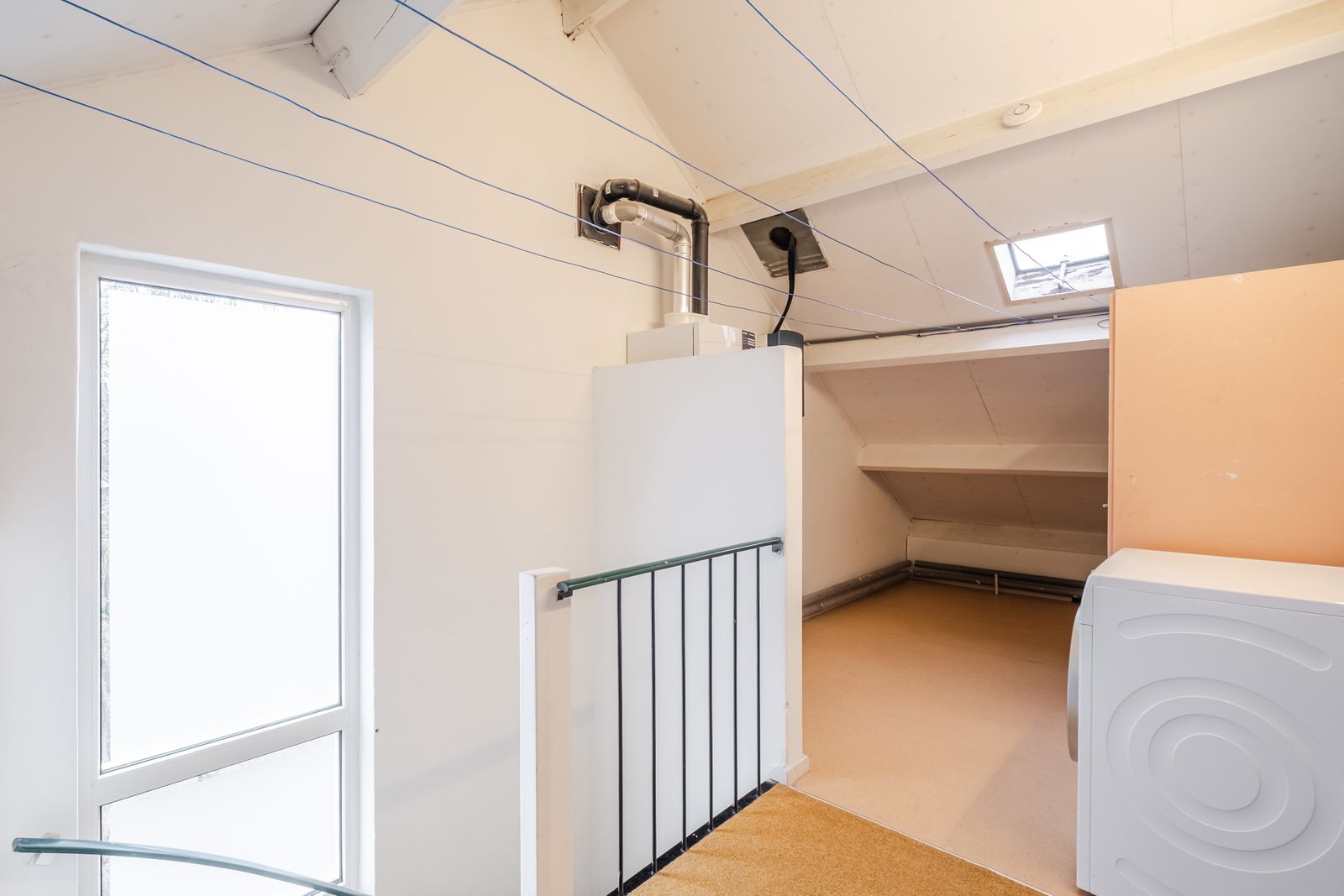 Vaste trap naar grote zolder met wastafel. Deze is voorzien van 2 dakramen. Hier bevind zich ook de cv ketel en de aansluitingen voor wasmachine en droger.