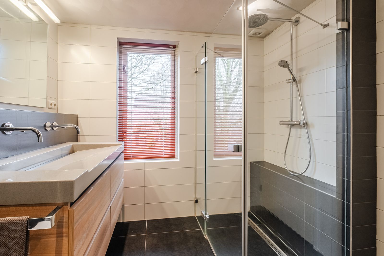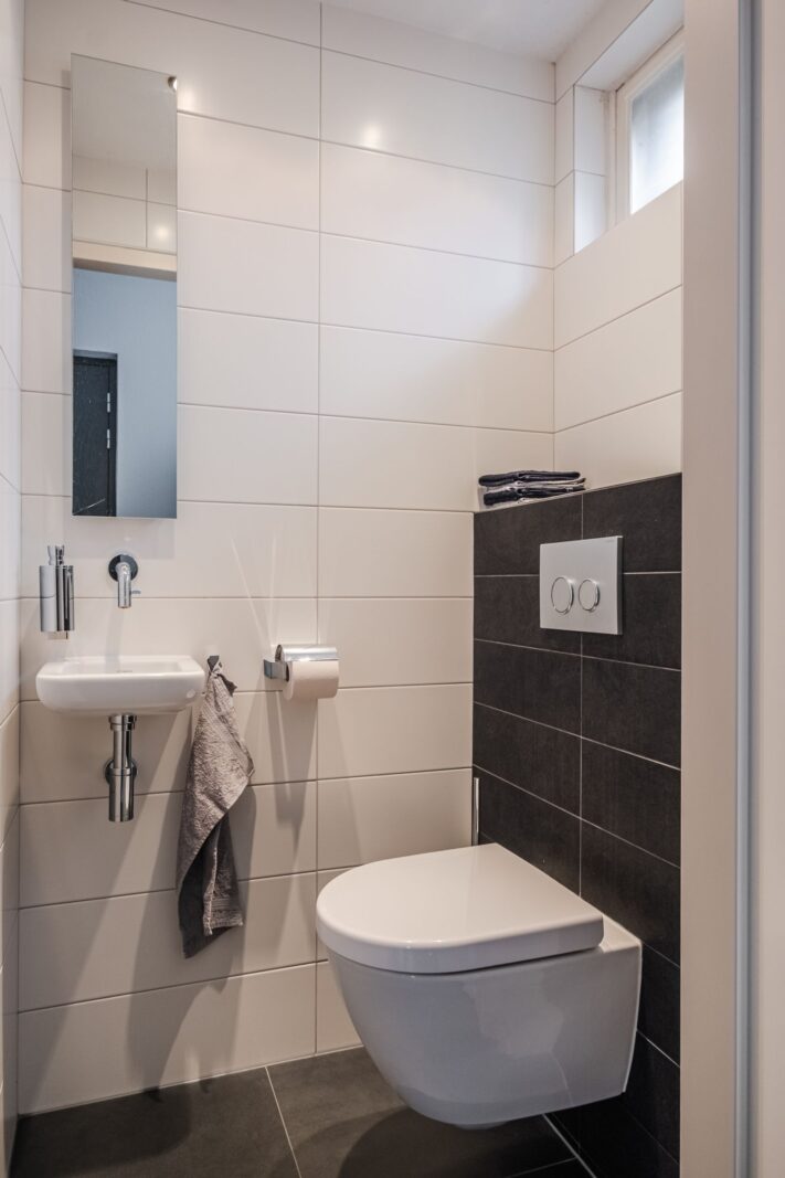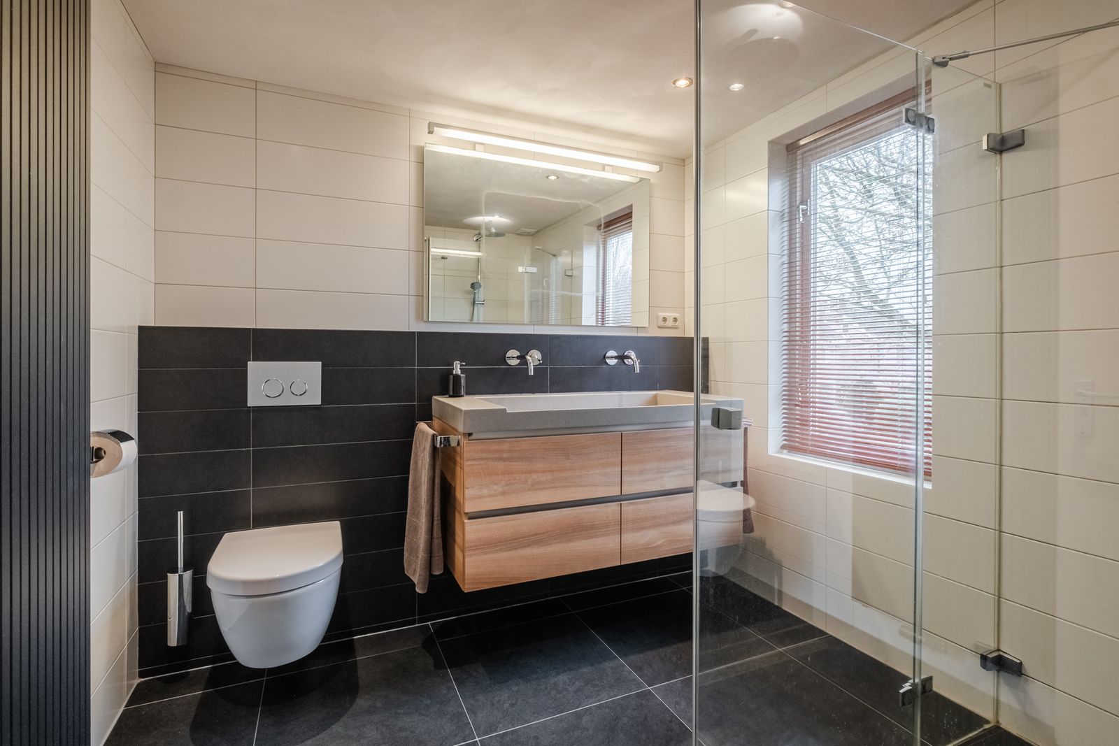 Mooie en praktische ingedeelde badkamer voorzien van hangend toilet en wastafel meubel.