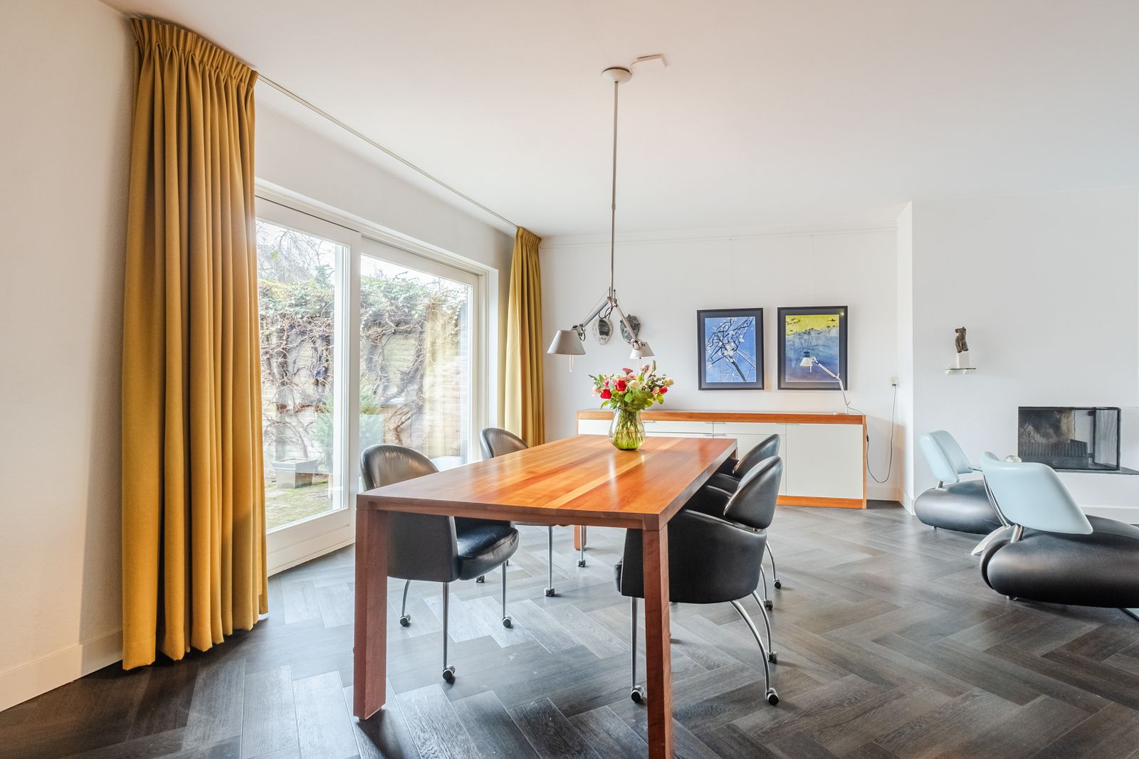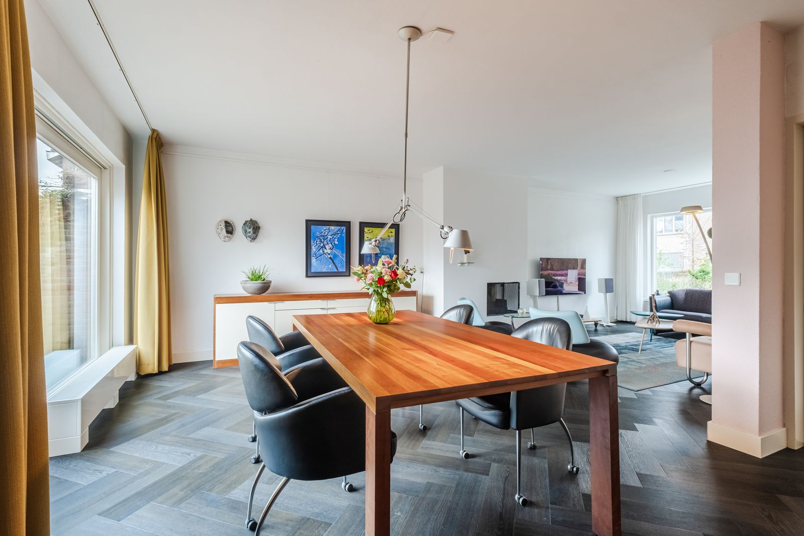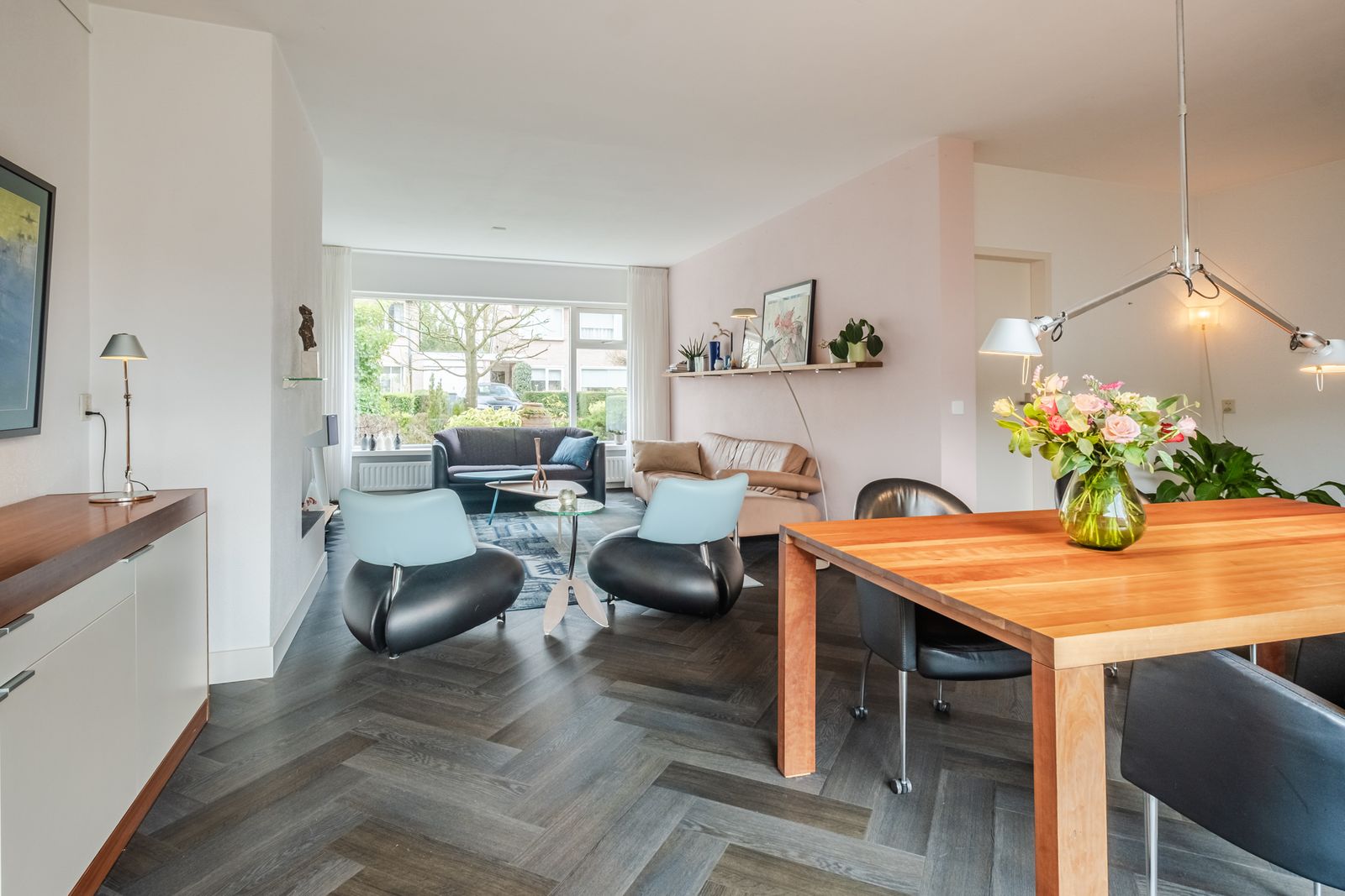 Ruime, woonkamer in l-vorm. Pvc vloer vis graat gelegd;