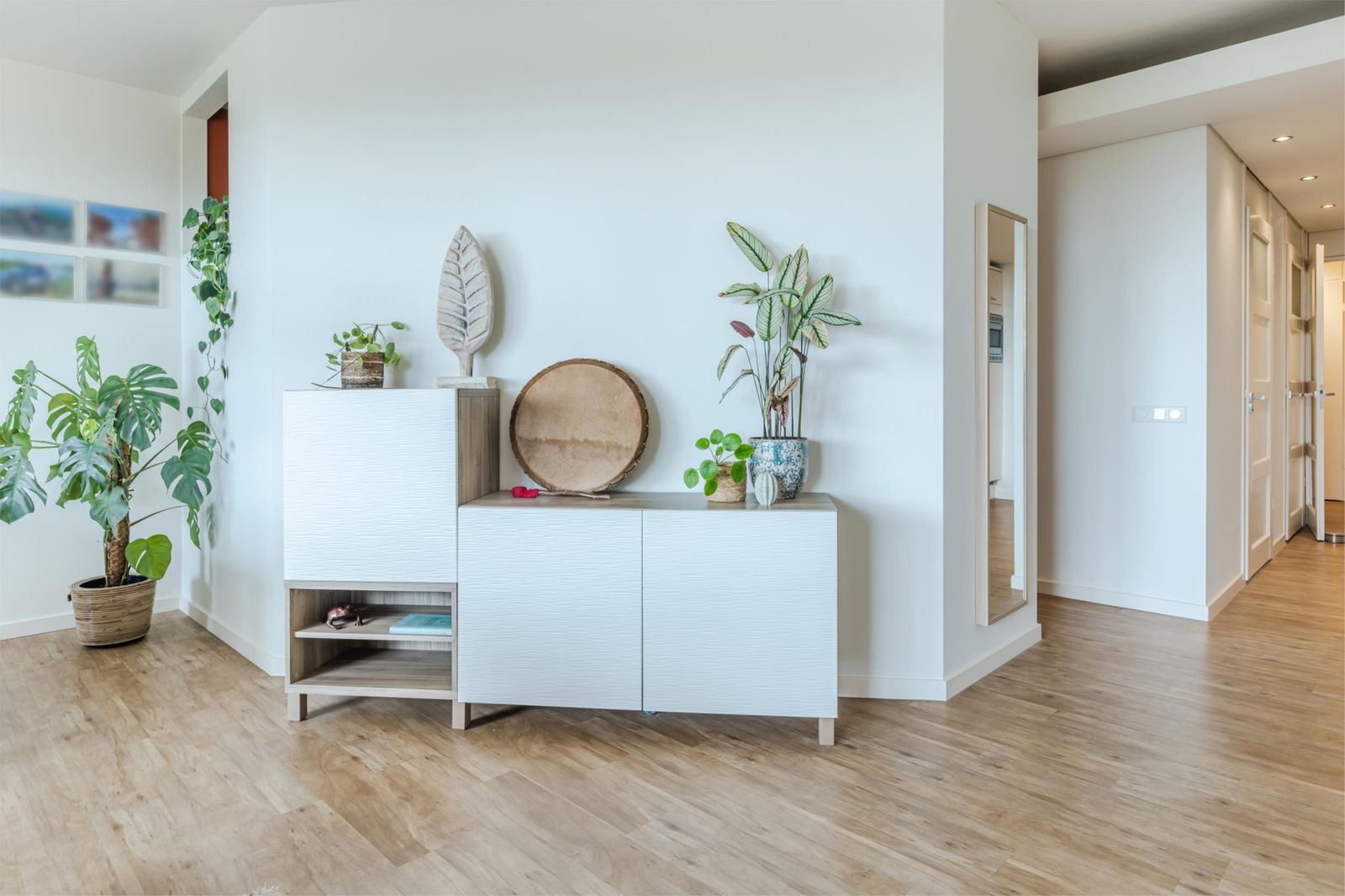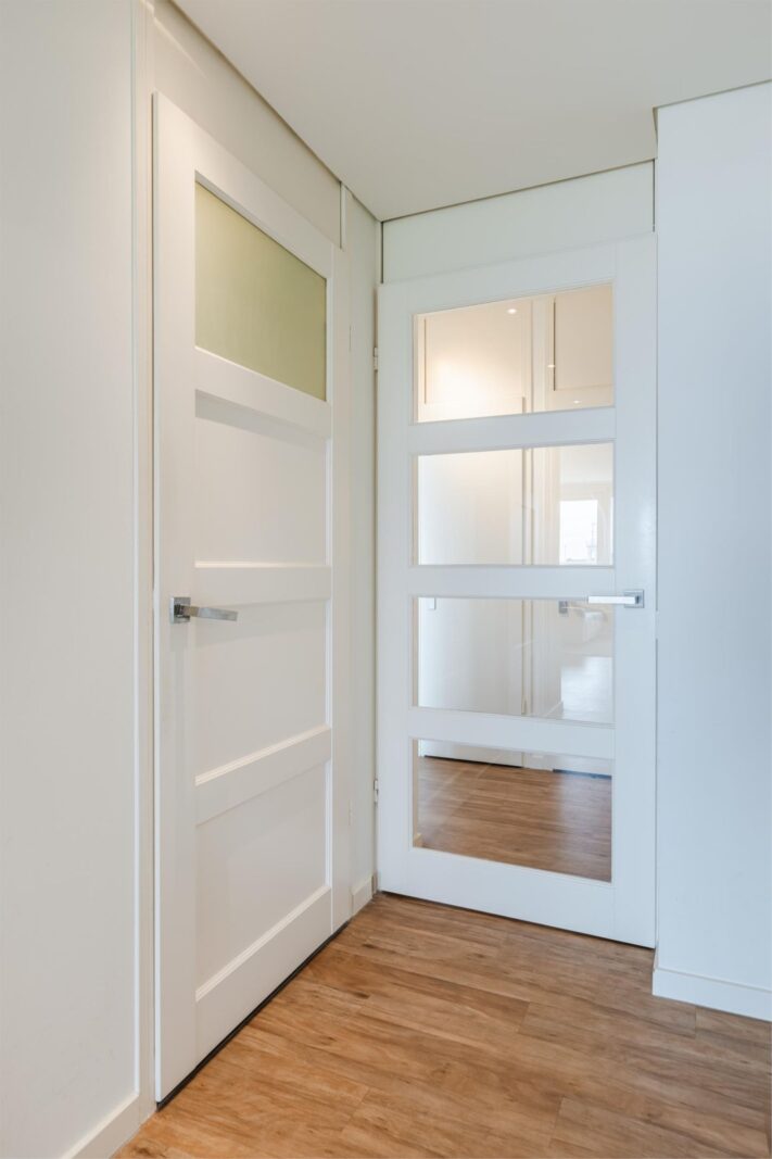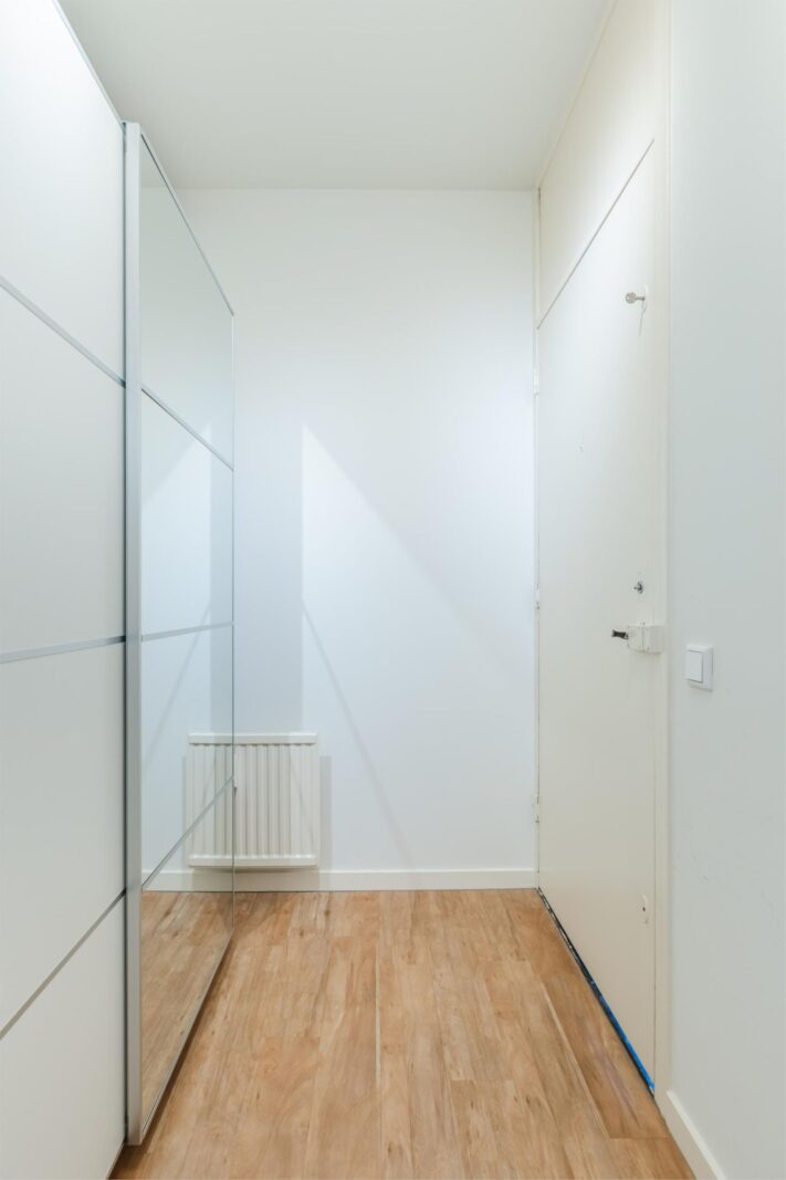 De woning zelf bevindt zich op de zesde verdieping, bereikbaar via twee liften. Eenmaal binnen komt u in een verzorgde hal met een ruime kast voor kleding en andere spullen. Hier vindt u ook het separate toilet en de meterkast.