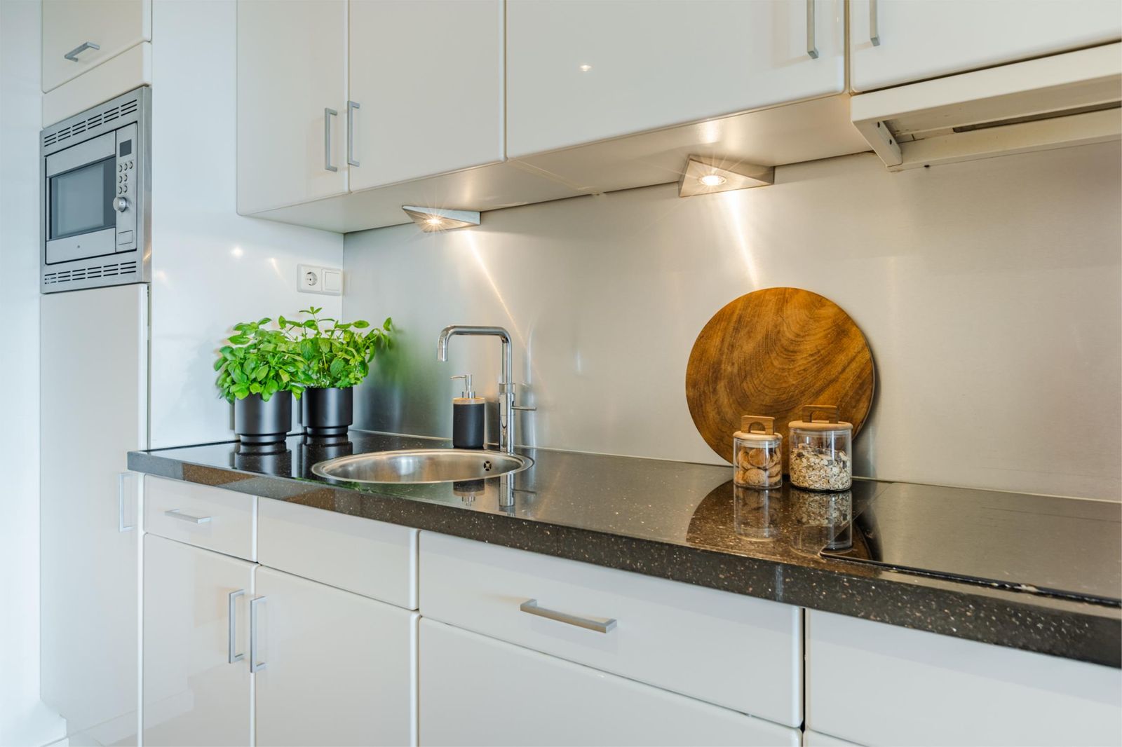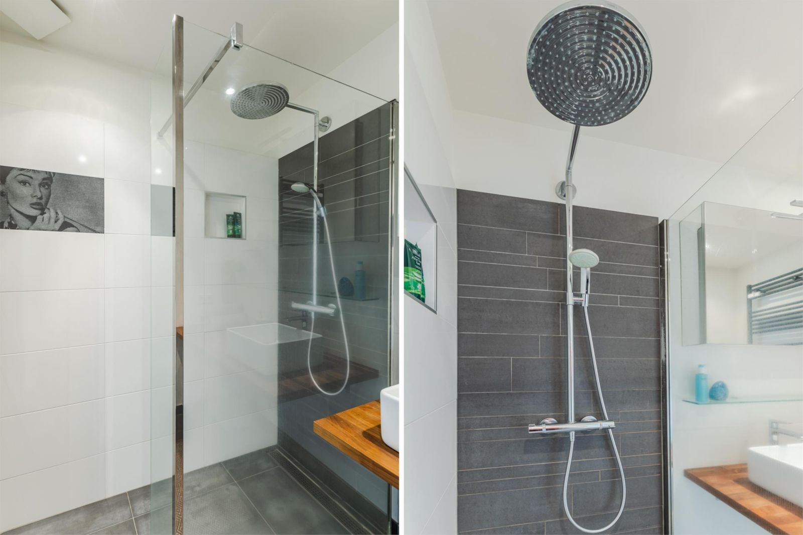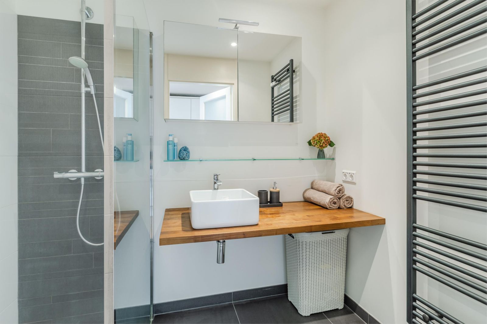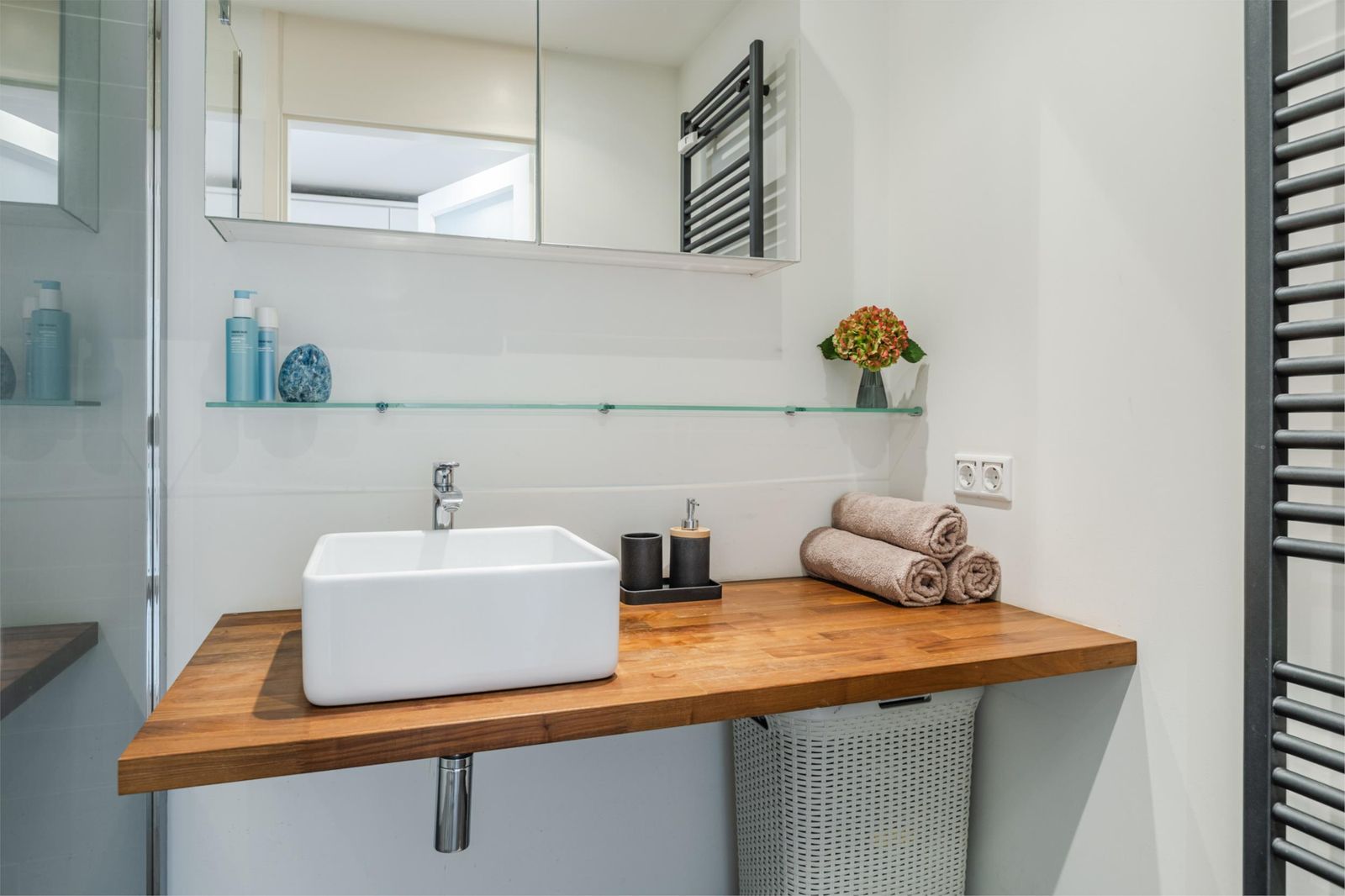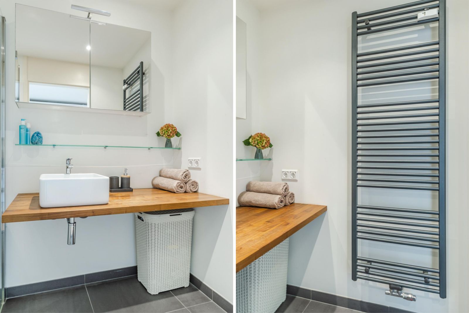 De keuken vormt het hart van de woning, open, licht en in verbinding met de woonkamer. Aangrenzend is een praktische wasruimte met extra opbergruimte. De badkamer is sfeervol en verzorgd, met een ruime regendouche, een houten wastafelblad, handdoekradiator en warme details.