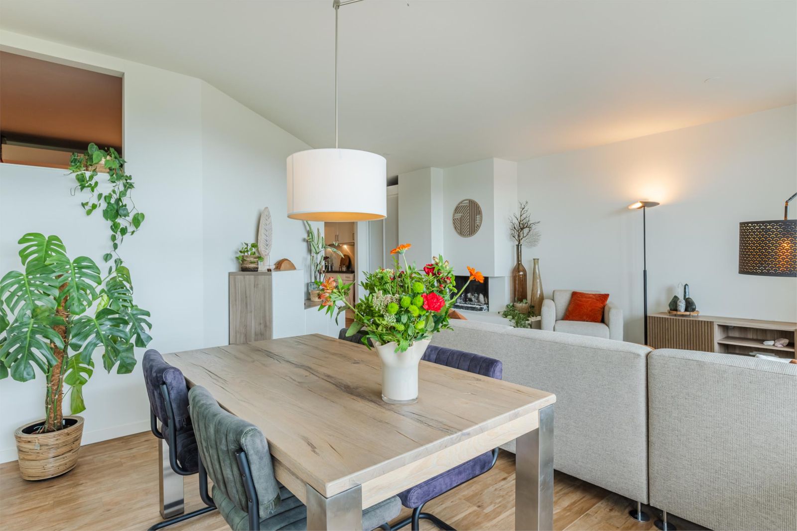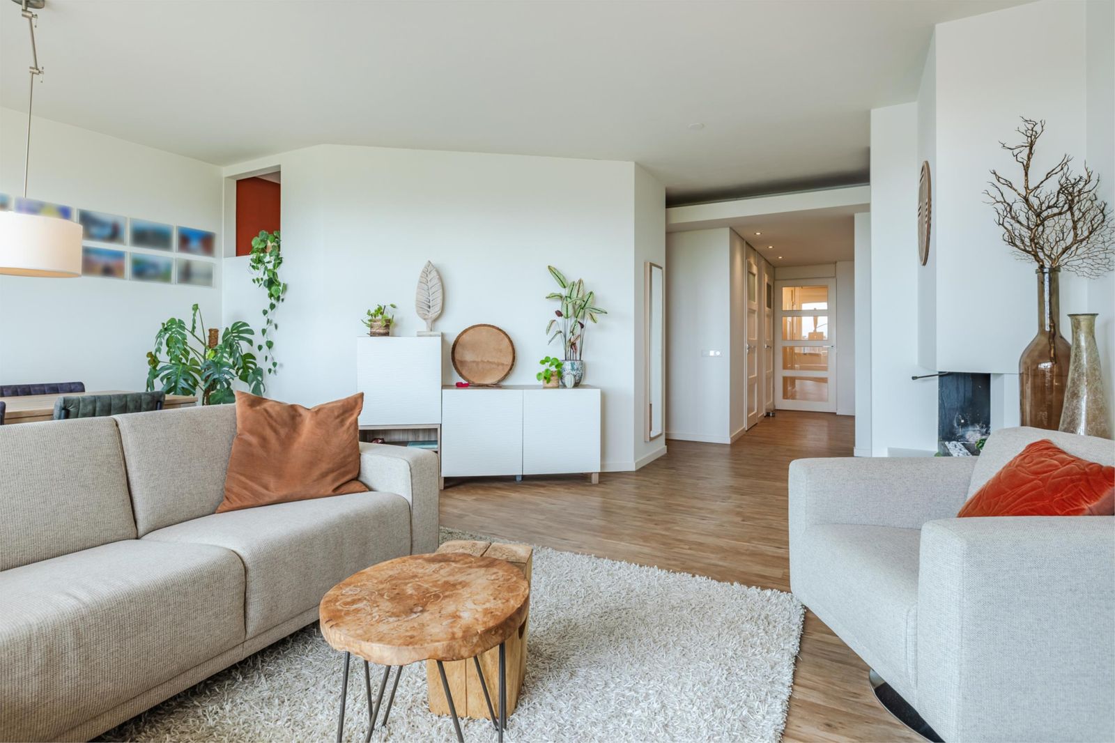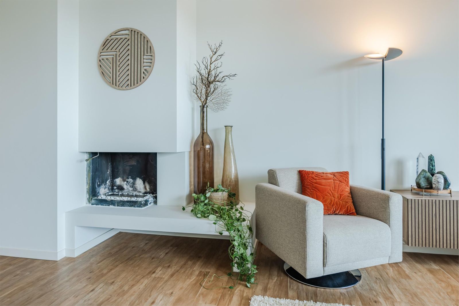 De woonkamer is royaal en licht, met een glazen pui over de volledige breedte waardoor het daglicht rijkelijk binnenvalt. De sfeer is open en zuiver – een plek om écht thuis te komen. De open haard voegt extra karakter toe.