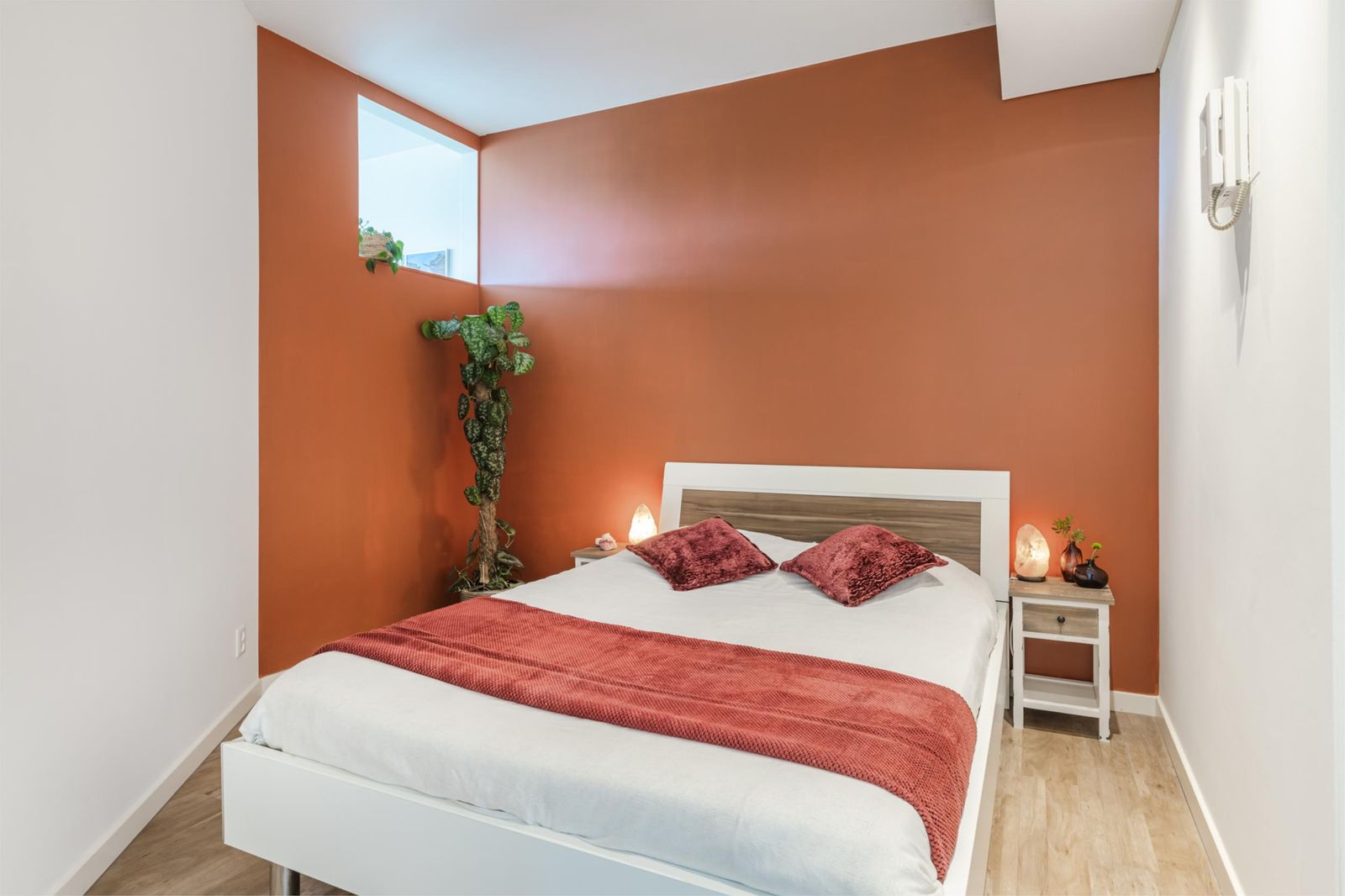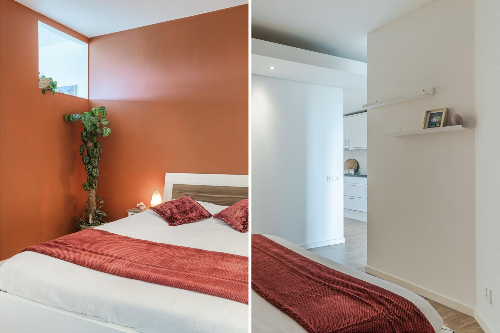 De slaapkamer, grenzend aan de woonkamer, is stil en beschut en u slaapt hier rustig. De pui is voorzien van rolluiken waarmee u de hele woning kunt verduisteren.