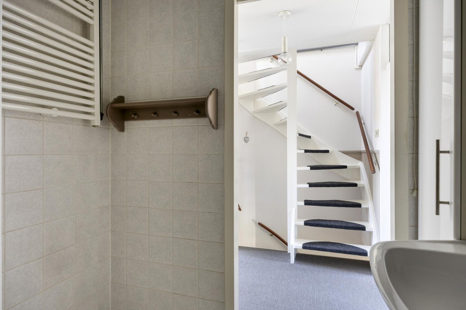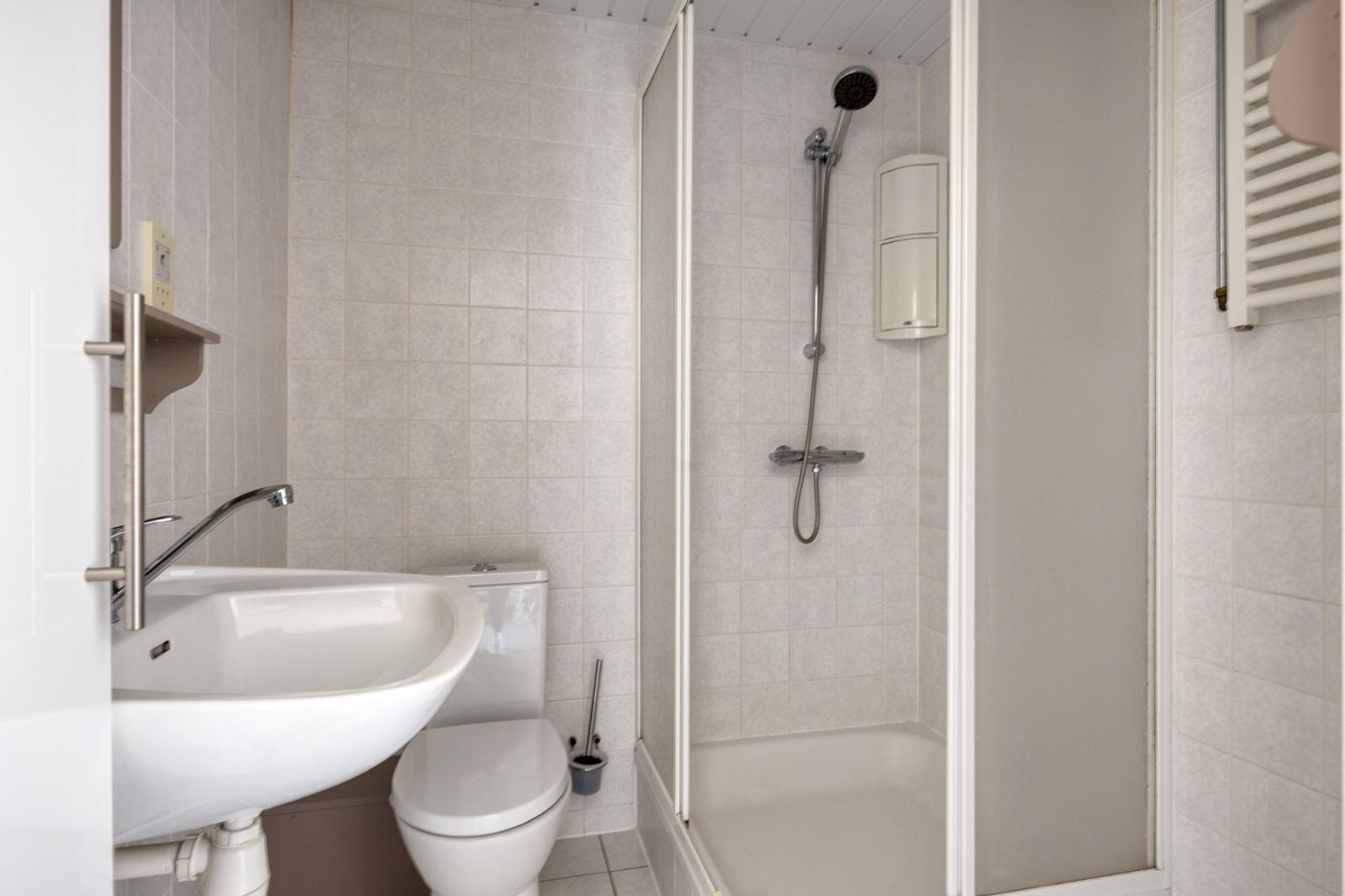 De badkamer is verzorgd en ingericht met een douche, een in 2018 vernieuwd toilet en een wastafel met spiegel en houten planchet. De ruimte is volledig betegeld in lichte tinten en voorzien van een verlaagd plafond.