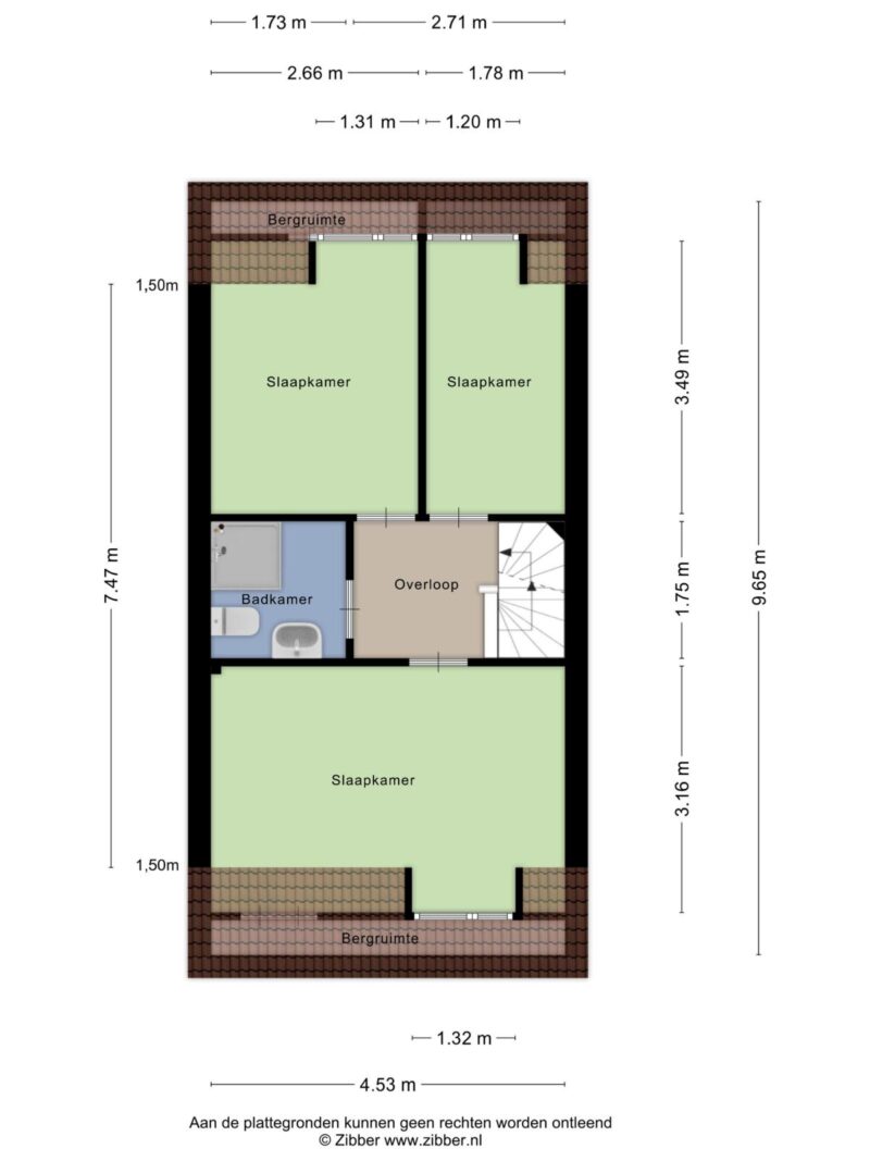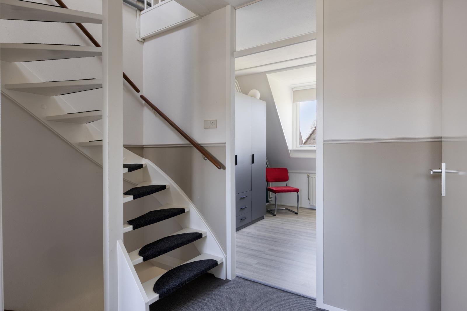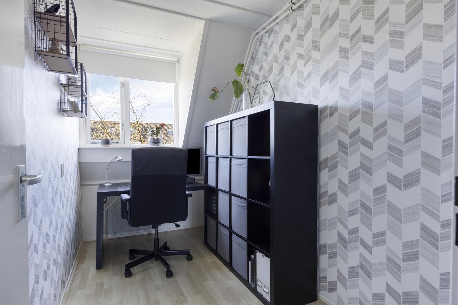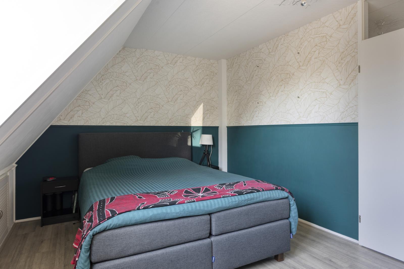 Op deze verdieping bevinden zich drie verrassend ruime slaapkamers, mede dankzij het schuine dak en de dakkapellen. Alle kamers zijn netjes afgewerkt en voorzien van laminaat. Aan de voorzijde ligt de royale hoofdslaapkamer van ruim 4,5 meter breed. De twee slaapkamers aan de achterzijde worden momenteel gebruikt als logeer- en werkkamer. Extra bergruimte is aanwezig in de schuine delen van het dak.