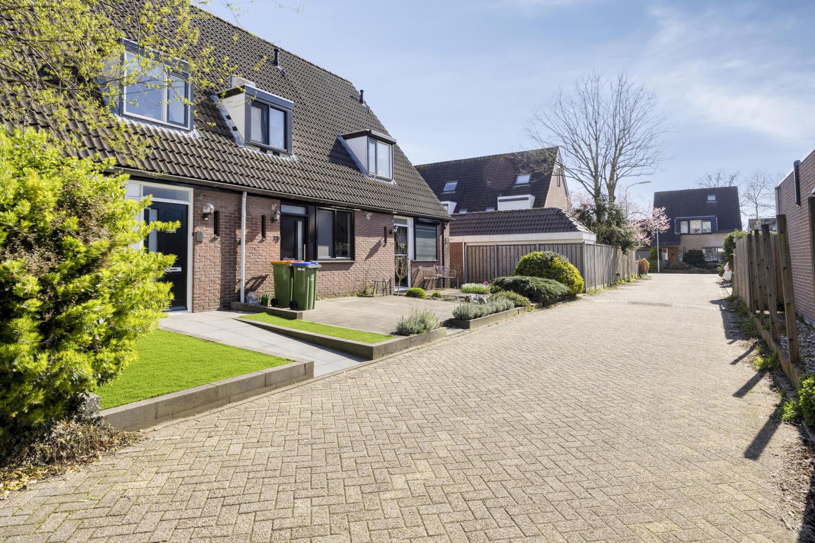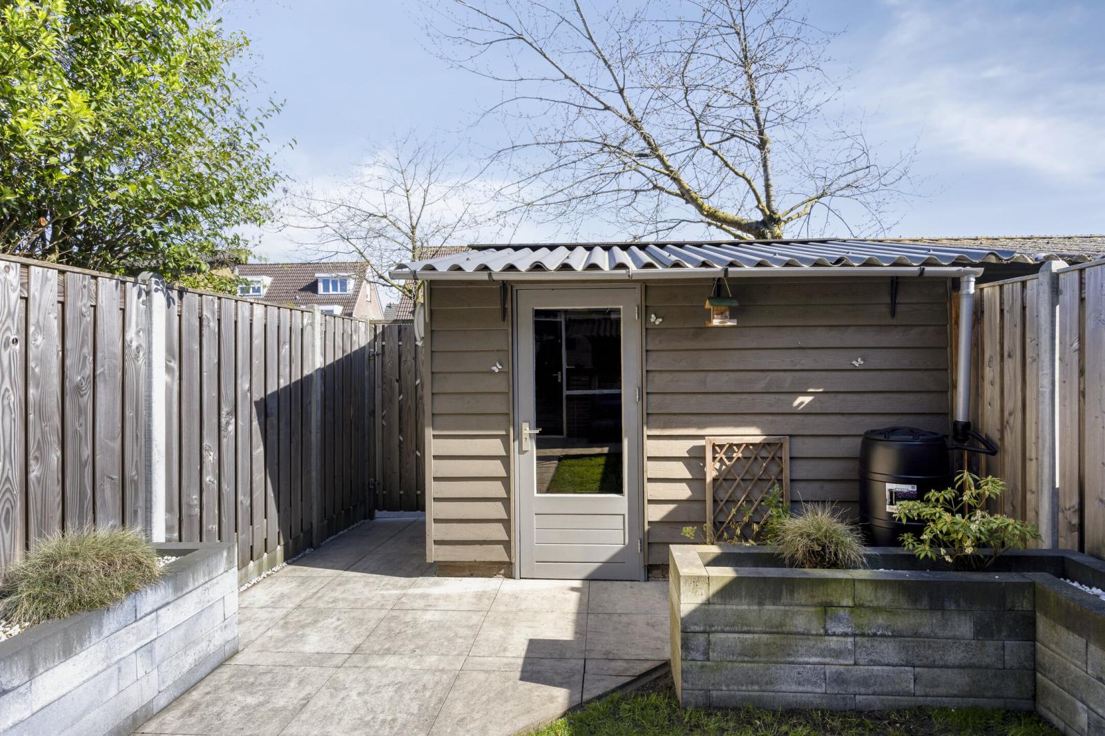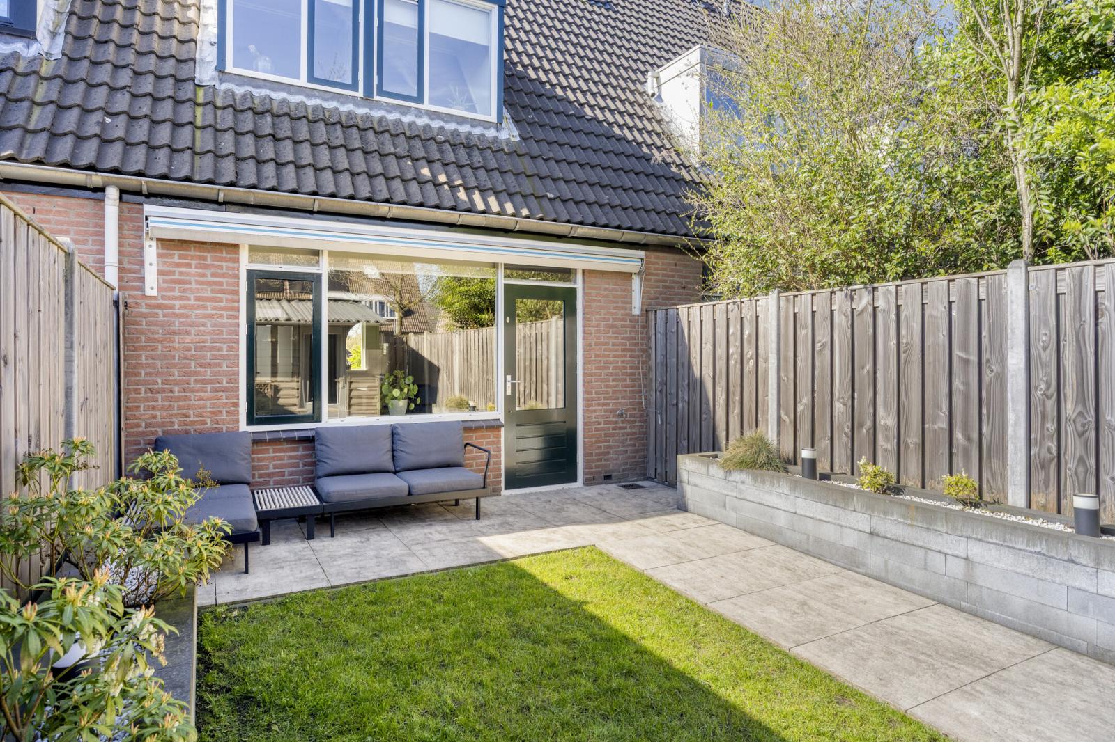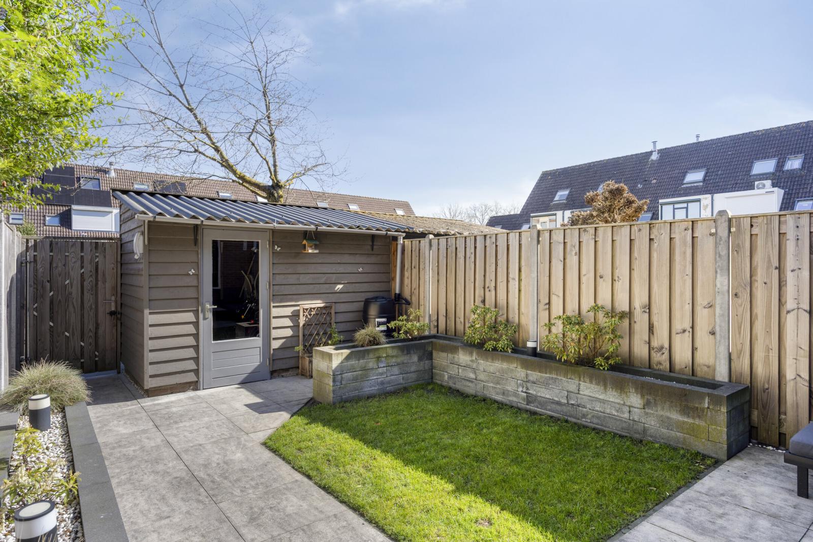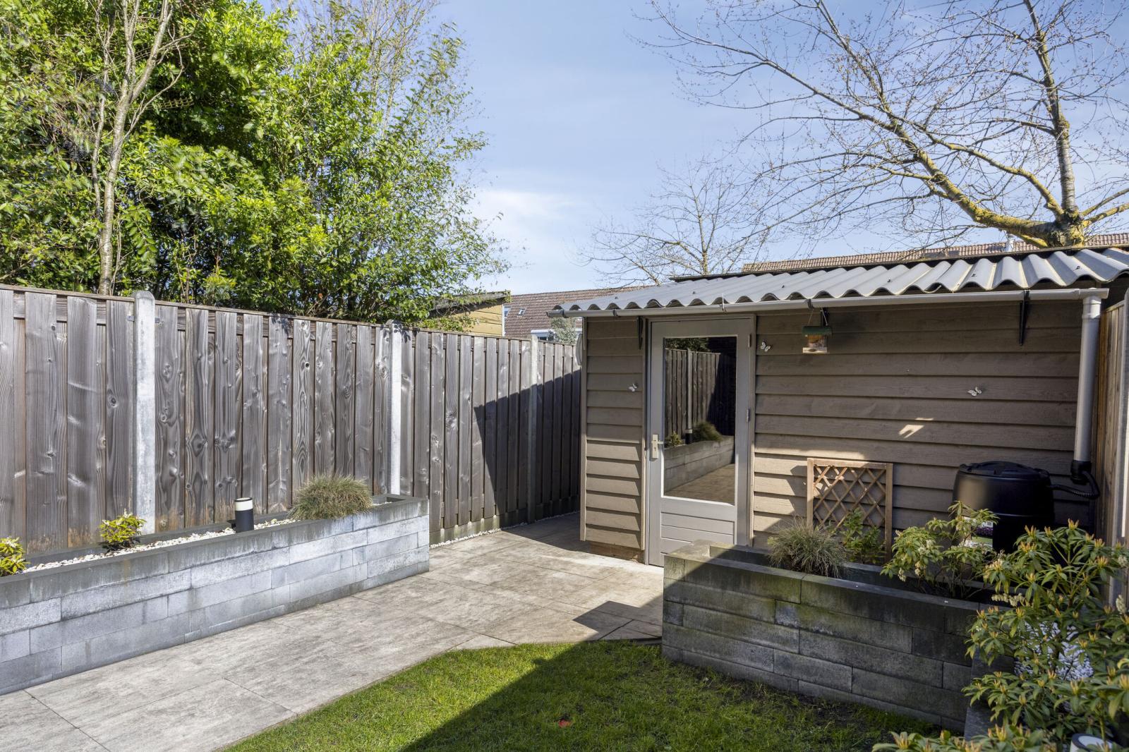 De voortuin is in 2020 vernieuwd met grote keramische tegels en kunstgras. De achtertuin, aangelegd in 2021 en gelegen op het oosten, is bereikbaar vanuit de woonkamer. Hier vind je natuurstenen tegels, gras, nette schuttingen en plantenbakken van stapelblokken. Achterin de tuin bevindt zich de berging met een vernieuwd dak en een poort met toegang tot het pleintje, speeltuintje voor de kinderen en de parkeerplaats.