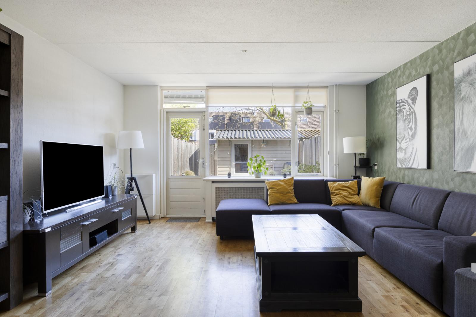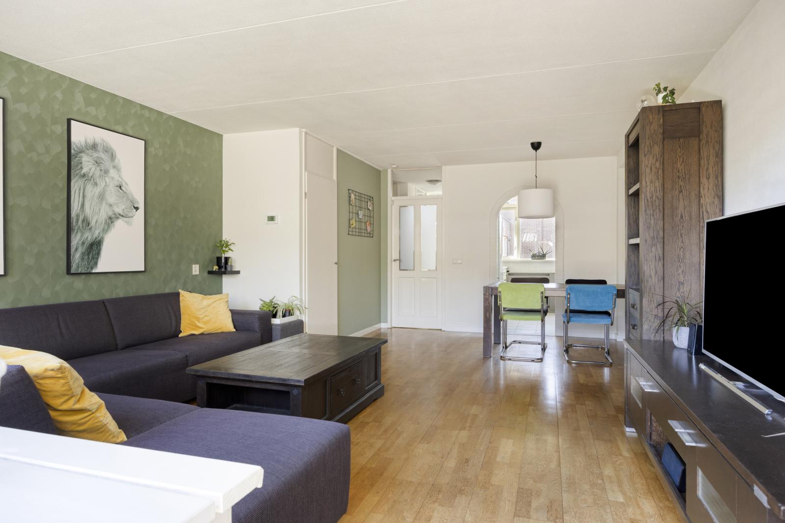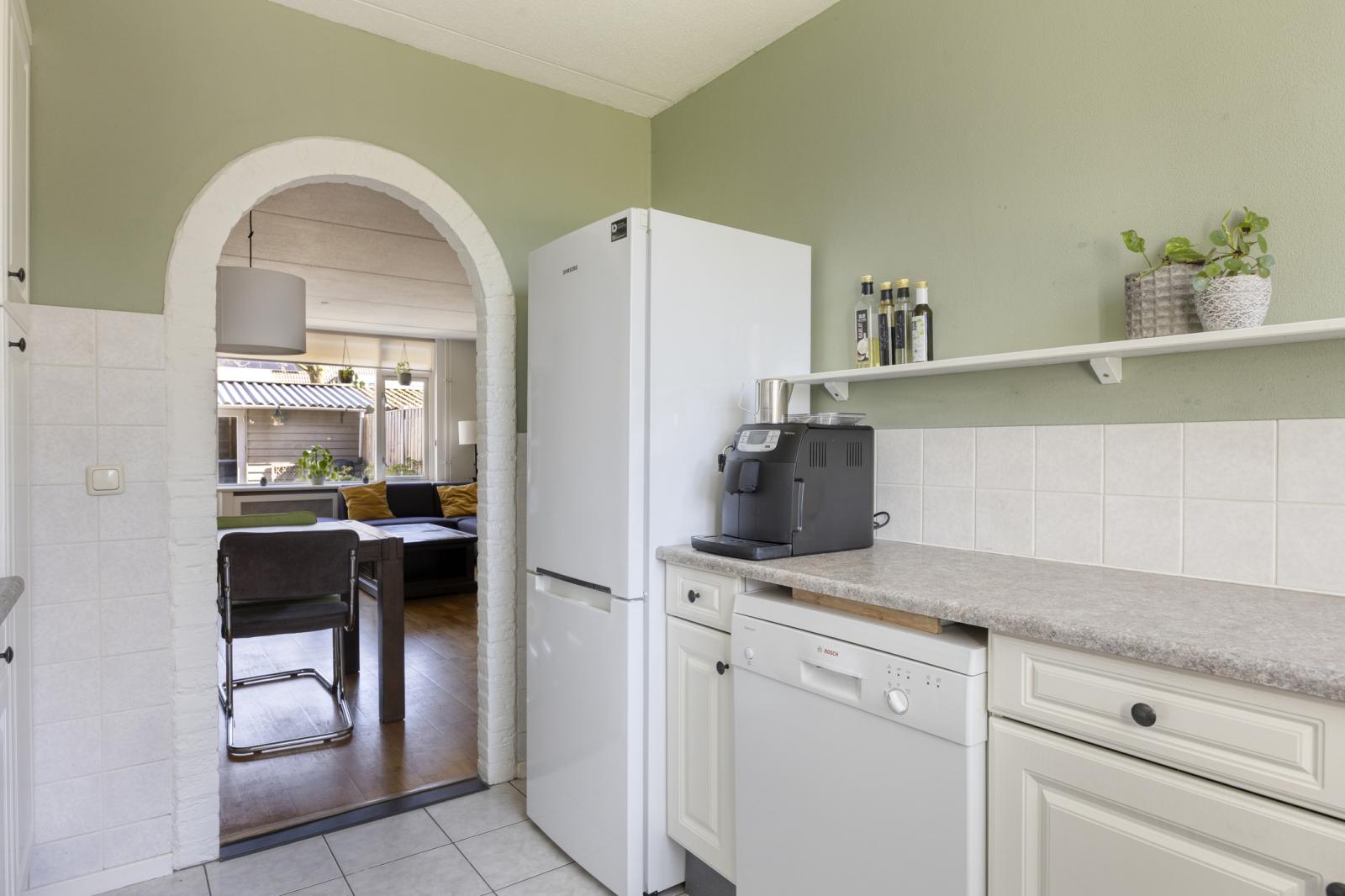 De woonkamer, met een diepte van ruim 6,5 meter, is een gezellige leefruimte met uitzicht op de tuin, een deur naar het terras en een praktische trapkast. De laminaatvloer combineert mooi met het behang en de wandafwerking. Aan de tuinzijde bevindt zich het zitgedeelte, terwijl er bij de keuken voldoende ruimte is voor een grote eettafel. De keuken heeft een dubbele wandopstelling met veel opbergruimte, twee werkbladen en diverse inbouwapparatuur, waaronder een gaskookplaat, afzuigkap en oven. Ook zijn er een vaatwasser en een koel-vriescombinatie aanwezig.