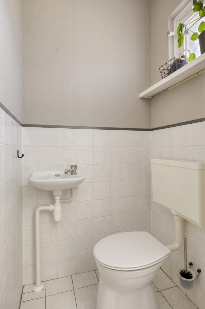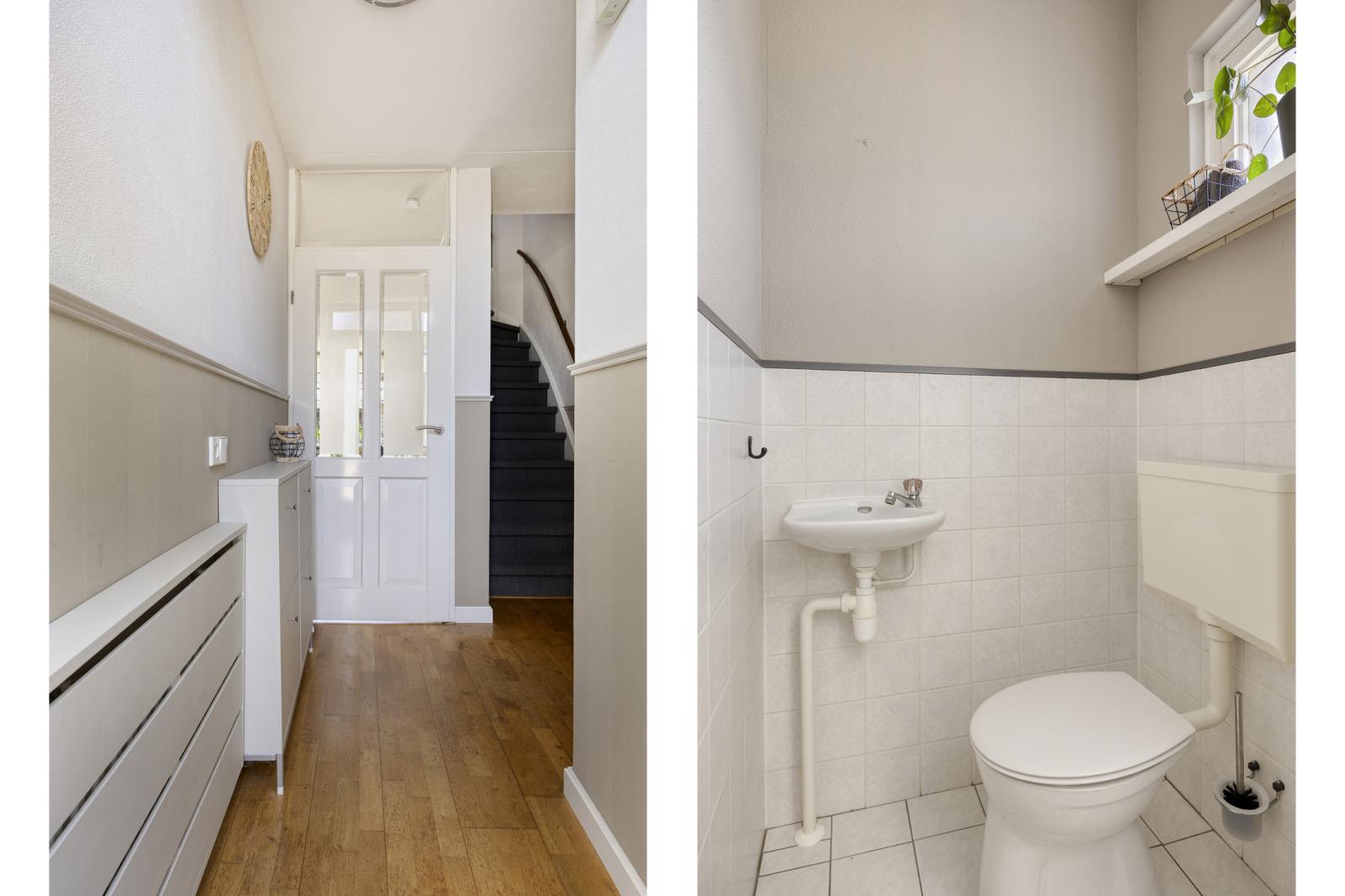 De voortuin is in 2020 opnieuw aangelegd en voorzien van een breed pad naar de voordeur. Vanuit de hal heb je toegang tot de woonkamer, meterkast en een nette toiletruimte met fonteintje. De hal is voorzien van een laminaatvloer, een geschilderde lambrisering en een trap met tapijt. Daarnaast is er een moderne radiatorombouw geplaatst en is de deur naar de woonkamer vervangen door een paneeldeur met glas.