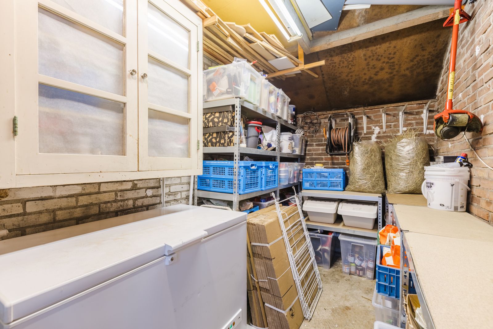 Een bijzonder sfeervolle en gezellige woonkamer met een fraaie houten vloer van brede planken. De wanden zijn strak afgewerkt, deels voorzien van een houten lambrisering en een in lichte kleuren geschilderd houten schroten plafond. De afmetingen van de raampartijen in de voor- en achtergevel zorgen voor veel lichtinval en completeren de aantrekkelijke uitstraling van deze woonkamer.