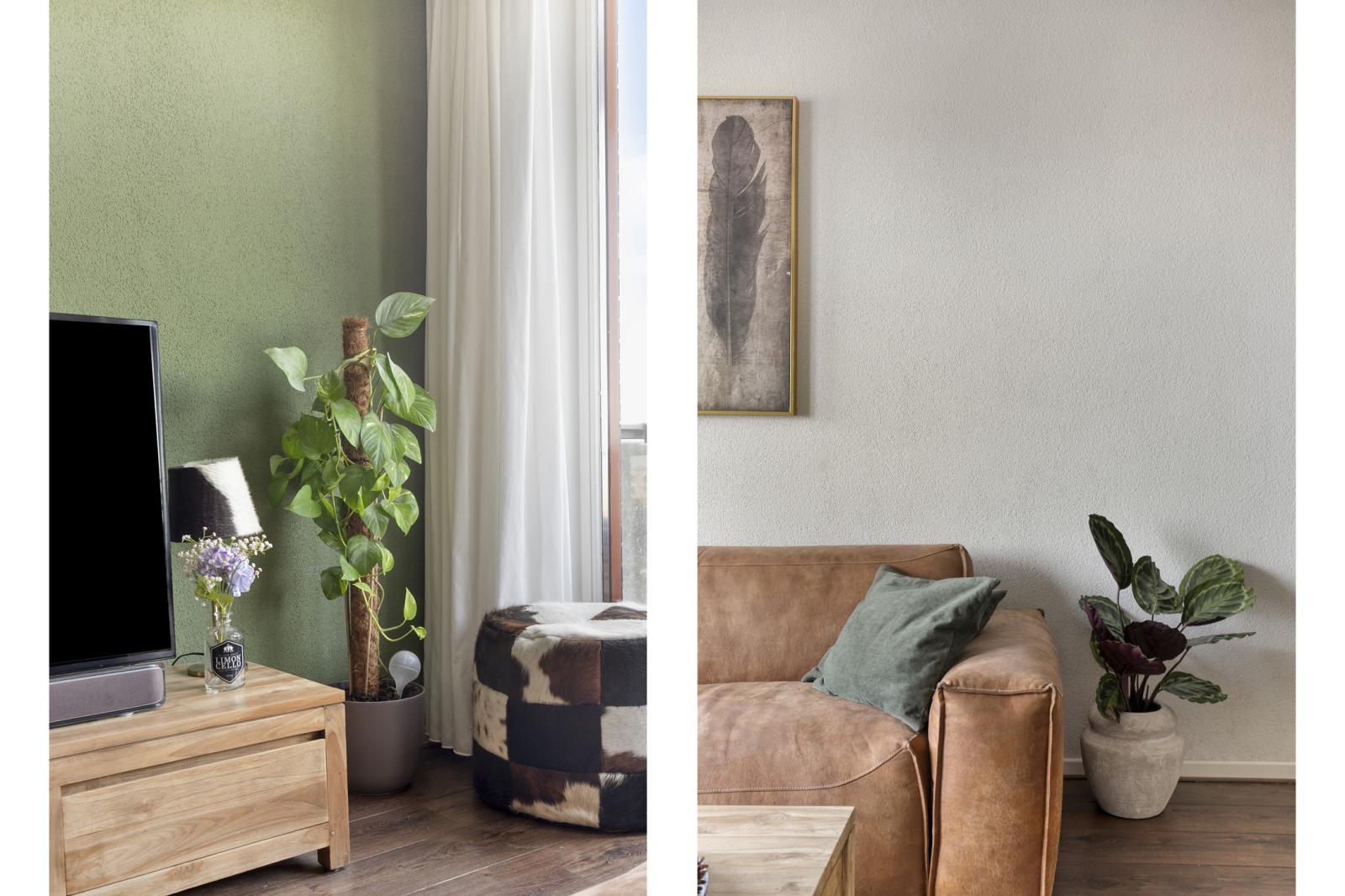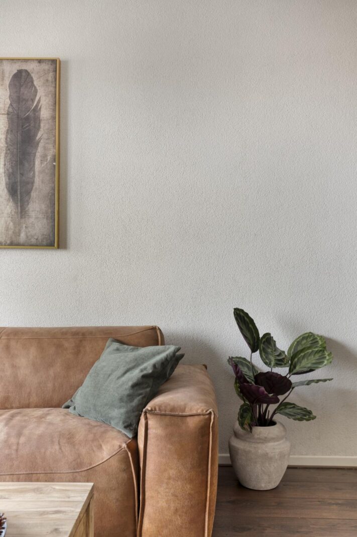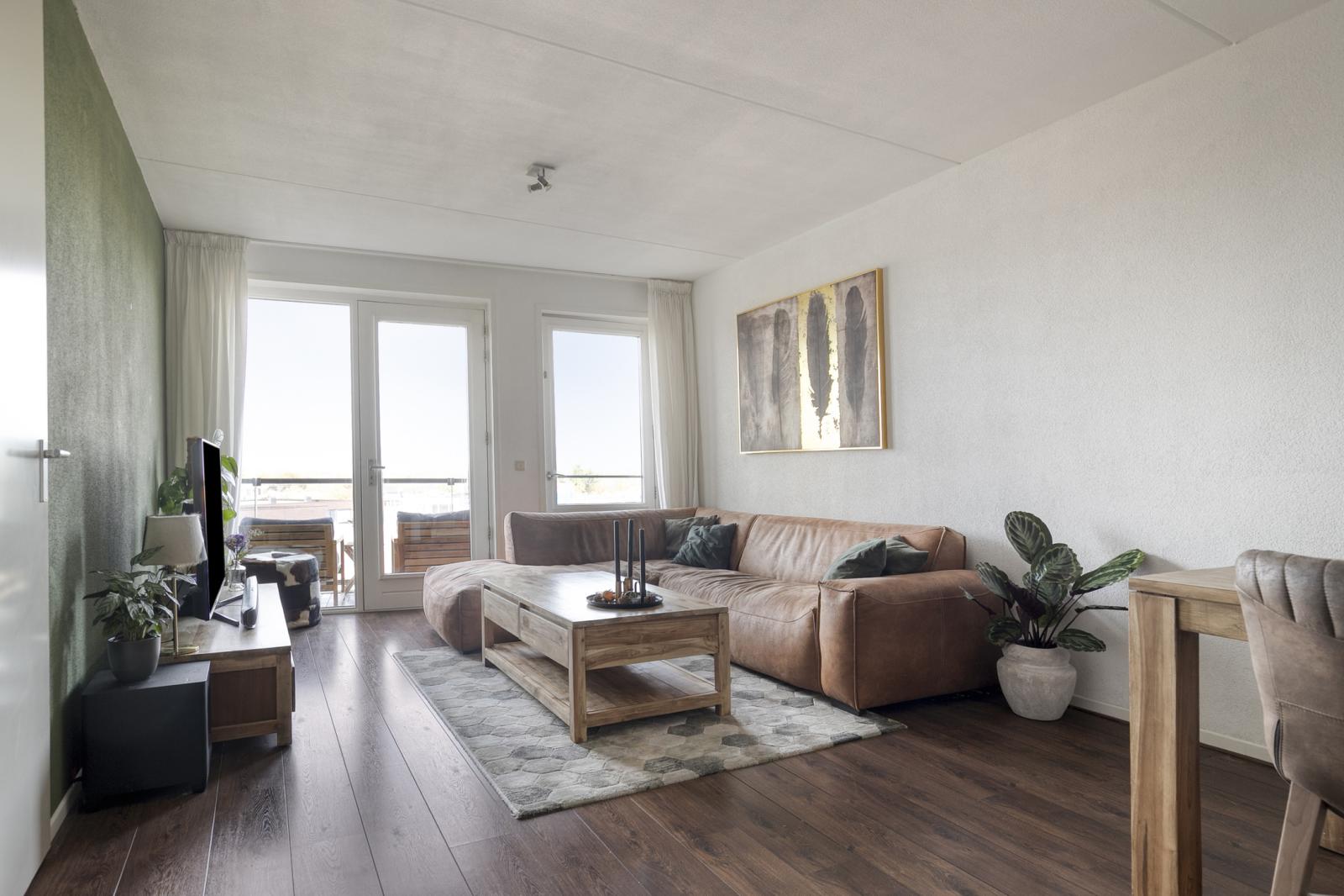 De ruime woonkamer biedt een fijne lichtinval door de grote raampartijen en vormt het hart van de woning.