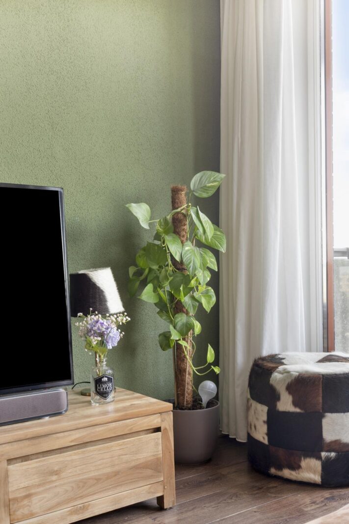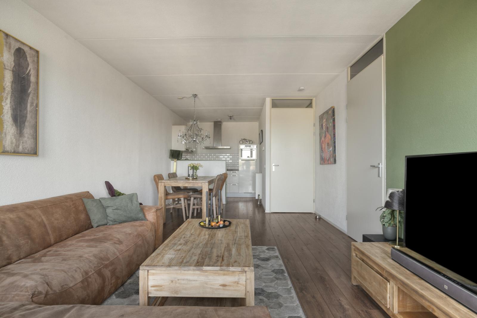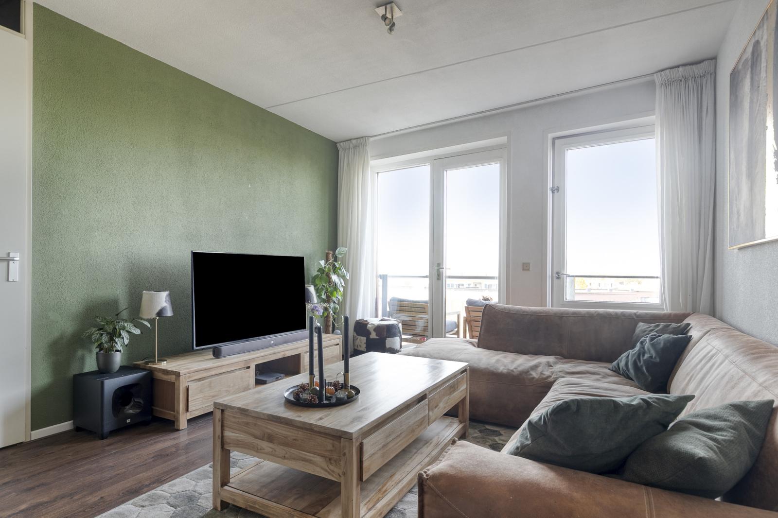De ruime woonkamer biedt een fijne lichtinval door de grote raampartijen en vormt het hart van de woning.