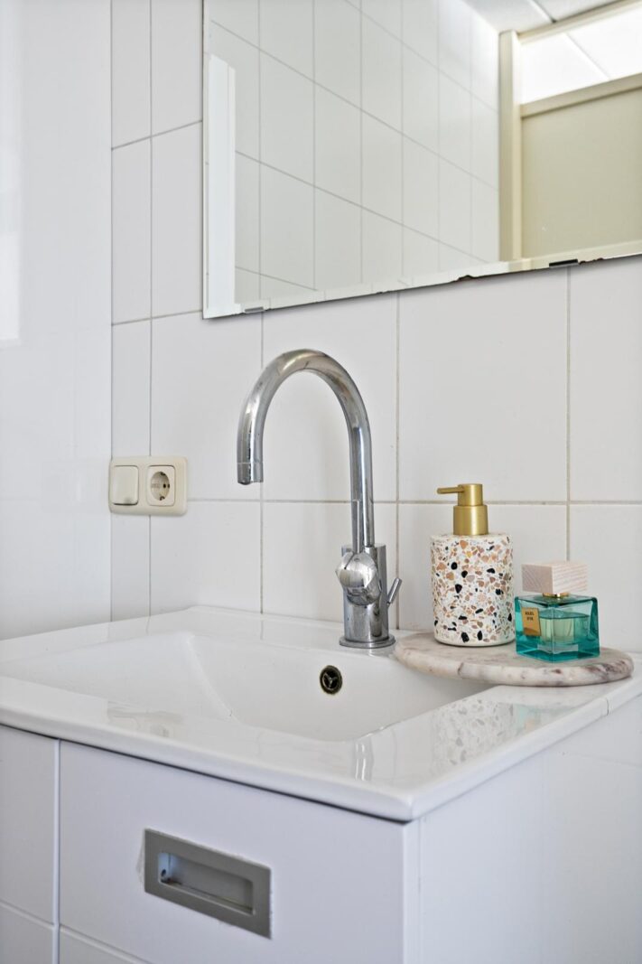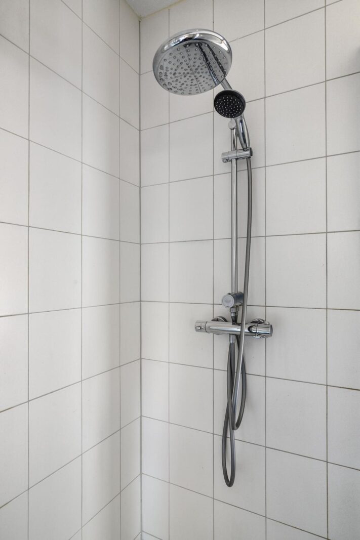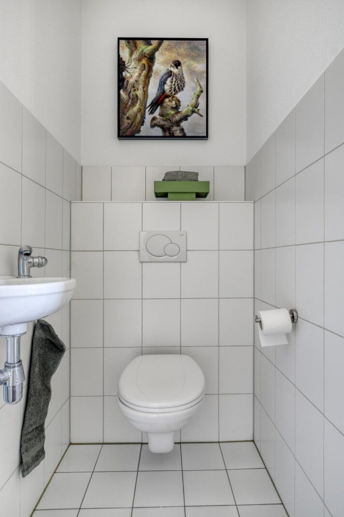 Het separate toilet, eveneens deels betegeld in wit en voorzien van een zwevend toilet, zorgt voor extra comfort en privacy voor jou en je gasten.