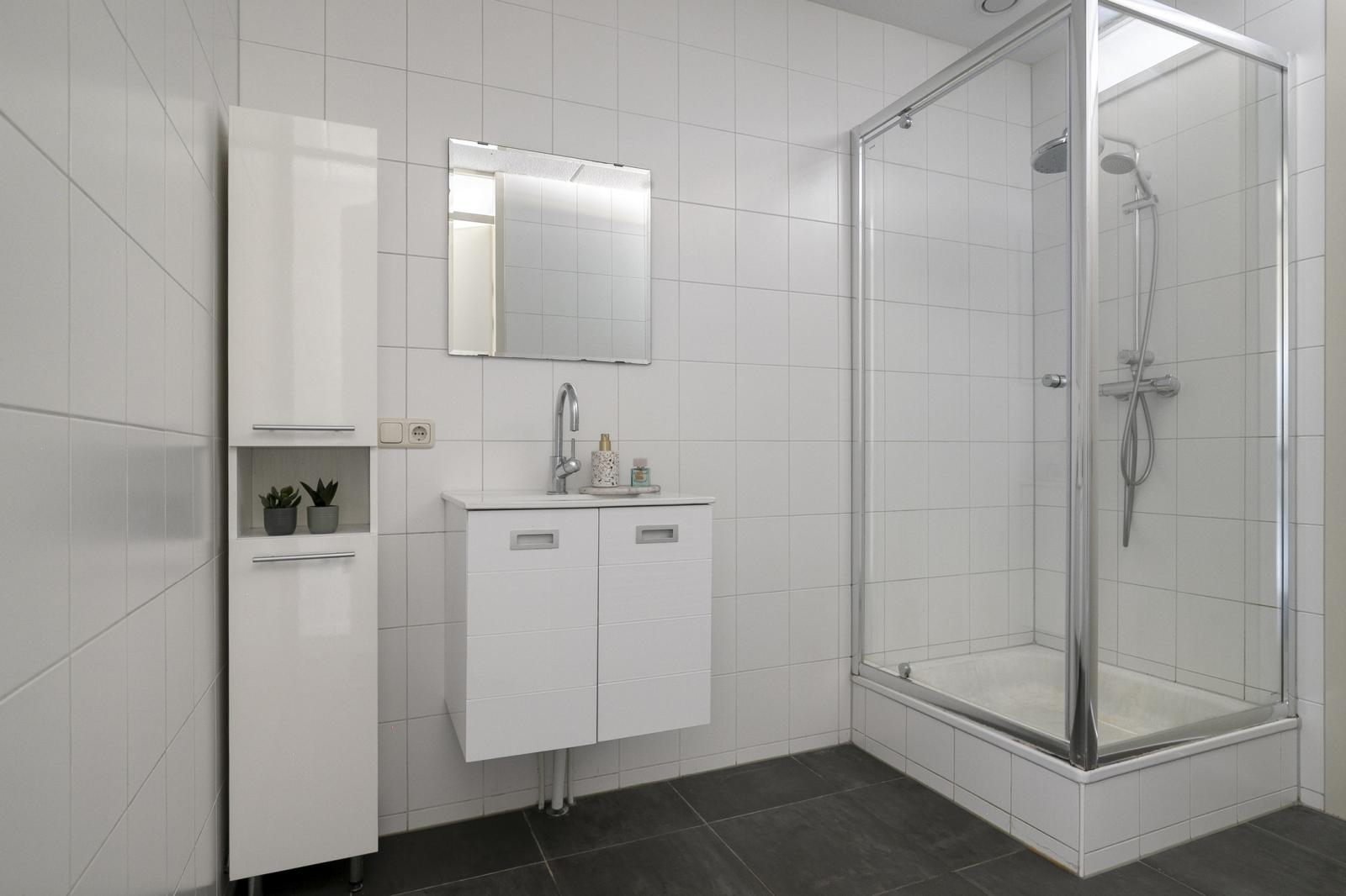 De ruimte beschikt over een ruime douche, een handig opbergkastje en een wastafelmeubel.
