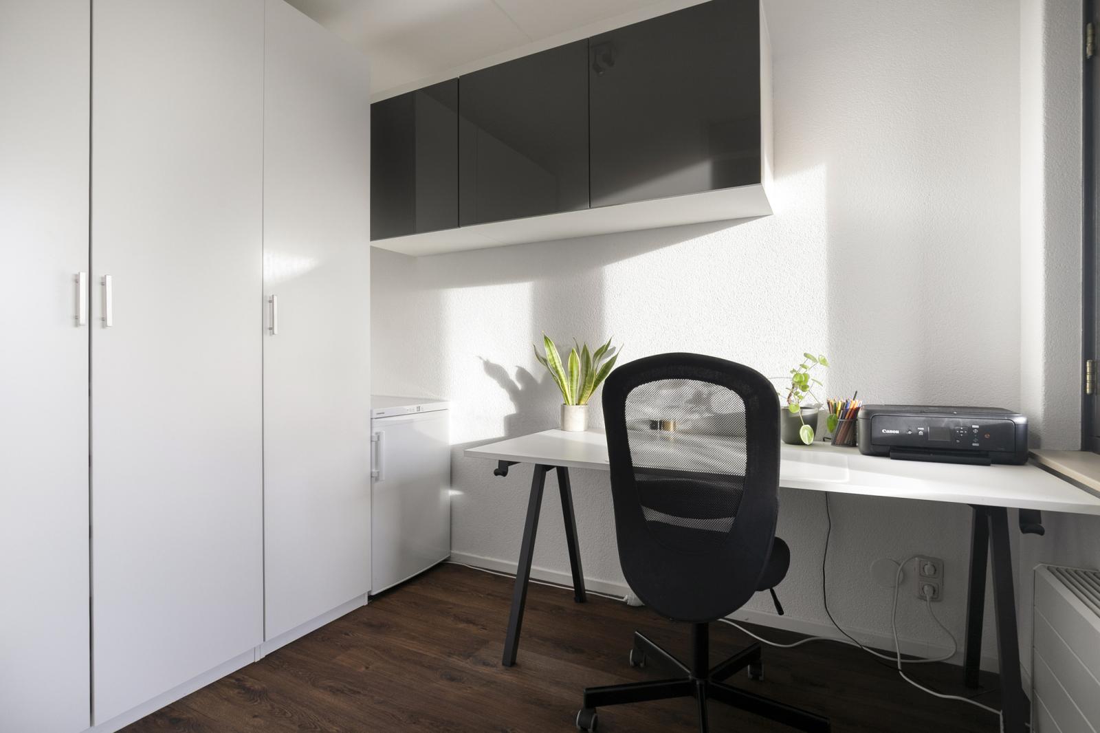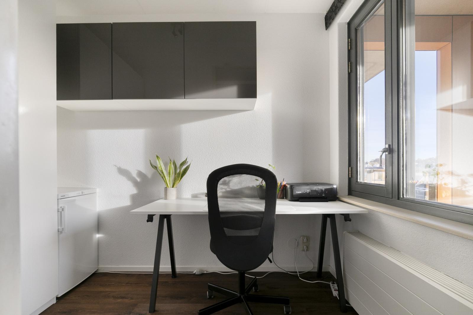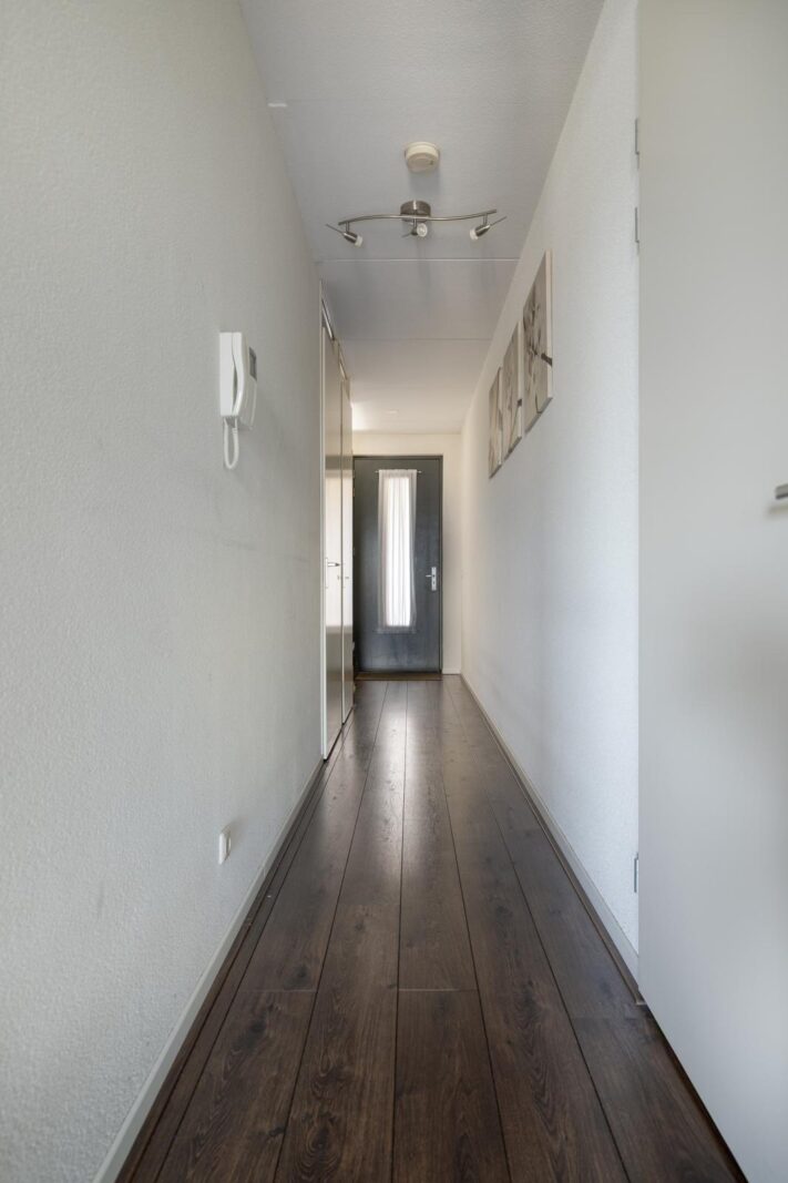 Via de voordeur stap je binnen in een lange hal die toegang biedt tot vrijwel alle ruimtes van de woning. Aan de galerijzijde bevindt zich de eerste slaapkamer, ideaal als logeerkamer, werkplek of hobbyruimte.