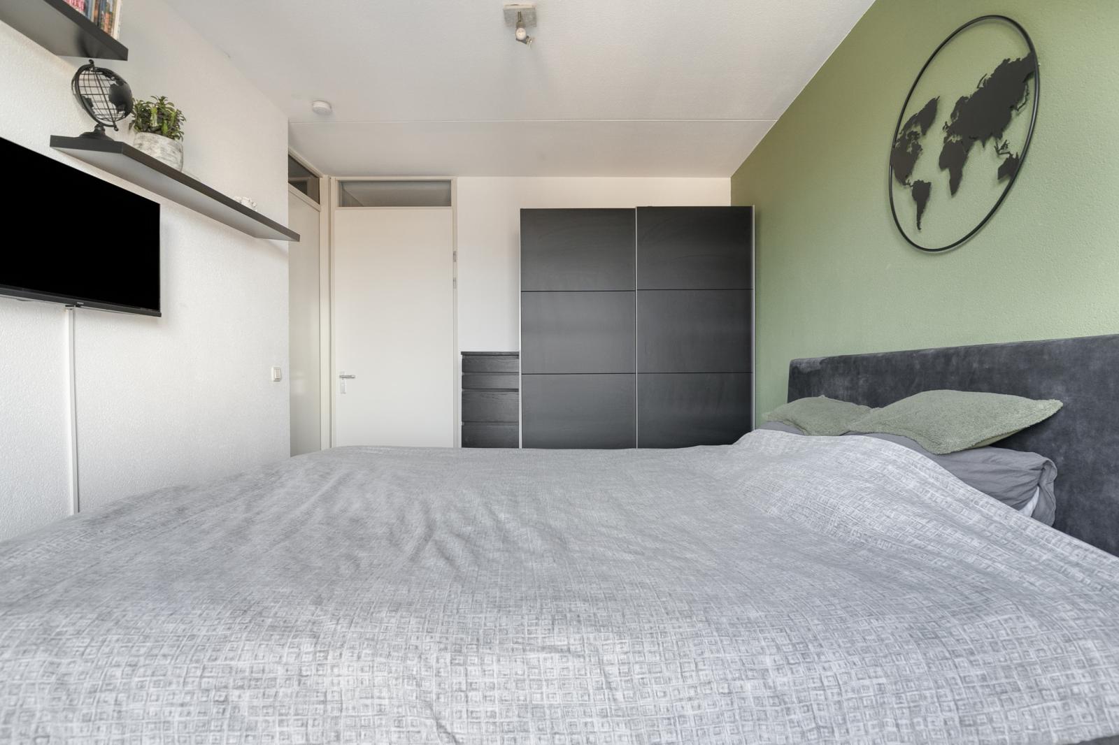 De masterbedroom ligt aan de achterzijde van het appartement en is zowel vanuit de woonkamer als via de badkamer bereikbaar.
