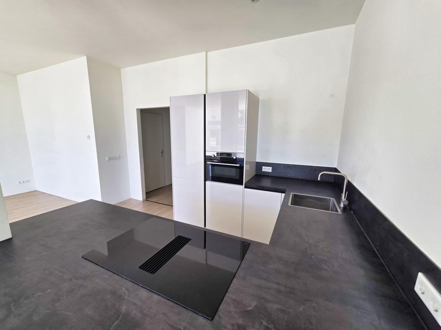 The kitchen has a large window, from where you have a view of the marina, the Arsenal and the green Boulevard. The kitchen is fully equipped: Induction hob with extractor, fridge, freezer and dishwasher.