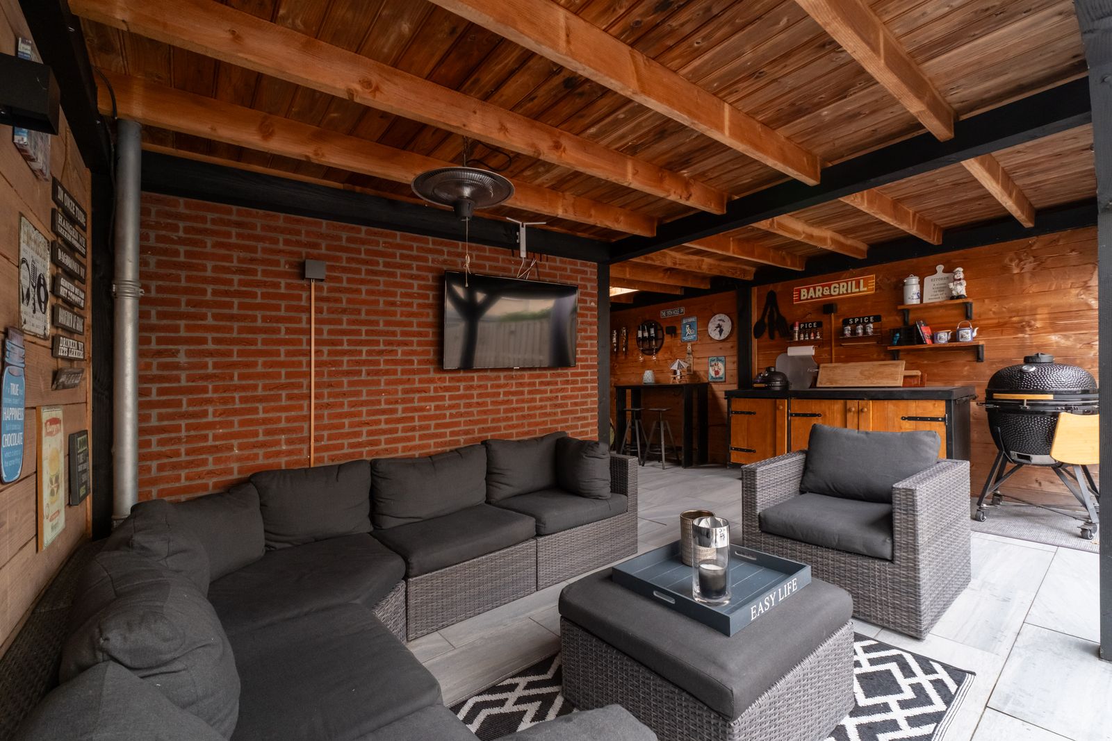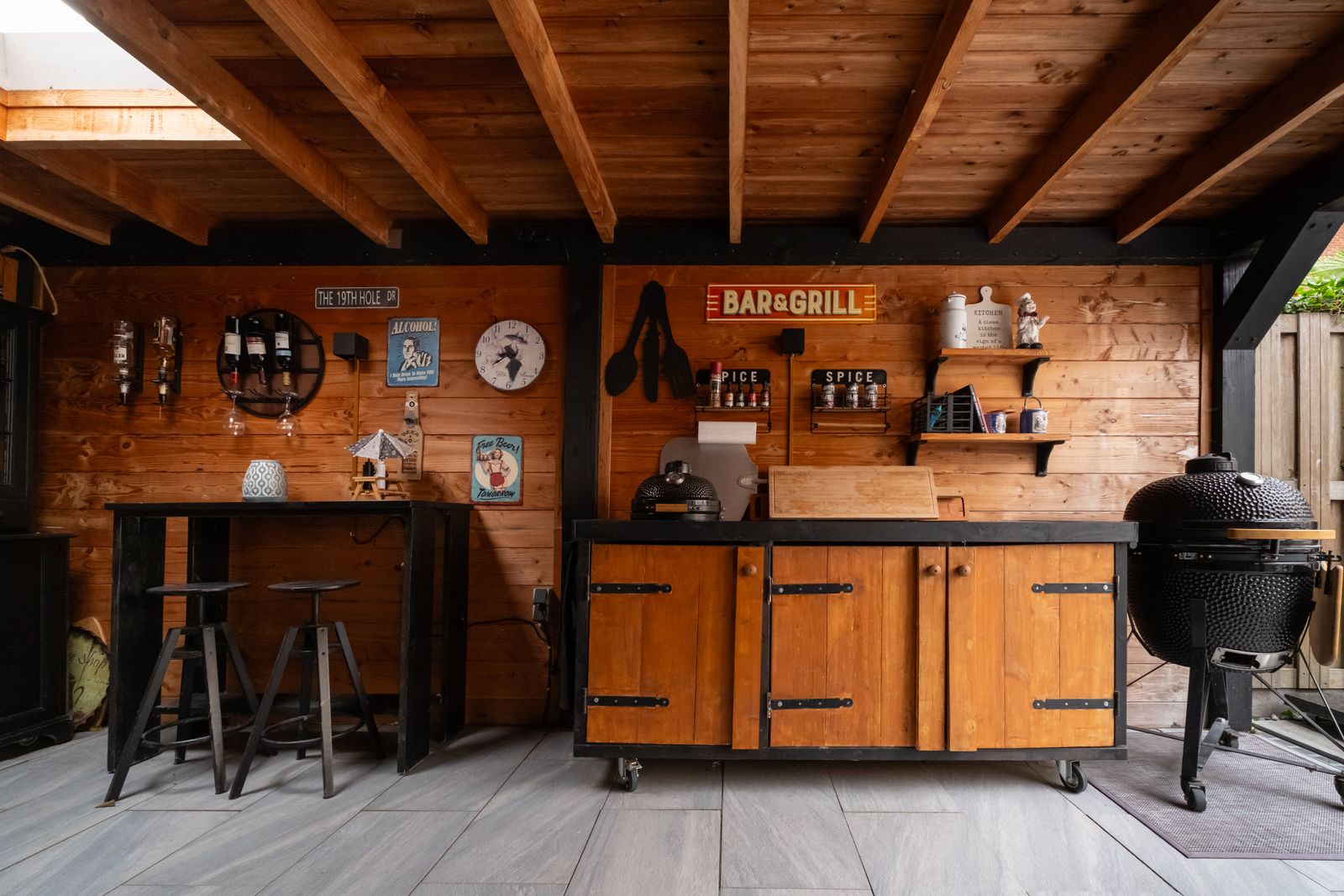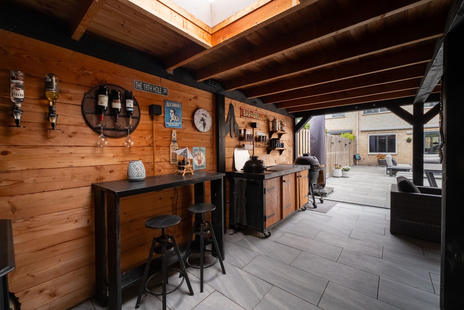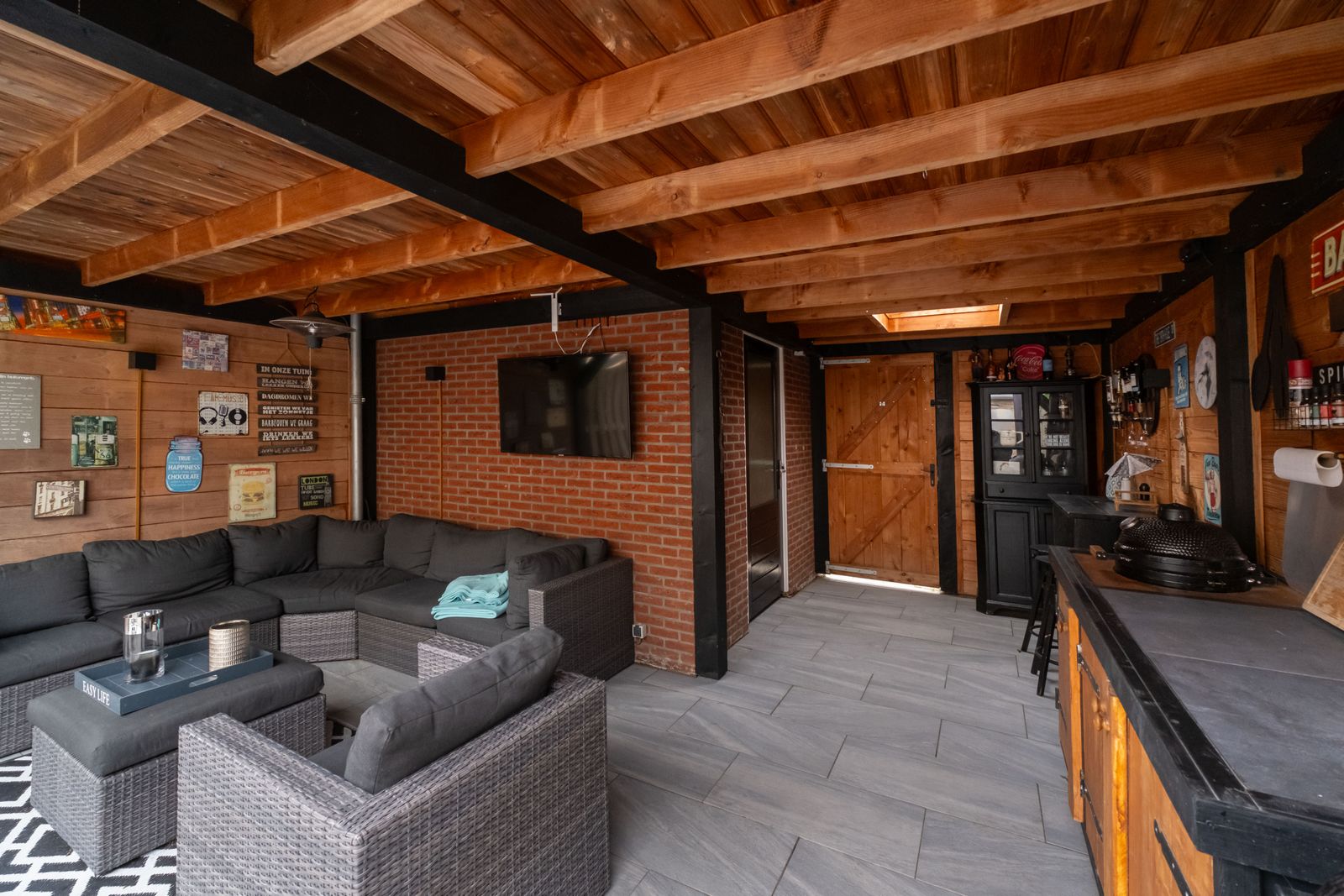 Aan de achterkant van de tuin bevindt zich de (gefundeerde) veranda/tuinkamer welke in een L-vorm om de ruime, van binnen betimmerde berging geplaatst.