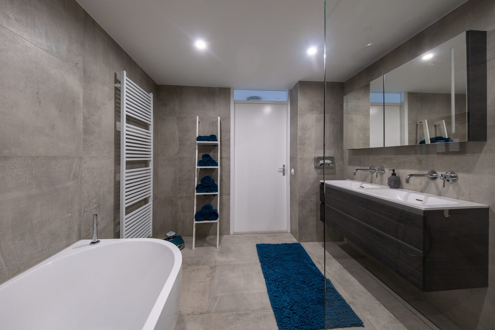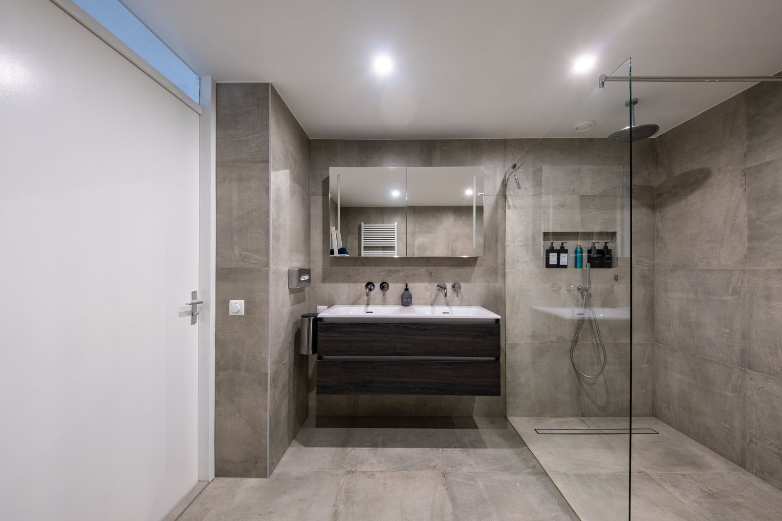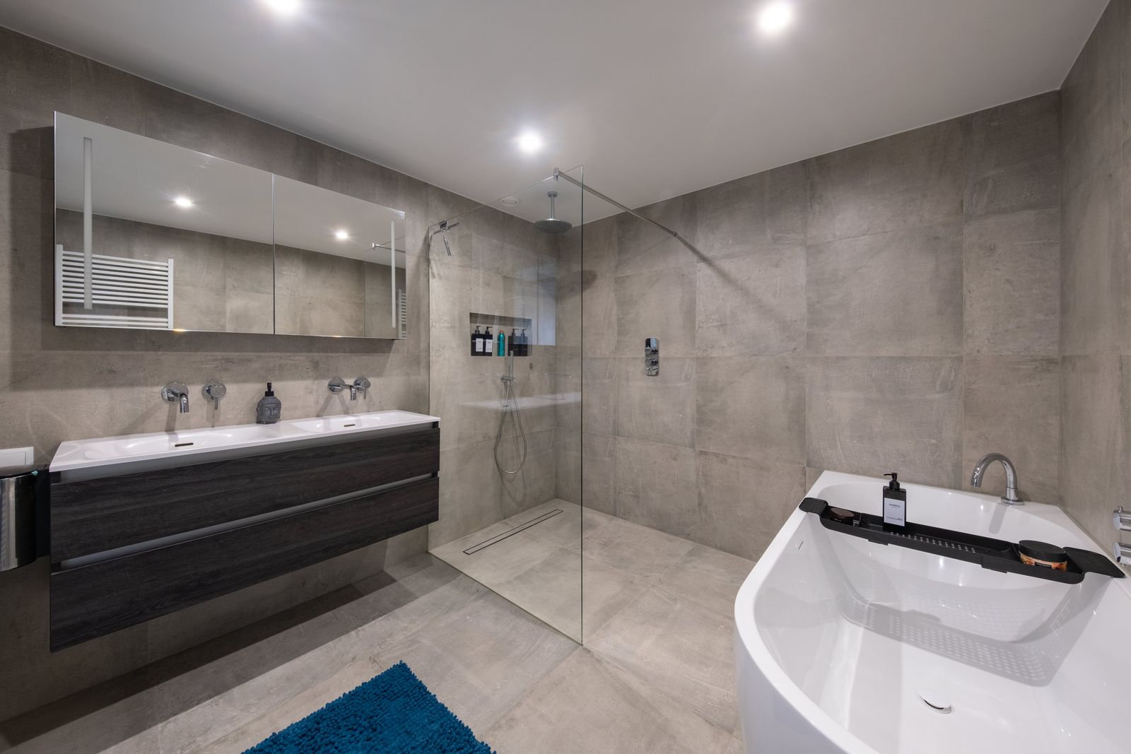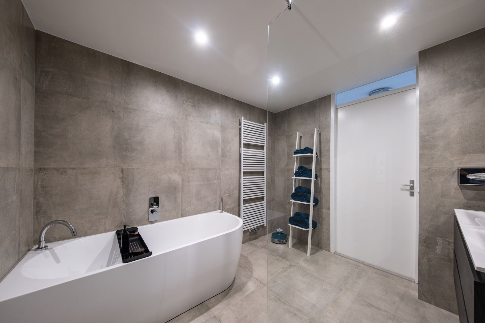 De ruime badkamer van 9 m2 is eind 2024 volledig vernieuwd en bevat een fraai half vrijstaand bad en ruime inloopdouche met regendouche.