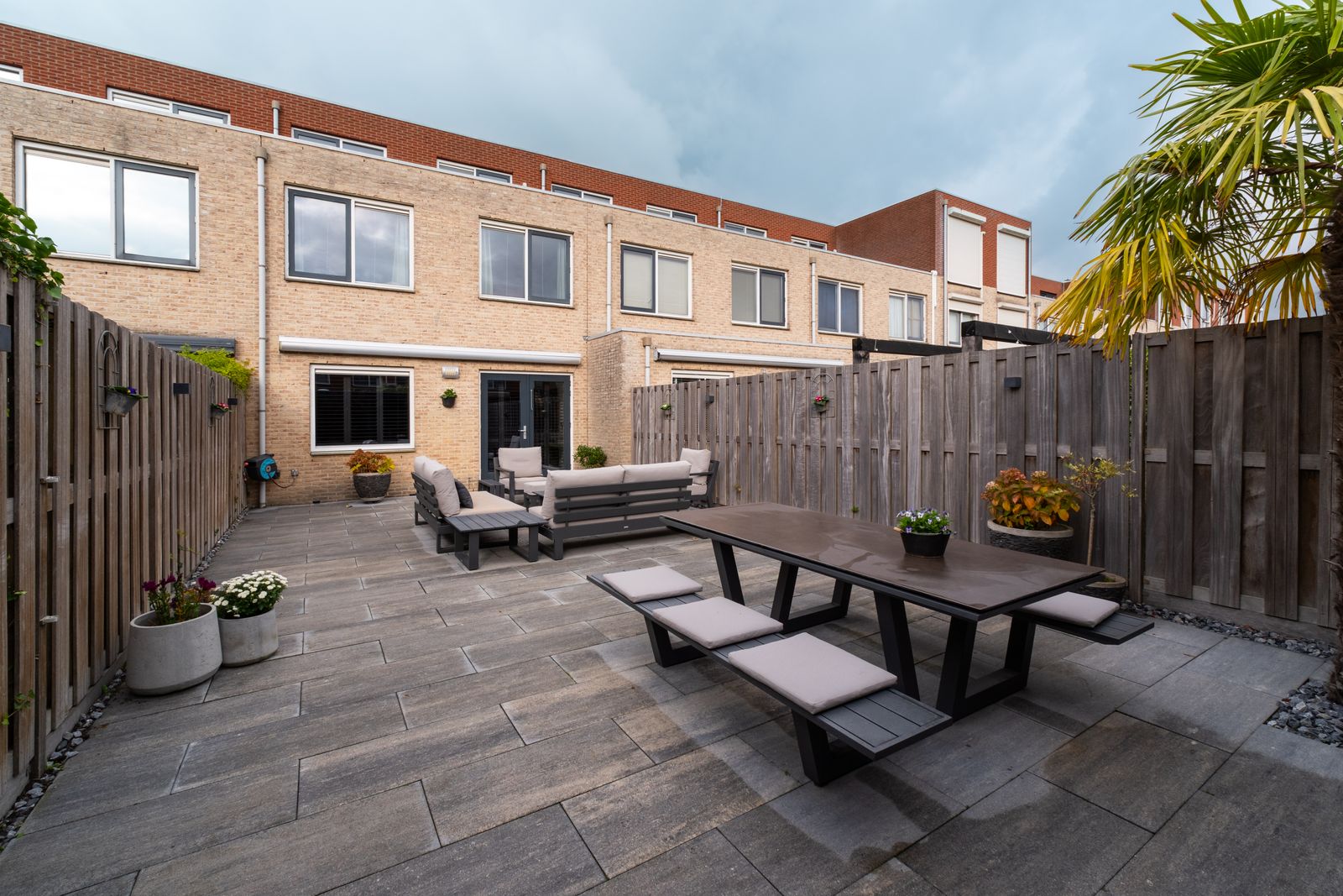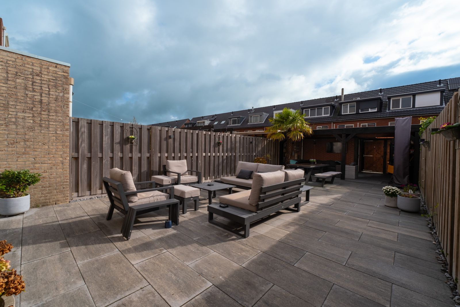 Via de openslaande deuren komt u in de ruim bemeten zonnige tuin van 17 meter lang op het Zuid Oosten.
