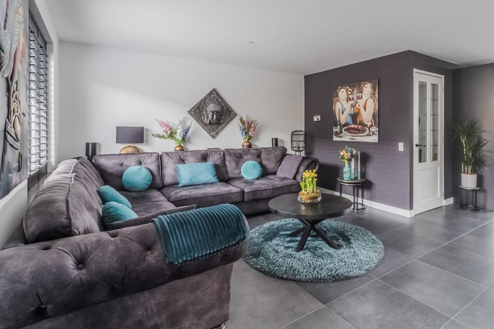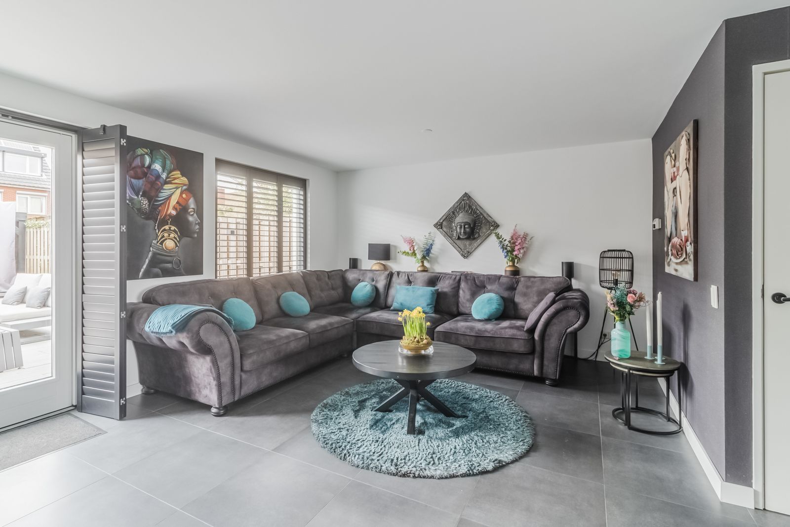 De tuinzijde van de woonkamer is voorzien van een elektrisch bedienbaar zonnescherm met afstandsbediening.