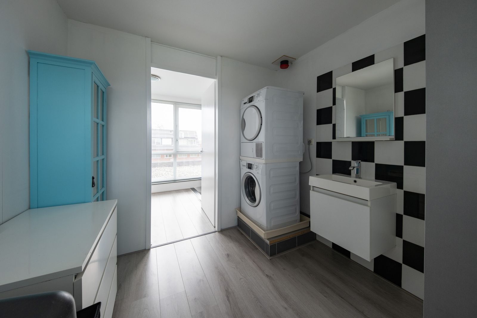Op deze verdieping bevindt zich ook een kamer (7m2) met opstelplaats voor de wasmachine en droger, een aparte wastafel en een ruime kledingkast. Ook deze verdieping is vrij eenvoudig opnieuw in te delen naar meerdere slaapkamers.