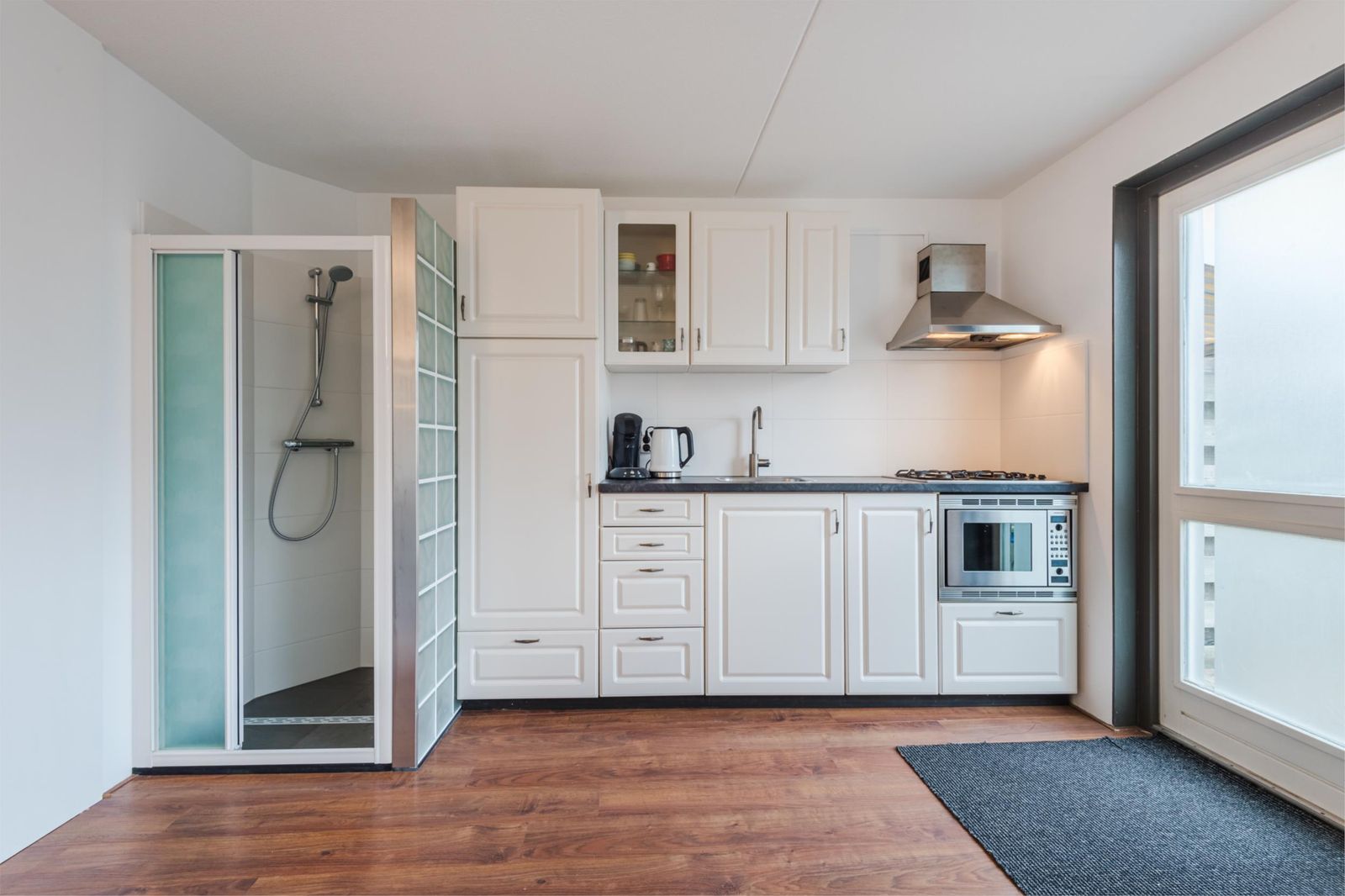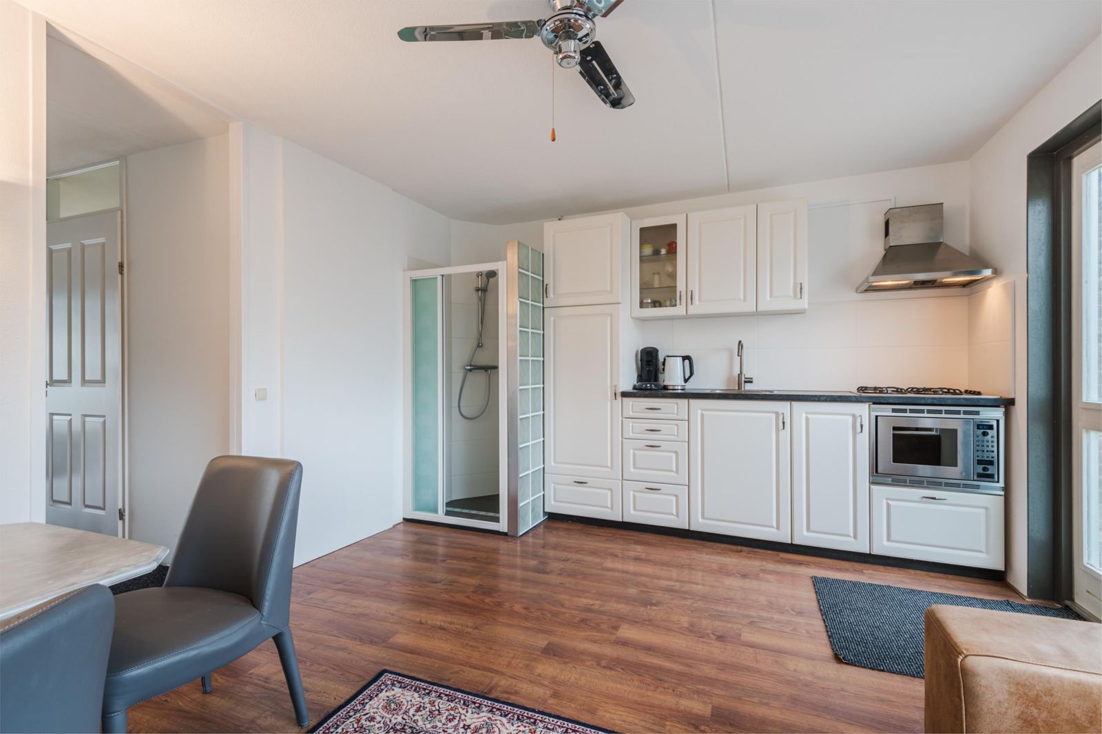 Woonkamer, slaapkamer, keuken, douche en toilet.