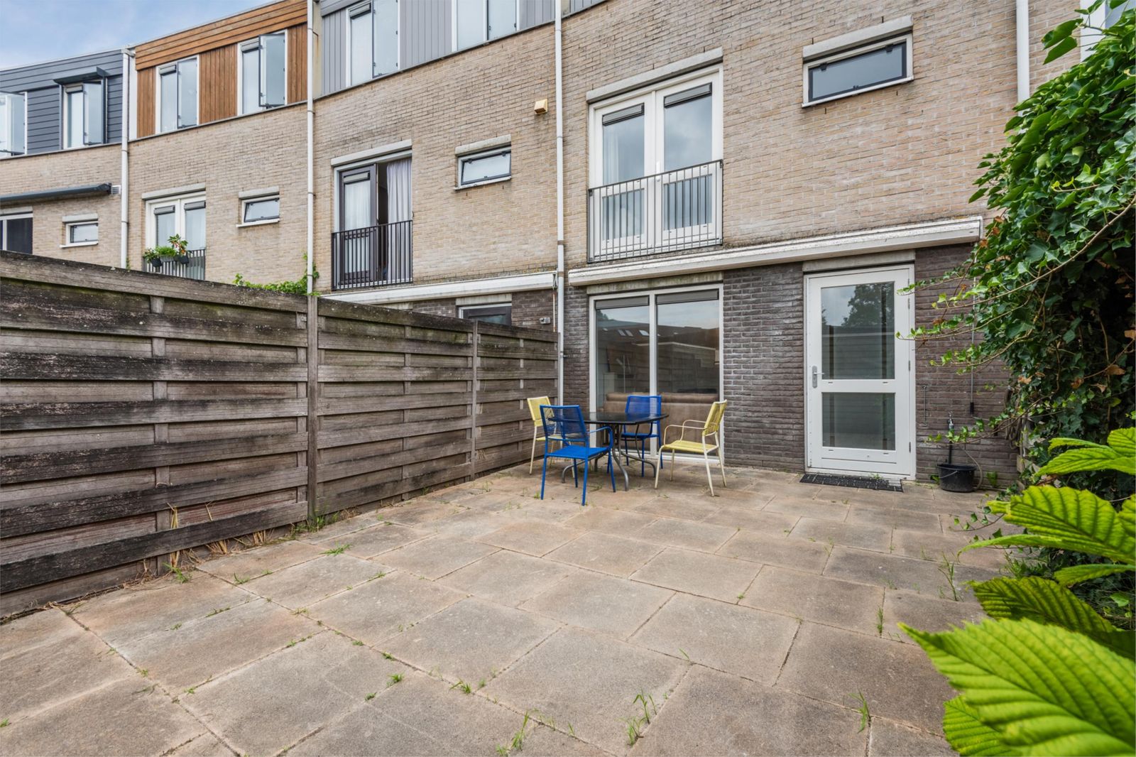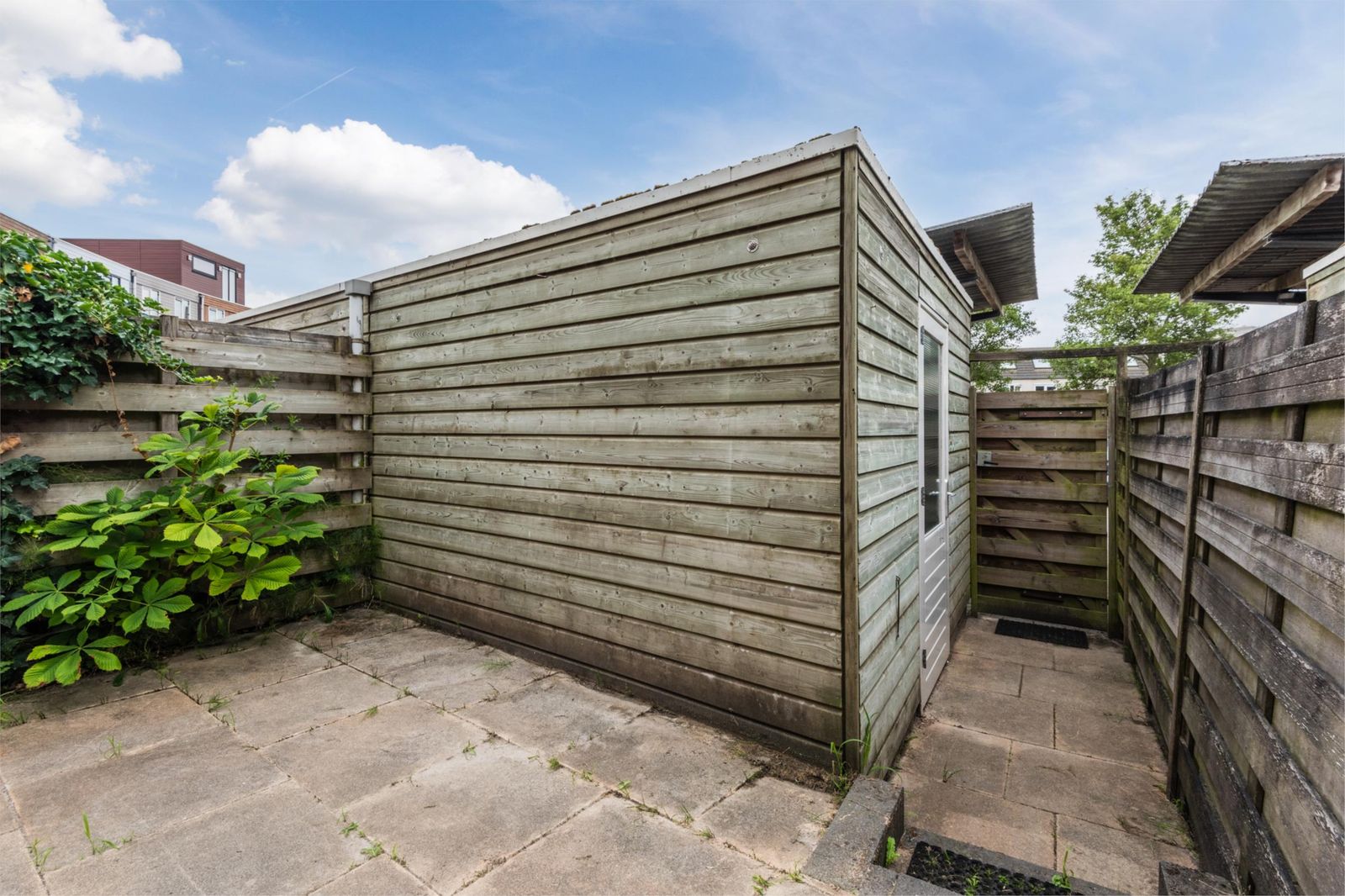 Onderhoudsvrije achtertuin gericht op het Zuiden. Er is een zonnescherm aanwezig over de gehele breedte van de woning. Achter de tuin bevindt zich een houten berging van circa 6 mr.